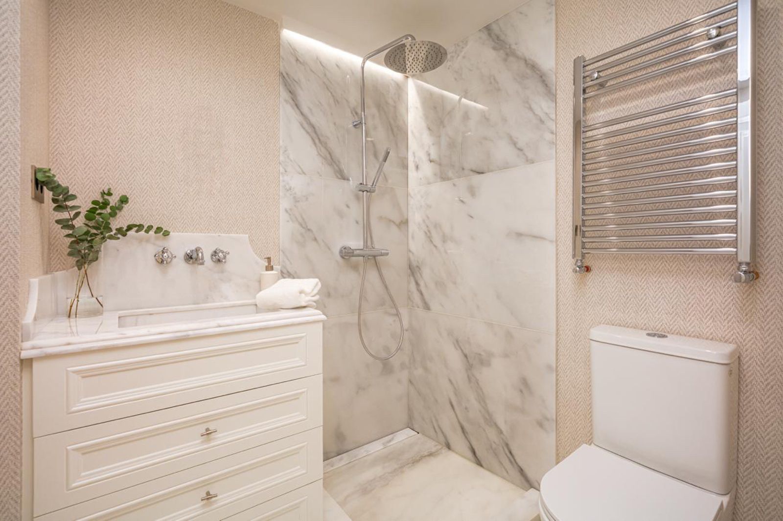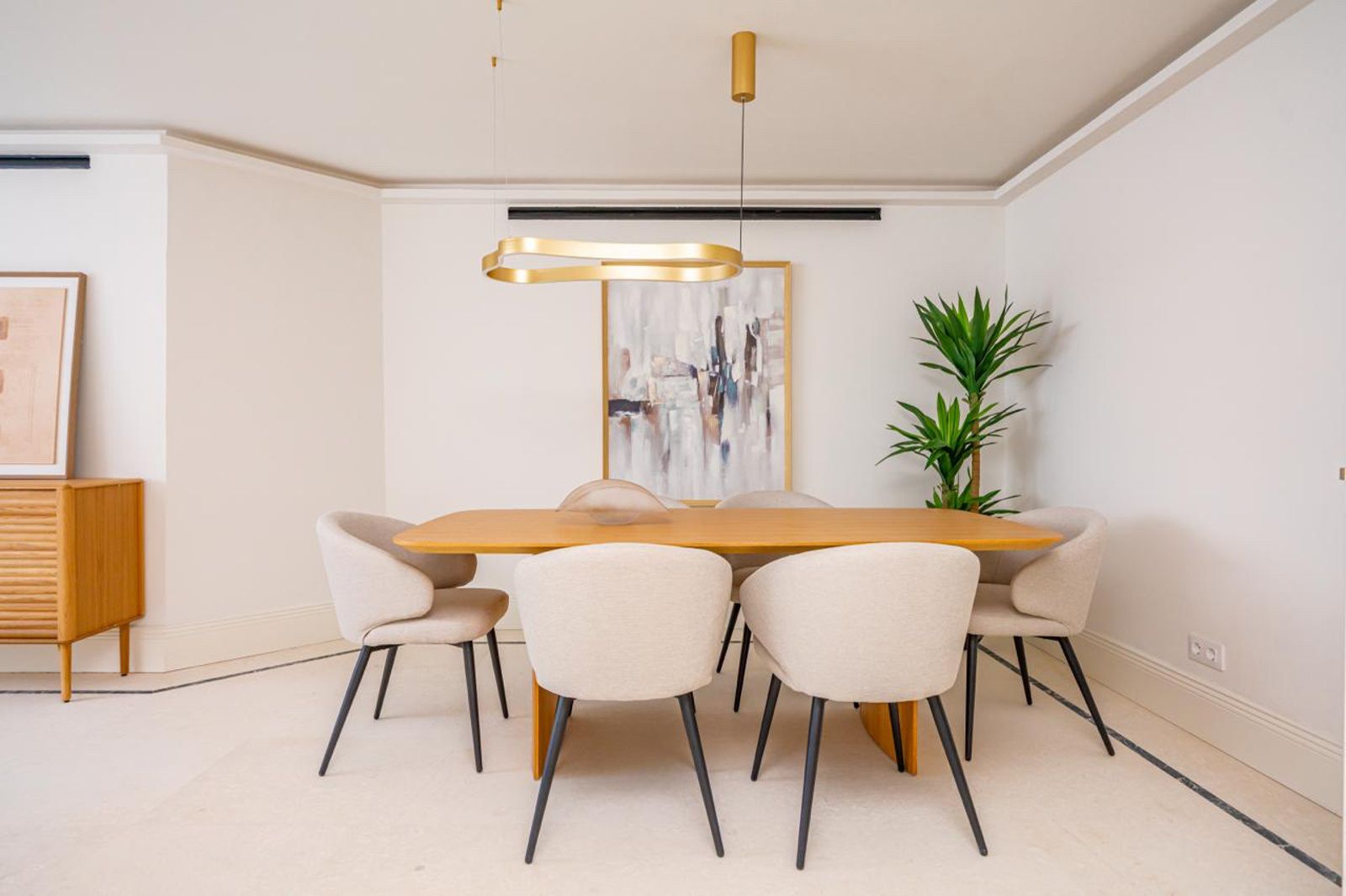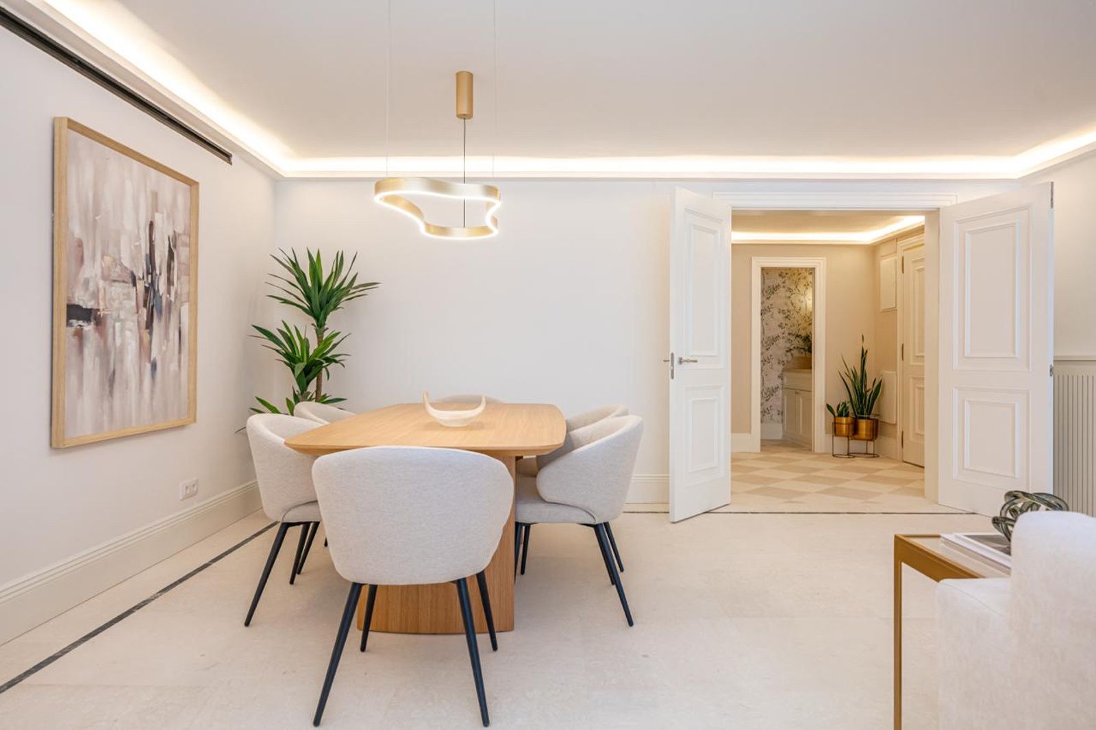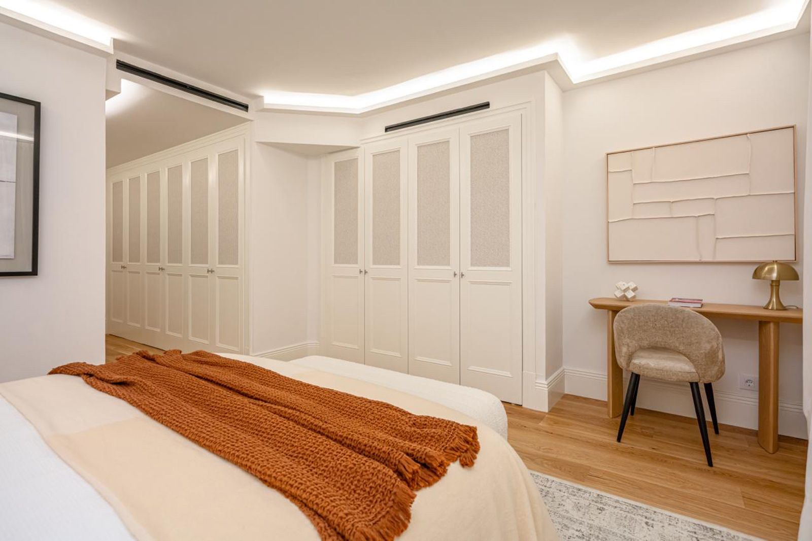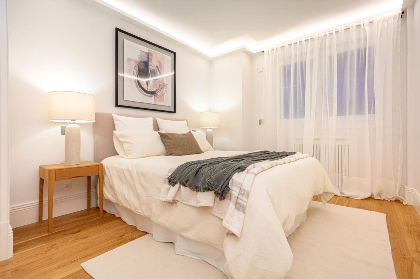 Su ubicación estratégica permite un acceso ágil al resto de la ciudad, gracias a diversas líneas de metro, autobuses y su proximidad al eje del Paseo de la Castellana. La vivienda dispone de un amplio salón y un comedor contiguo, ambos bañados por luz natural y cuidadosamente separados del resto de estancias, generando espacios definidos y confortables. La cocina, cerrada y completamente equipada, presenta un diseño funcional, ideal para quienes valoran la independencia entre las áreas sociales y de servicio. Cuenta con tres dormitorios en suite y un aseo de cortesía, lo que garantiza máxima comodidad y privacidad. La distribución está cuidadosamente pensada, con una clara separación entre las zonas sociales y privadas, ofreciendo equilibrio y confort en cada rincón.