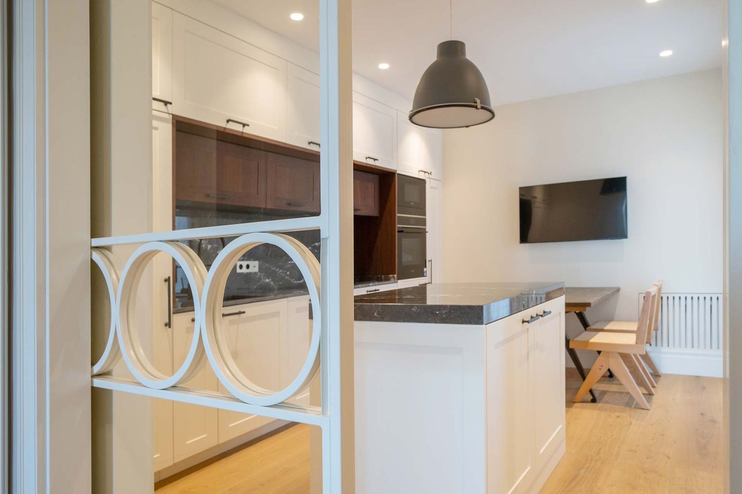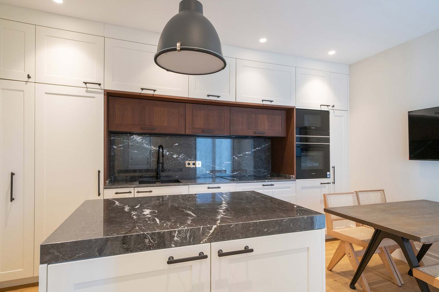 La cocina, con isla central y office, está totalmente equipada con electrodomésticos Siemens IQ700 y se comunica con el comedor mediante una puerta corredera acristalada de forja a medida.