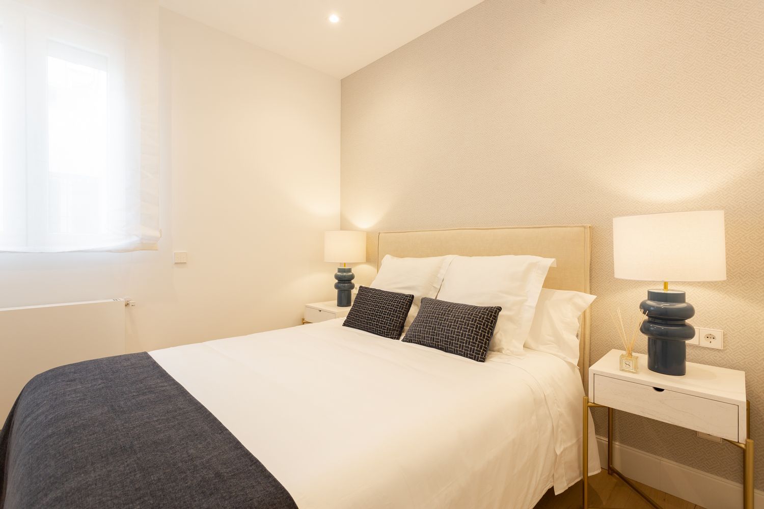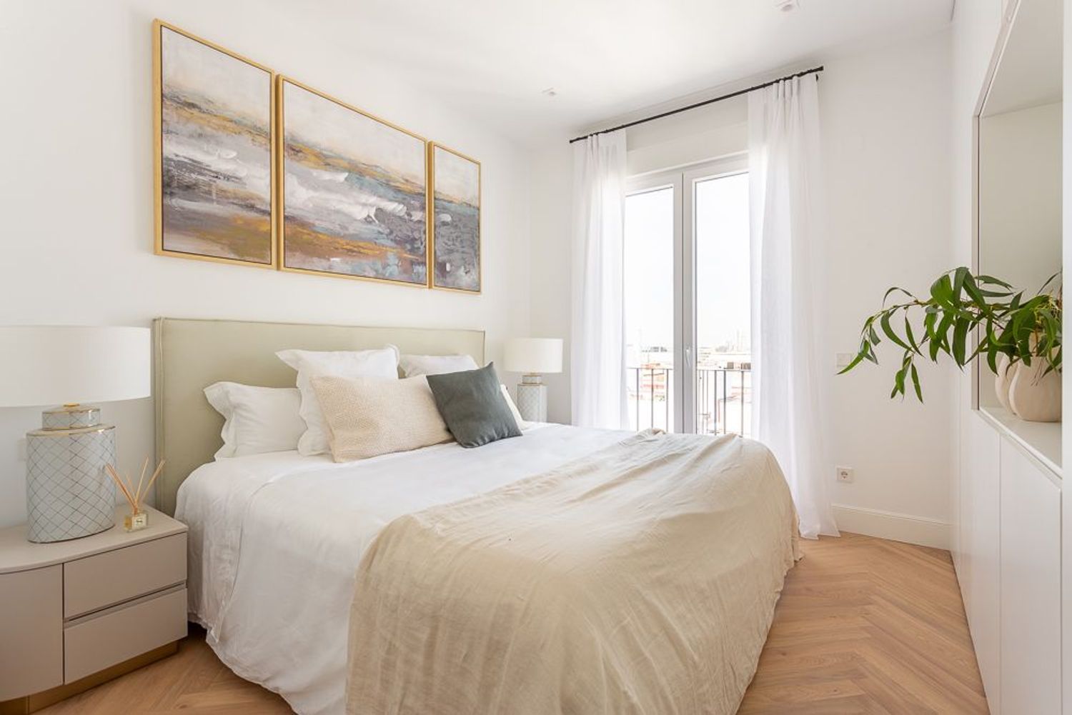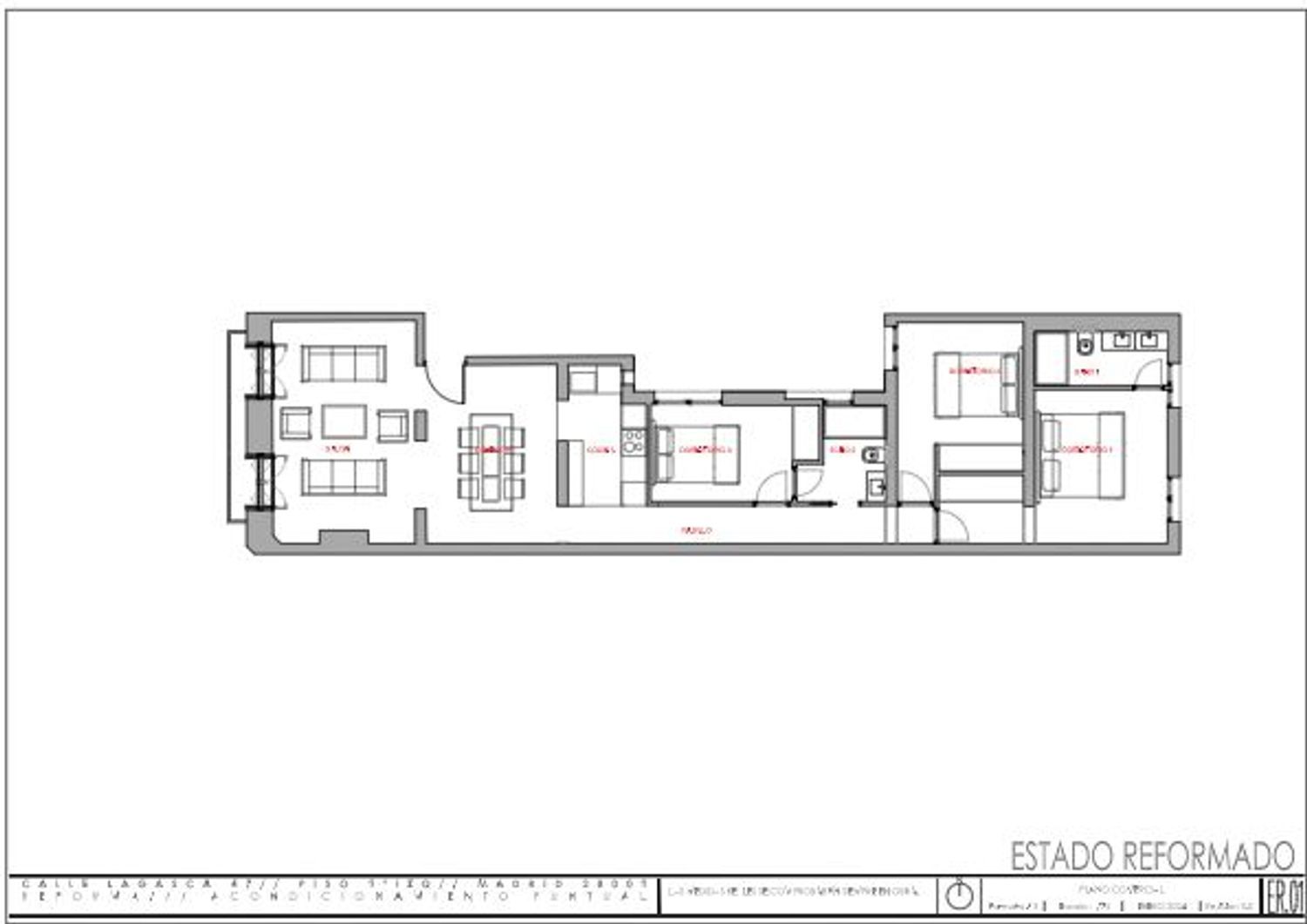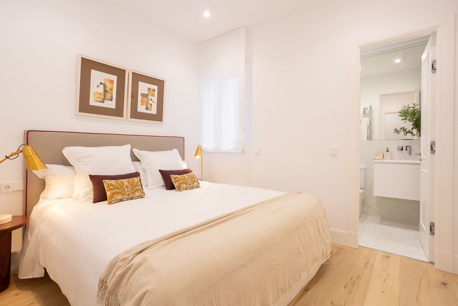 La vivienda, ubicada en una primera planta con orientación este, contará con un luminoso salón-comedor con dos balcones amplios que se abren directamente sobre la calle Lagasca, permitiendo la entrada de luz natural durante toda la mañana. La cocina será independiente y funcional, mientras que la zona de descanso incluirá tres dormitorios, dos baños completos —uno de ellos en suite en el dormitorio principal—, y armarios empotrados forrados y vestidos en todas las habitaciones.