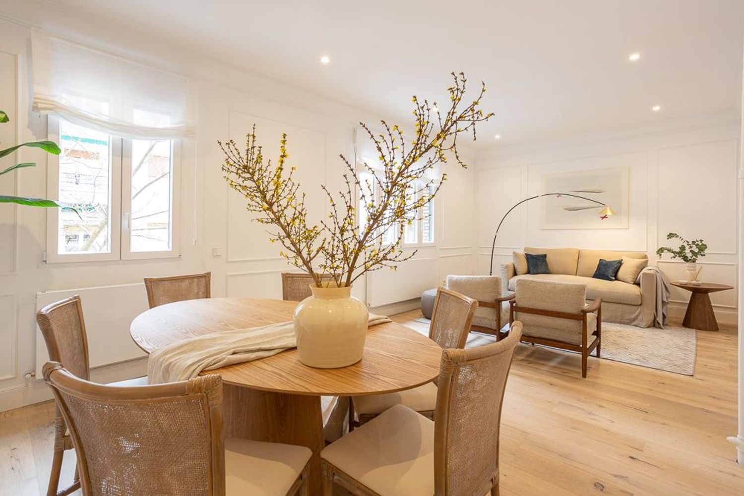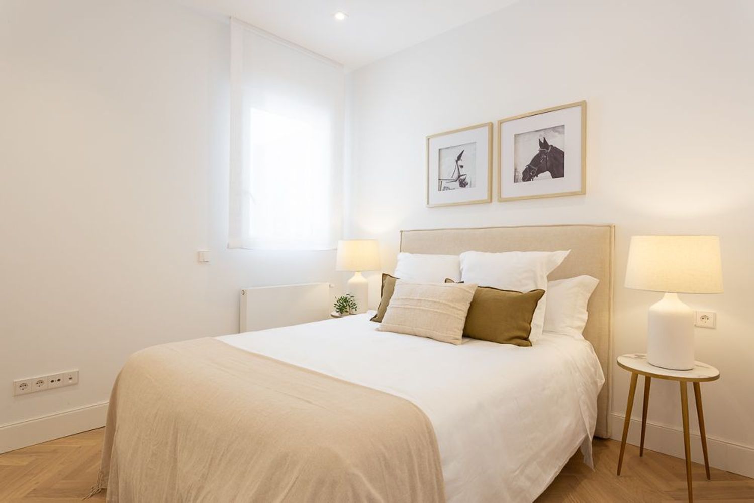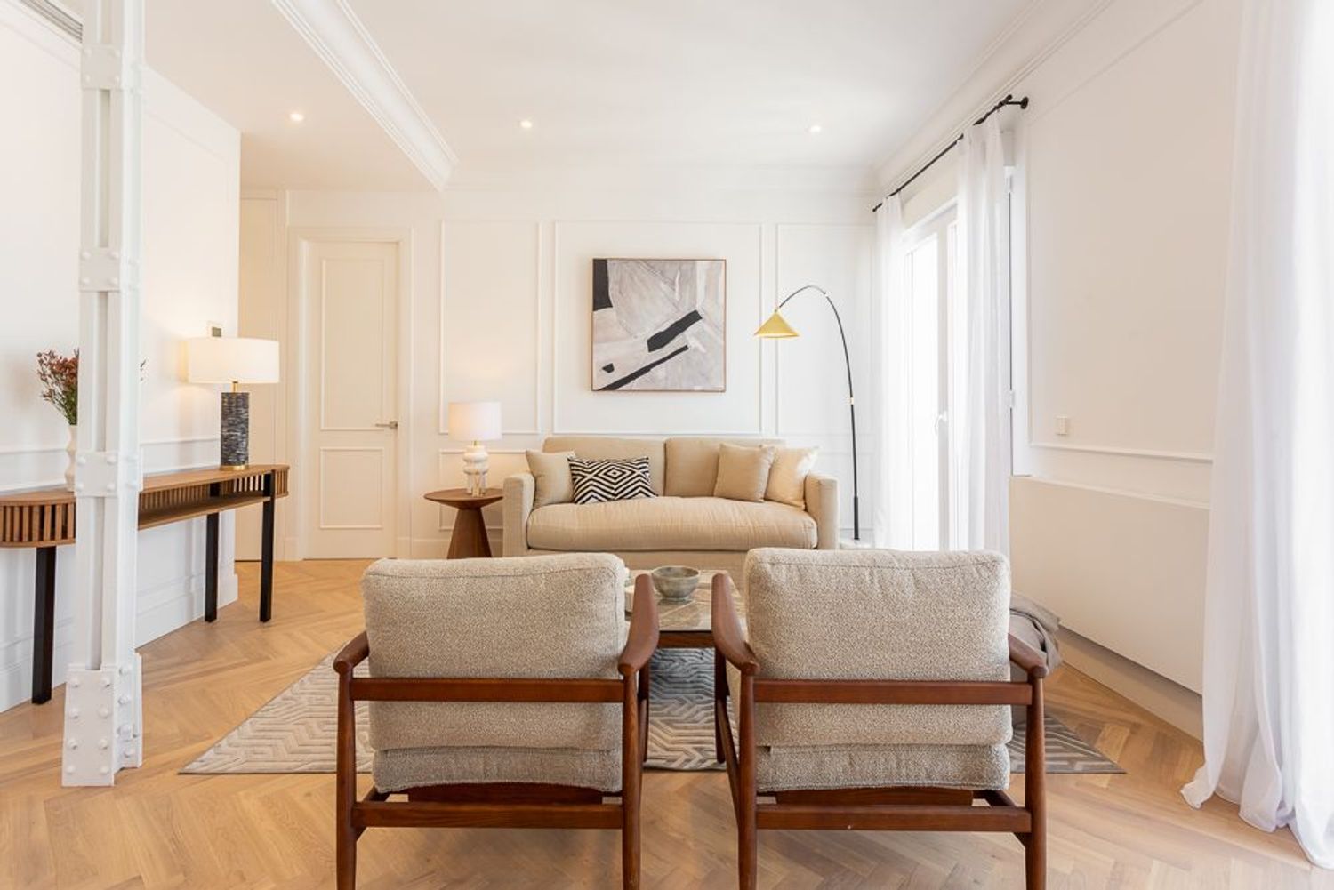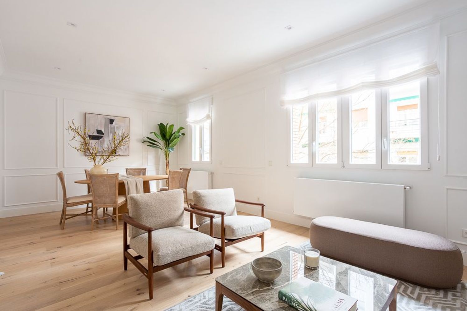 La vivienda, ubicada en una primera planta con orientación este, contará con un luminoso salón-comedor con dos balcones amplios que se abren directamente sobre la calle Lagasca, permitiendo la entrada de luz natural durante toda la mañana. La cocina será independiente y funcional, mientras que la zona de descanso incluirá tres dormitorios, dos baños completos —uno de ellos en suite en el dormitorio principal—, y armarios empotrados forrados y vestidos en todas las habitaciones.