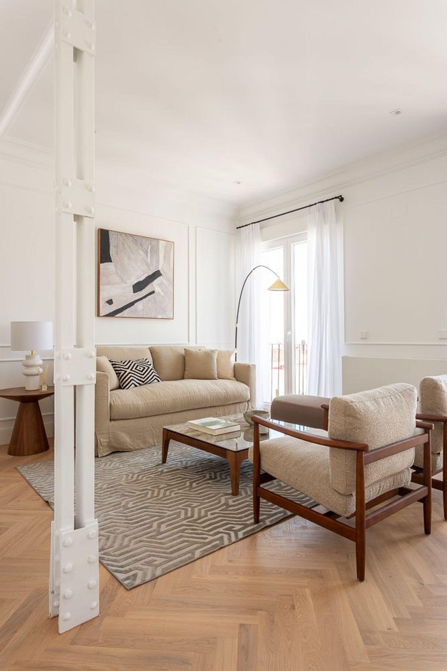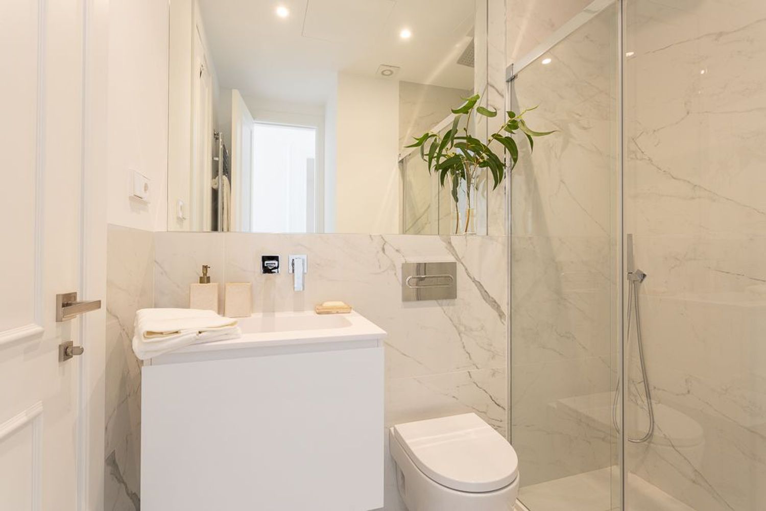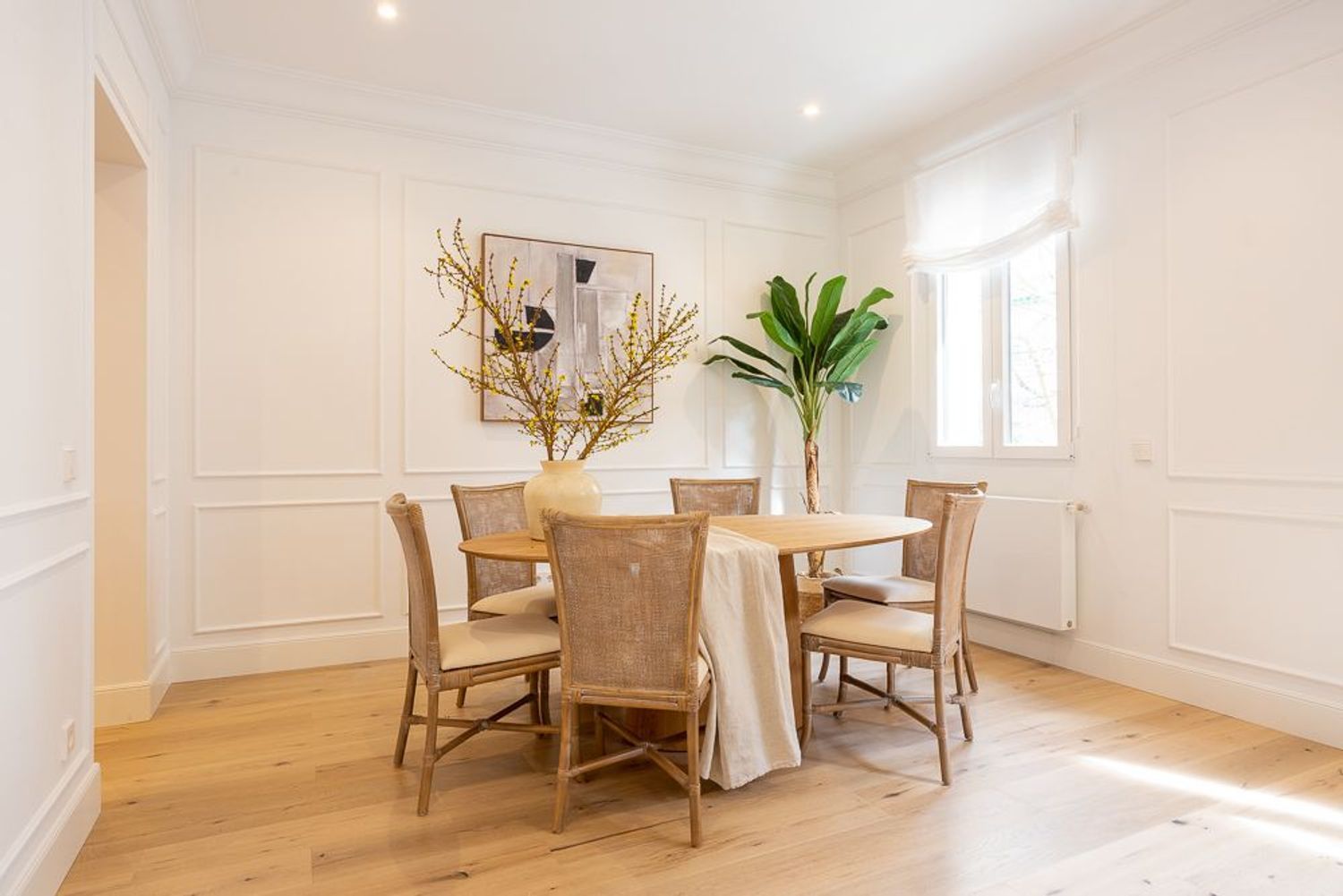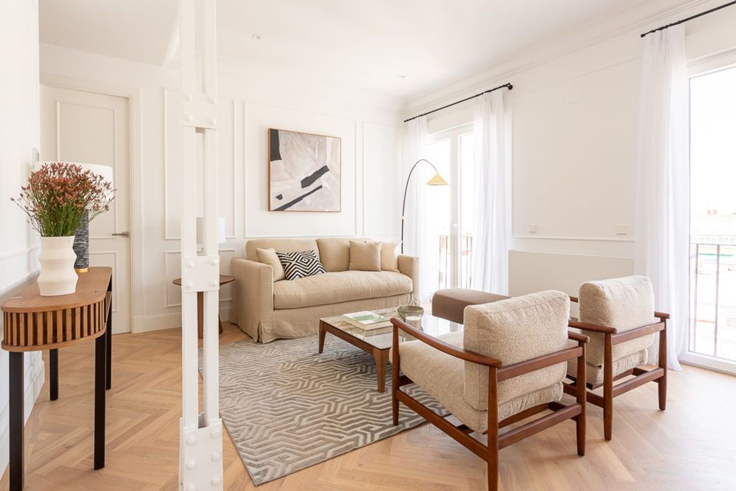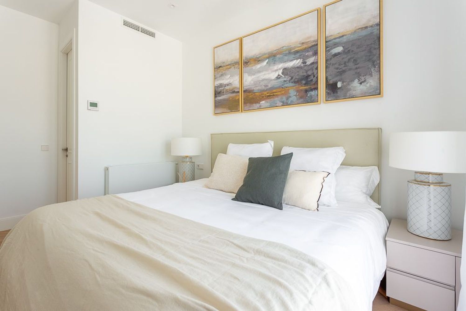 La vivienda, ubicada en una primera planta con orientación este, contará con un luminoso salón-comedor con dos balcones amplios que se abren directamente sobre la calle Lagasca, permitiendo la entrada de luz natural durante toda la mañana. La cocina será independiente y funcional, mientras que la zona de descanso incluirá tres dormitorios, dos baños completos —uno de ellos en suite en el dormitorio principal—, y armarios empotrados forrados y vestidos en todas las habitaciones.