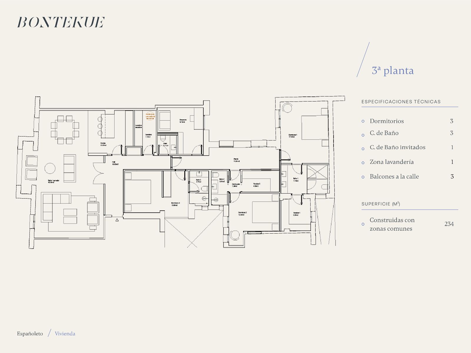 La cocina, una pieza de diseño semi-independiente mediante una sofisticada cerrajería acristalada, se complementa con una zona de lavandería funcional. La zona privada ofrece el máximo confort con 3 amplios dormitorios en suite, un elegante despacho para el trabajo en casa y un aseo de cortesía para invitados. Un refugio de modernidad en el barrio más aristocrático de Madrid.
