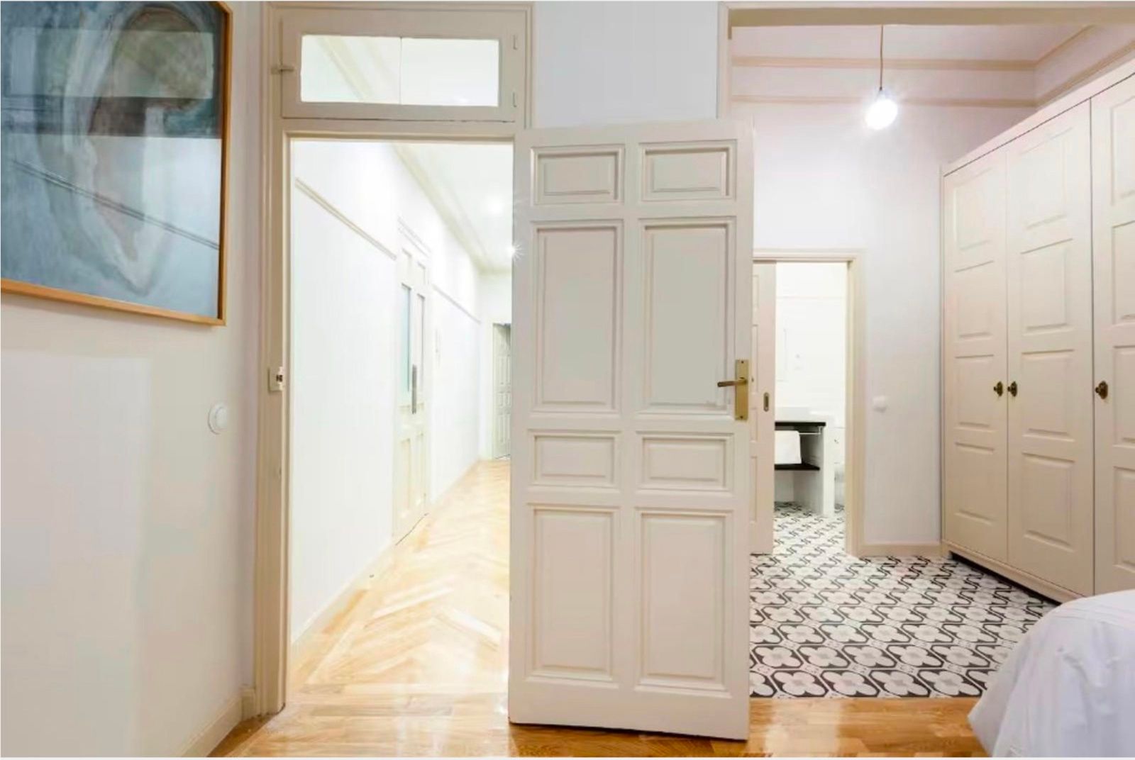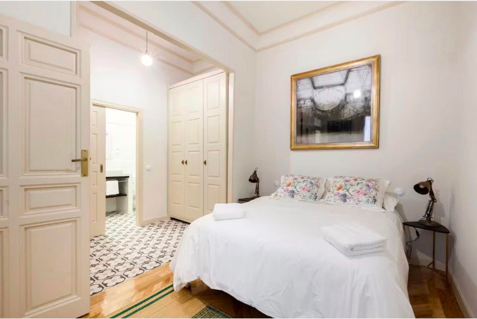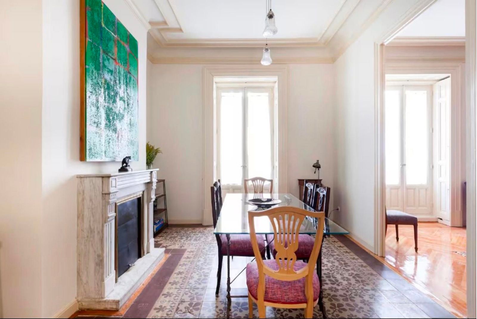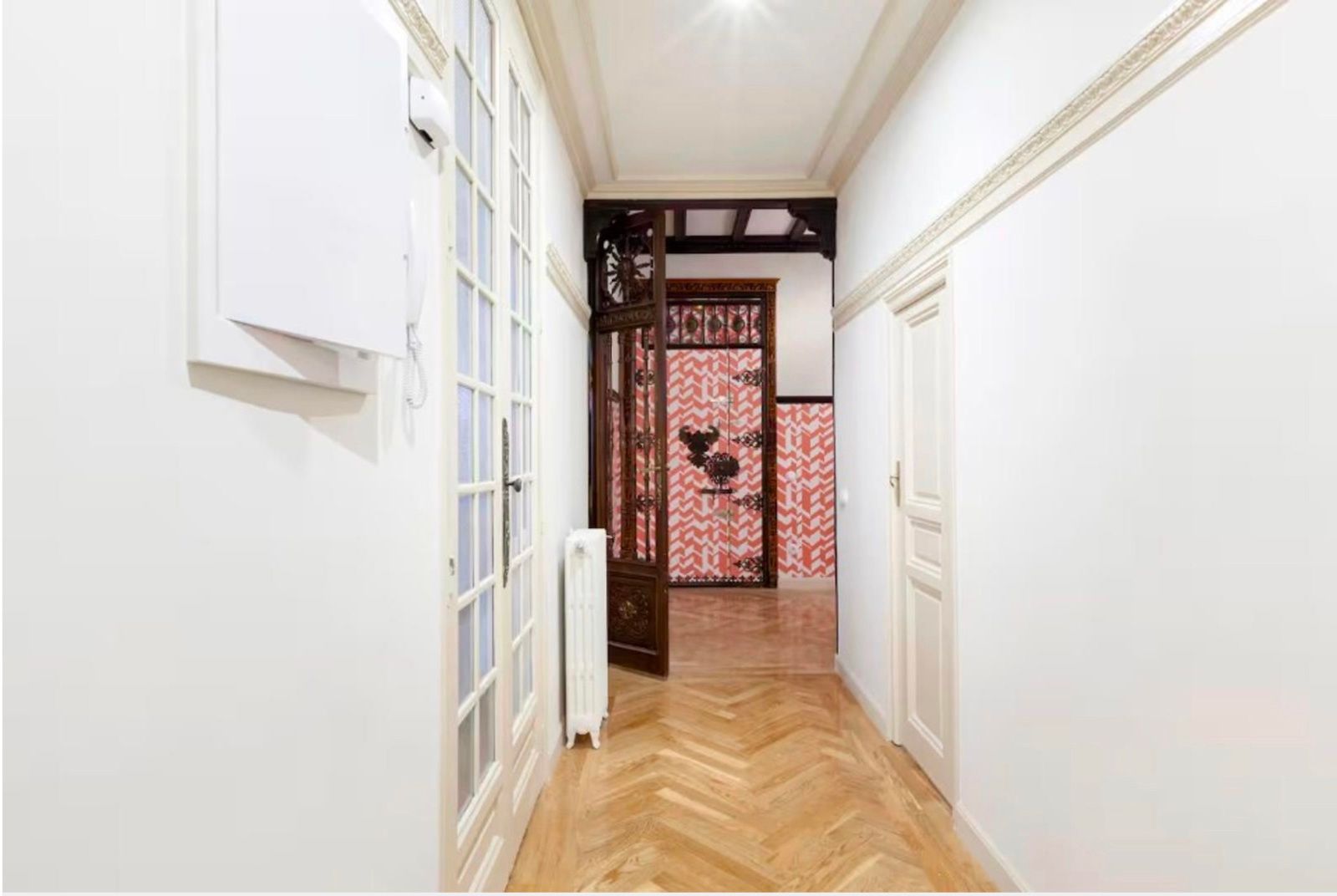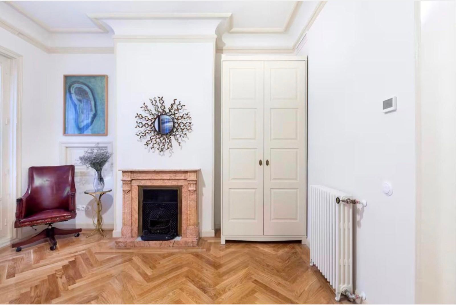La vivienda conserva su carácter original gracias a sus techos de más de tres metros, molduras, contraventanas y puertas antiguas, a lo que se suman cuatro balcones a la calle que aportan luminosidad y encanto. La reforma se realizó en 2017 y el inmueble se distribuye en un gran recibidor que da paso a una amplia zona social con dos salones y un comedor integrado a la cocina, pensados para disfrutar de espacios abiertos y acogedores. La zona de noche cuenta con seis dormitorios, todos ellos con baño en suite, ofreciendo comodidad e independencia. Además, dispone de aire acondicionado por conductos, calefacción central y un trastero en la finca.