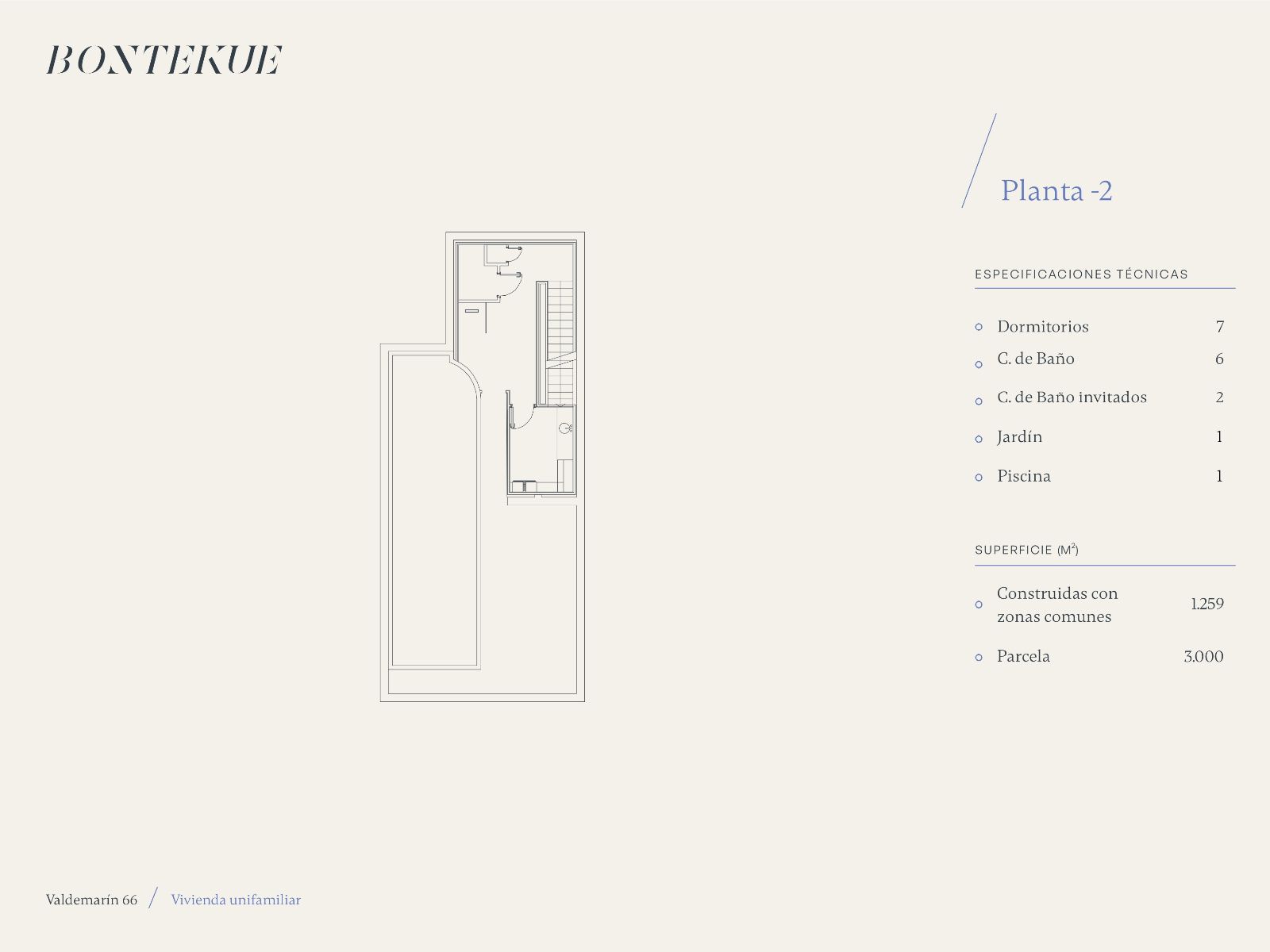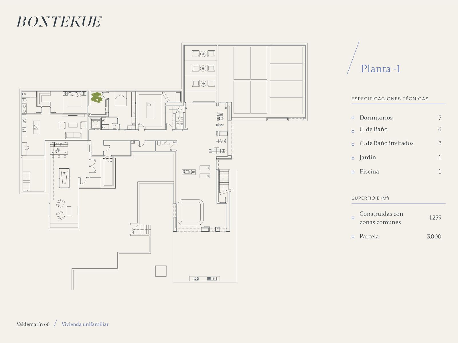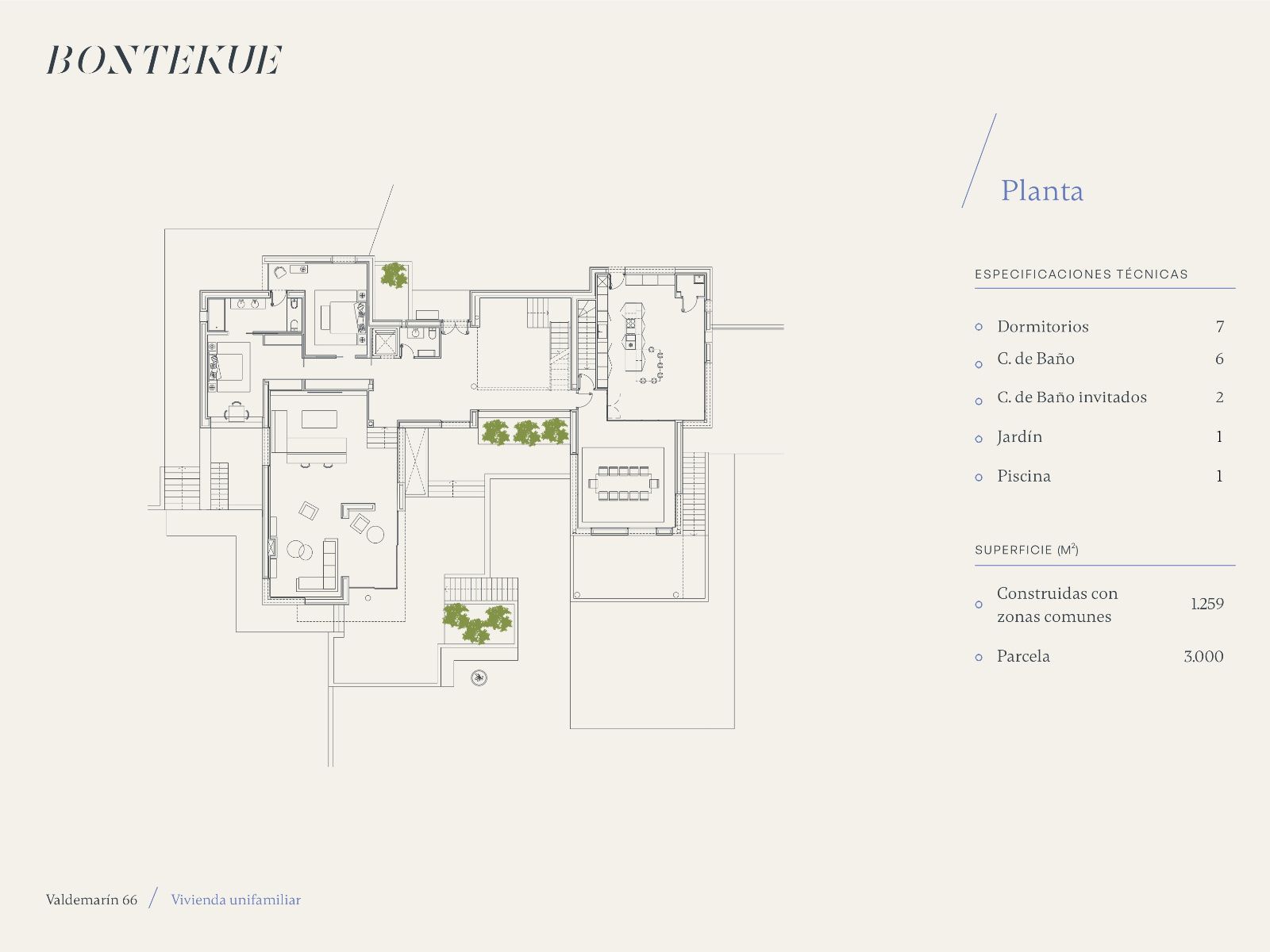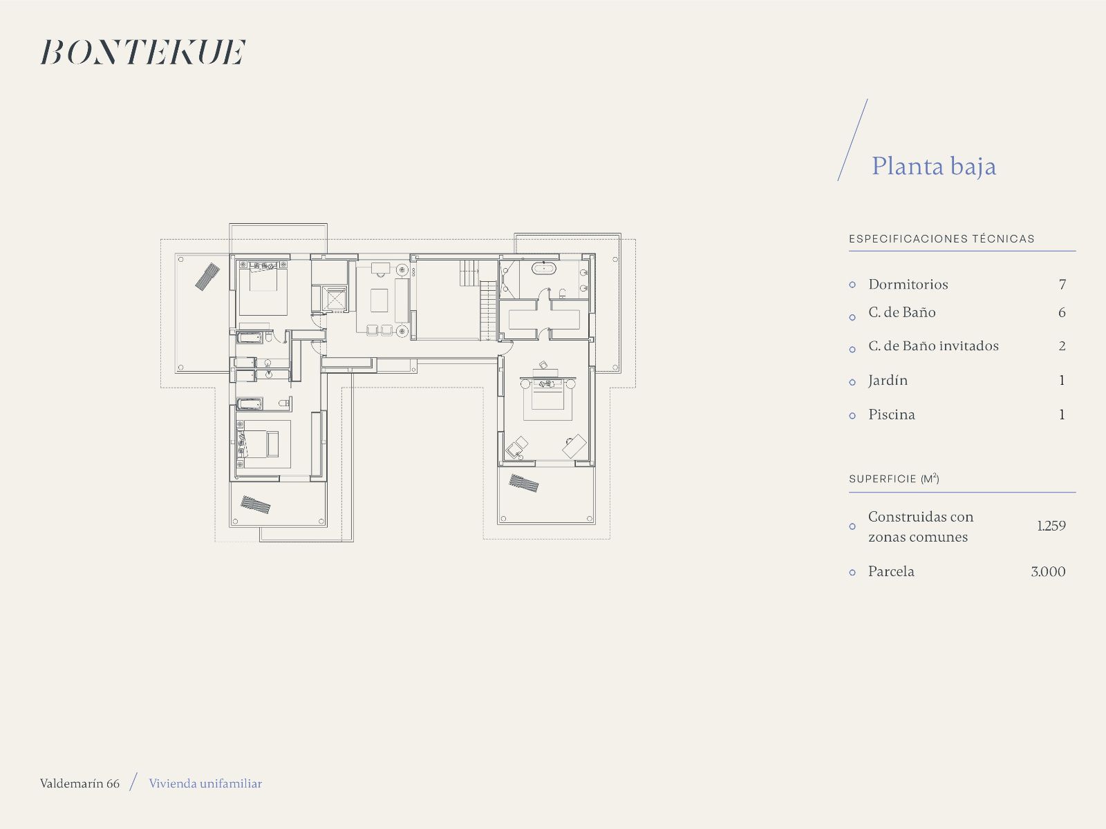 Con 1.259 m² construidos, la vivienda destaca por su arquitectura de espacios abiertos y luz natural. La distribución está orientada a la funcionalidad y el confort, conectando las estancias principales con el jardín y las áreas exteriores.