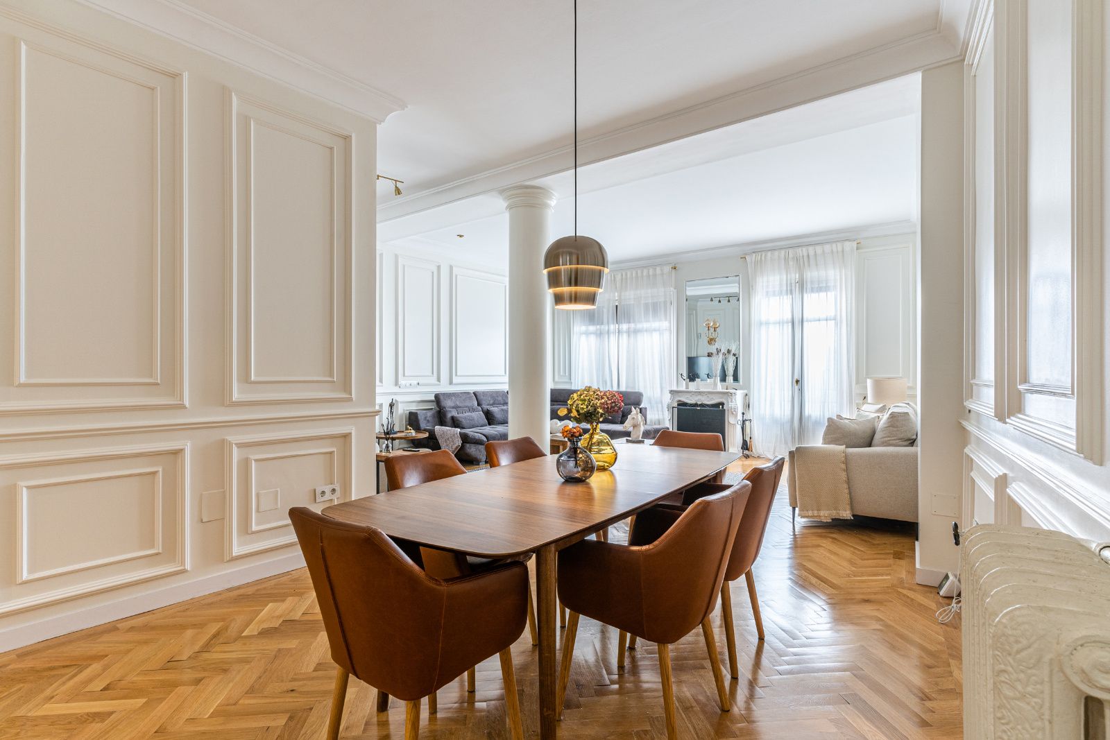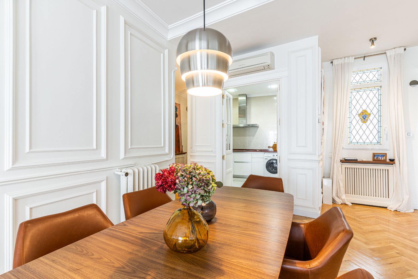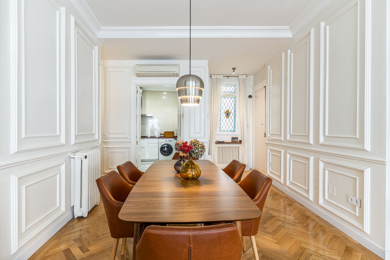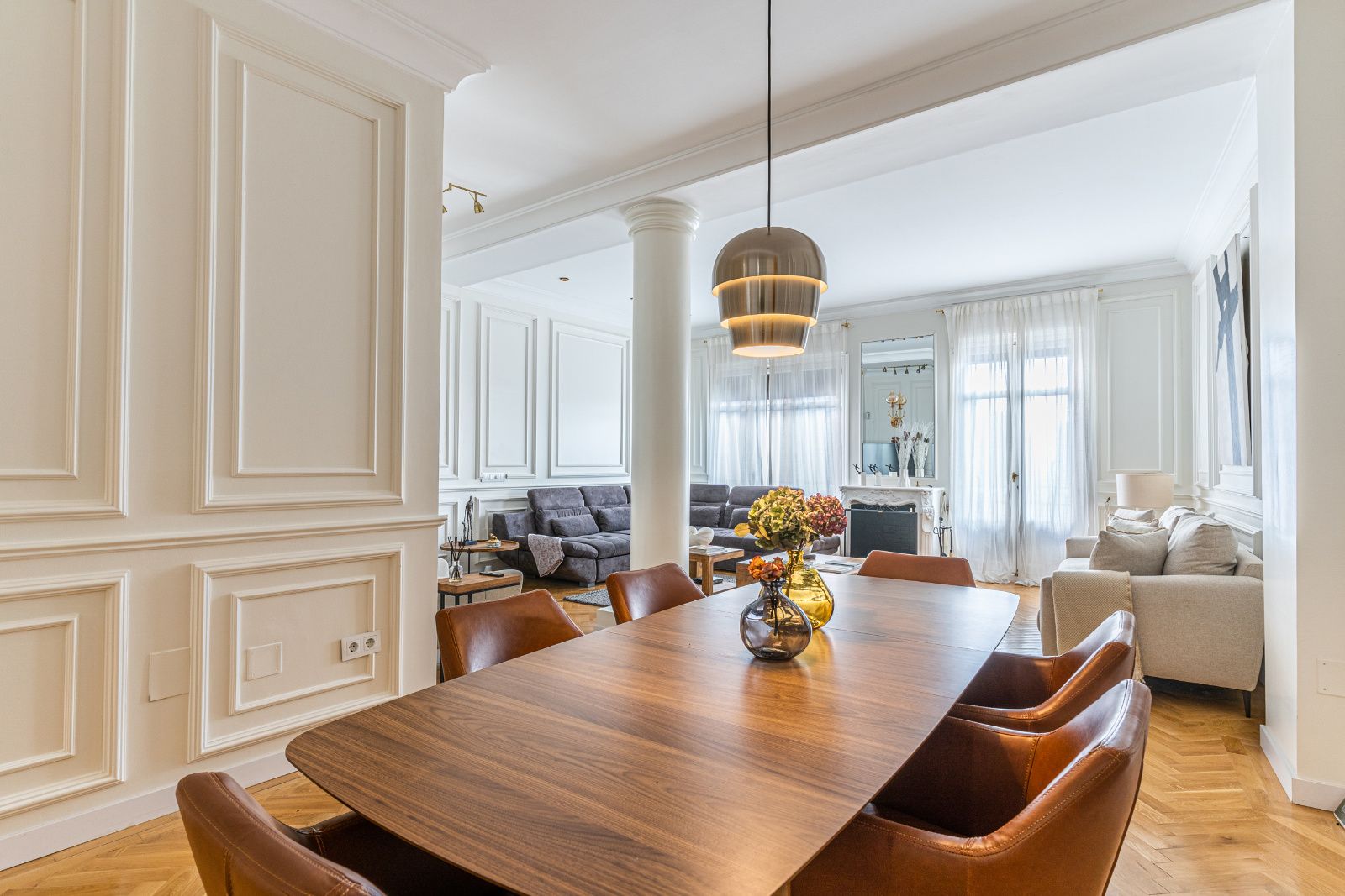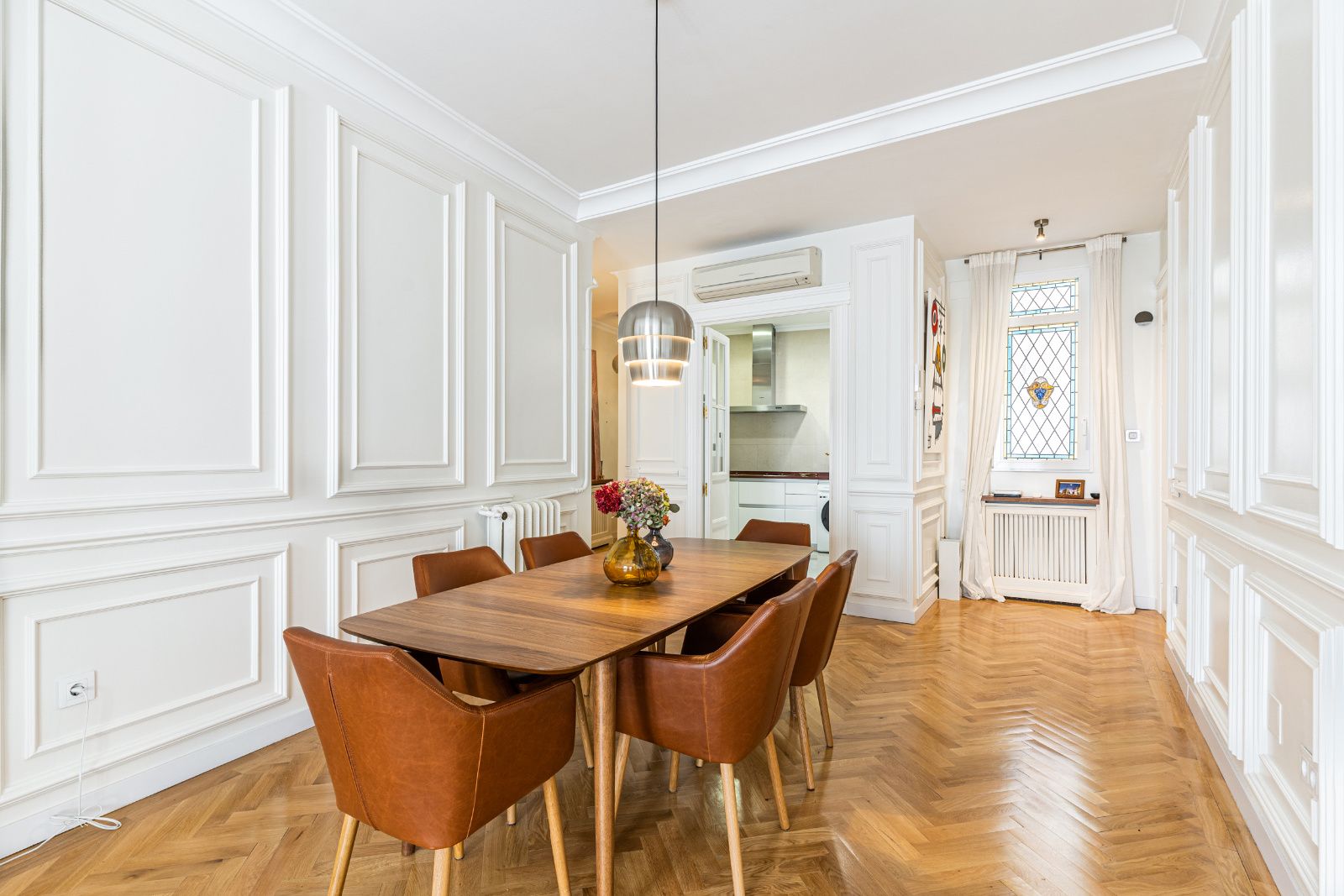 Los techos altos con molduras originales y la chimenea del salón evocan un elegante aire señorial, mientras que los acabados actuales crean un ambiente armónico, funcional y refinado. El amplio salón, inundado de luz natural gracias a sus grandes ventanales exteriores, se convierte en el verdadero protagonista del espacio, ideal tanto para el descanso como para recibir invitados. La vivienda cuenta además con un comedor independiente con capacidad para seis comensales, perfecto para reuniones y veladas especiales.