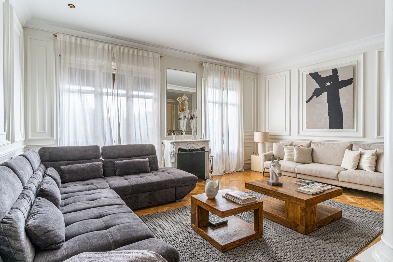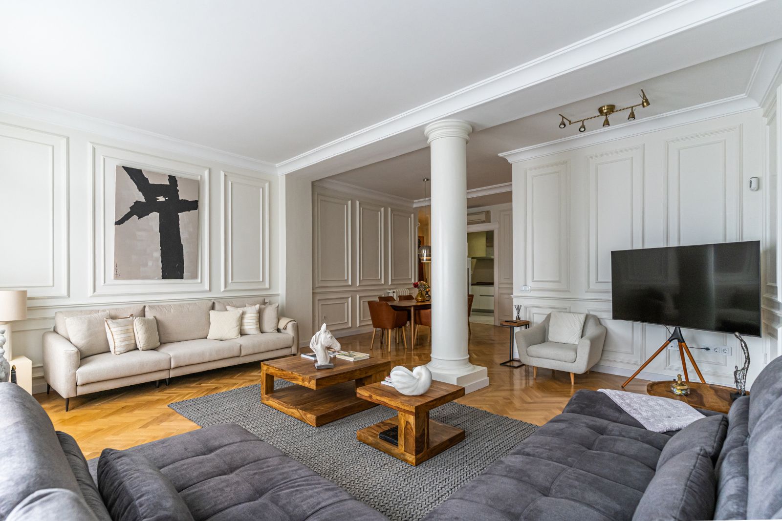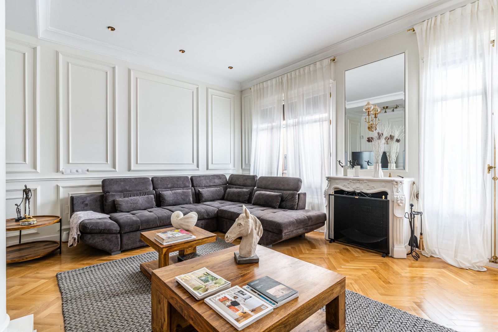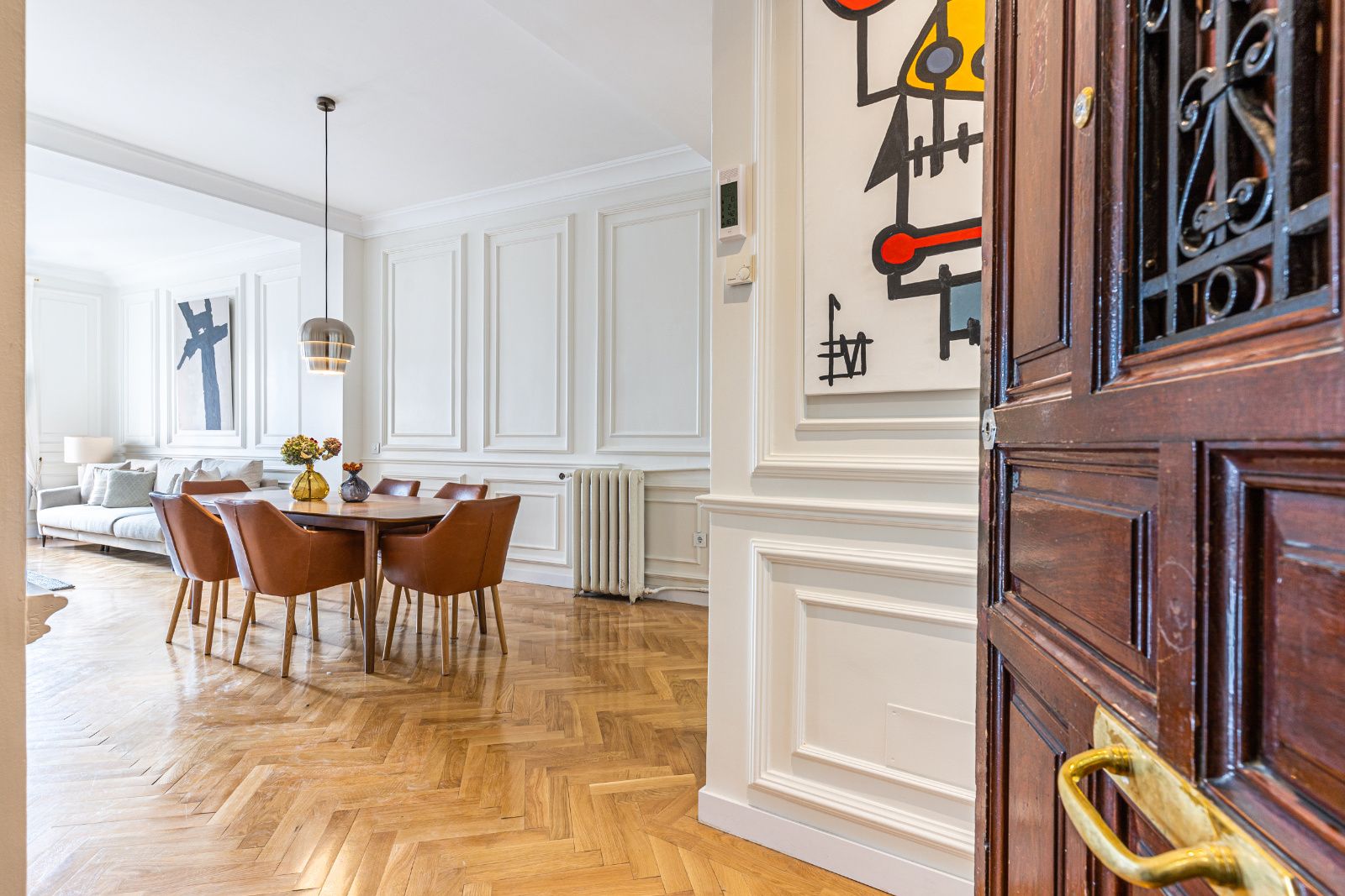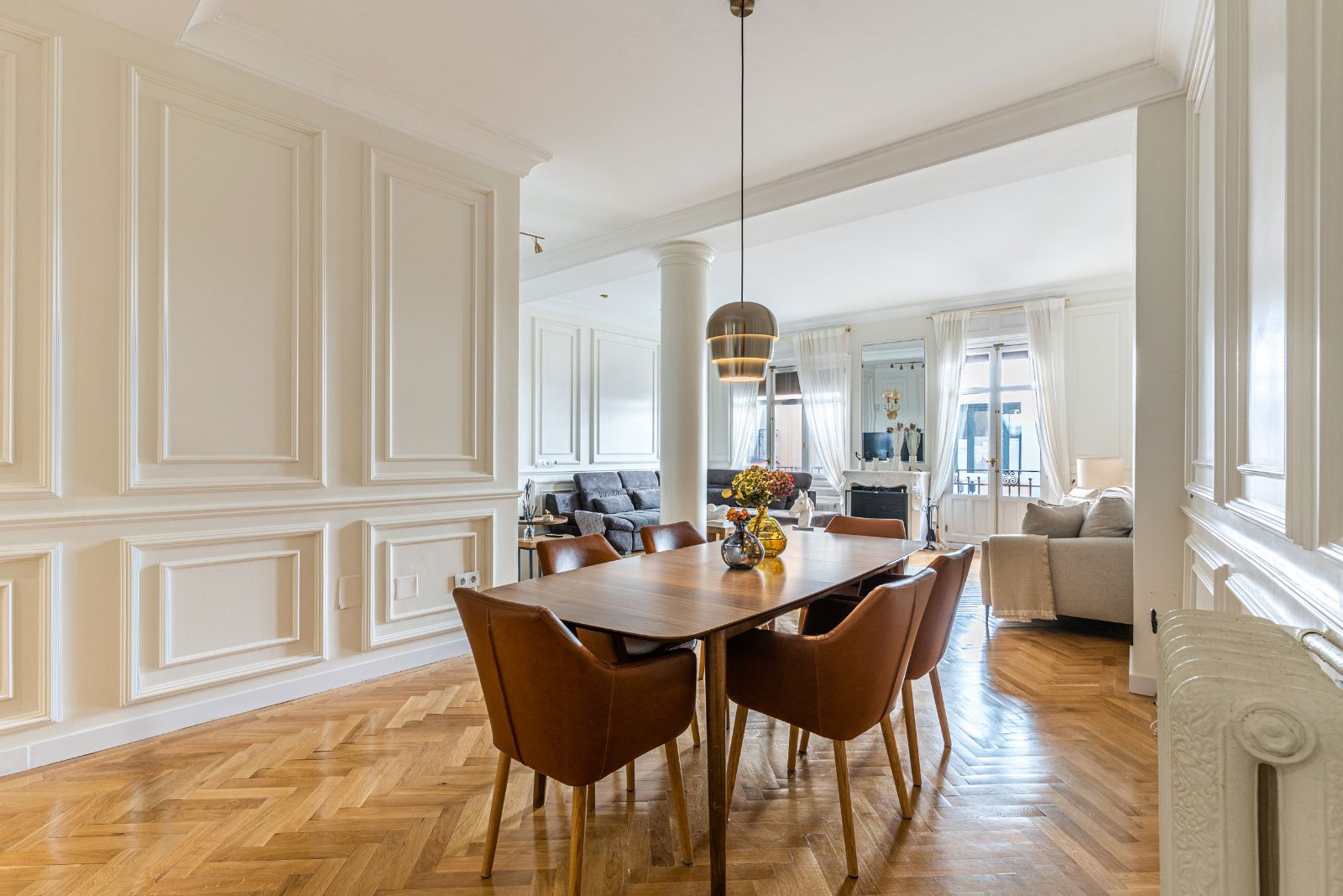 Los techos altos con molduras originales y la chimenea del salón evocan un elegante aire señorial, mientras que los acabados actuales crean un ambiente armónico, funcional y refinado. El amplio salón, inundado de luz natural gracias a sus grandes ventanales exteriores, se convierte en el verdadero protagonista del espacio, ideal tanto para el descanso como para recibir invitados. La vivienda cuenta además con un comedor independiente con capacidad para seis comensales, perfecto para reuniones y veladas especiales.