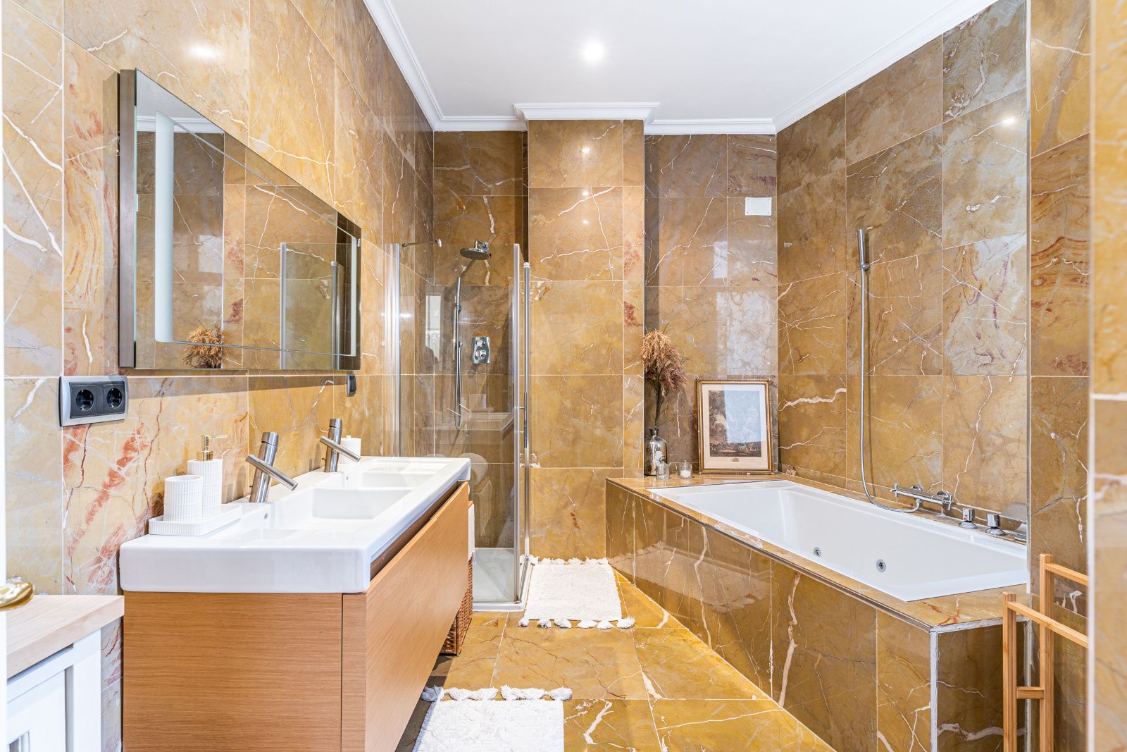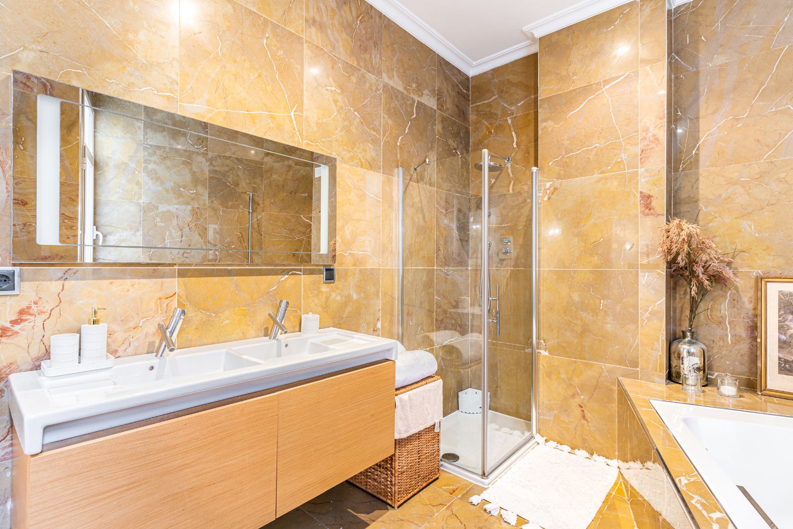 Materiales premium como el mármol y la madera se integran con naturalidad, creando un ambiente cálido, luminoso y acogedor. La abundante luz natural y la altura de los techos refuerzan la sensación de amplitud y bienestar en toda la vivienda.