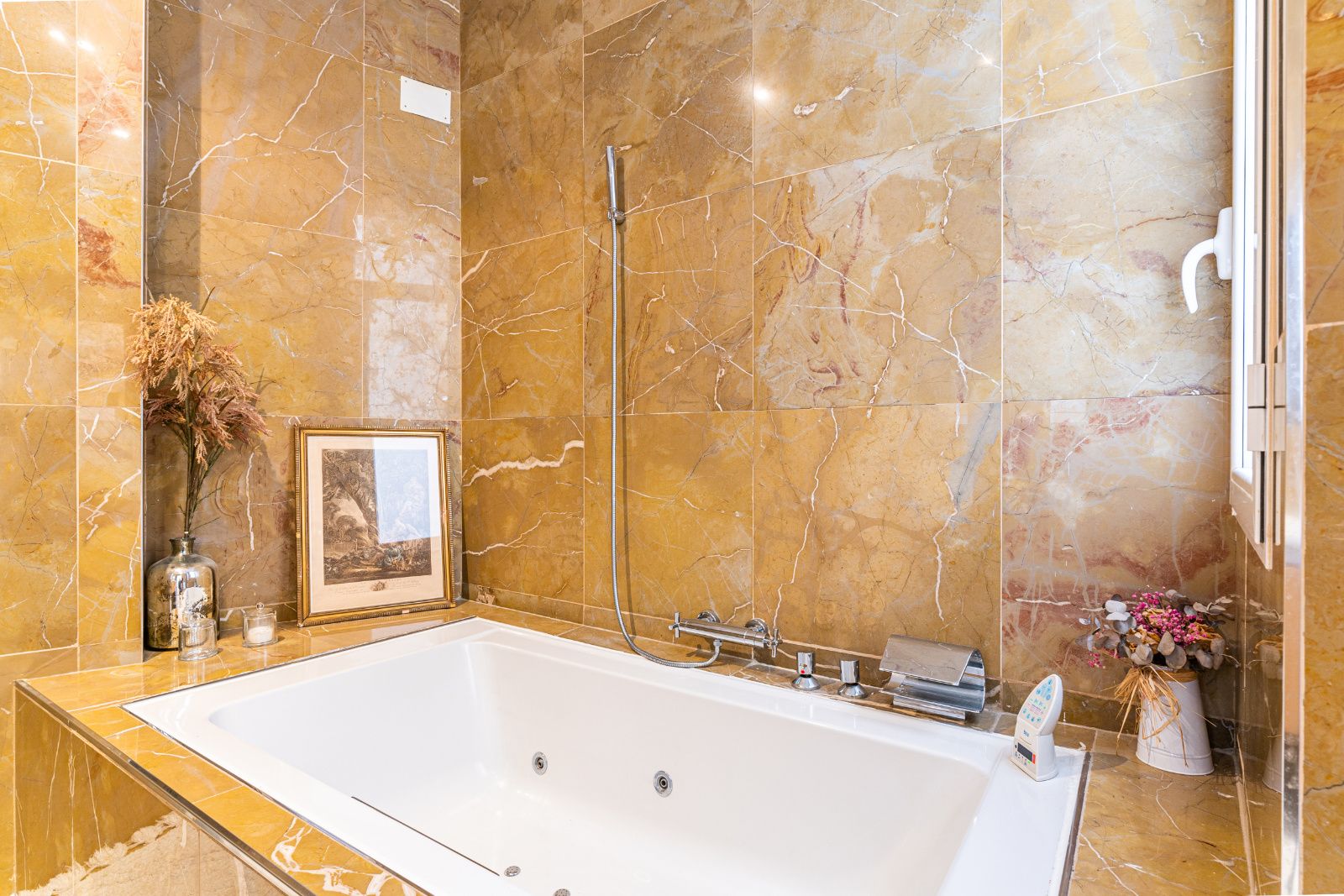 La propiedad dispone de dos dormitorios. El dormitorio principal es un auténtico refugio de lujo, con un espacioso vestidor y baño en suite equipado con bañera de hidromasaje y ducha independiente, ofreciendo una experiencia tipo spa. El segundo dormitorio, dotado de sofá cama, resulta ideal como habitación de invitados o despacho, y se complementa con un segundo baño completo con plato de ducha. Ambos baños presentan elegantes acabados en mármol de alta gama.