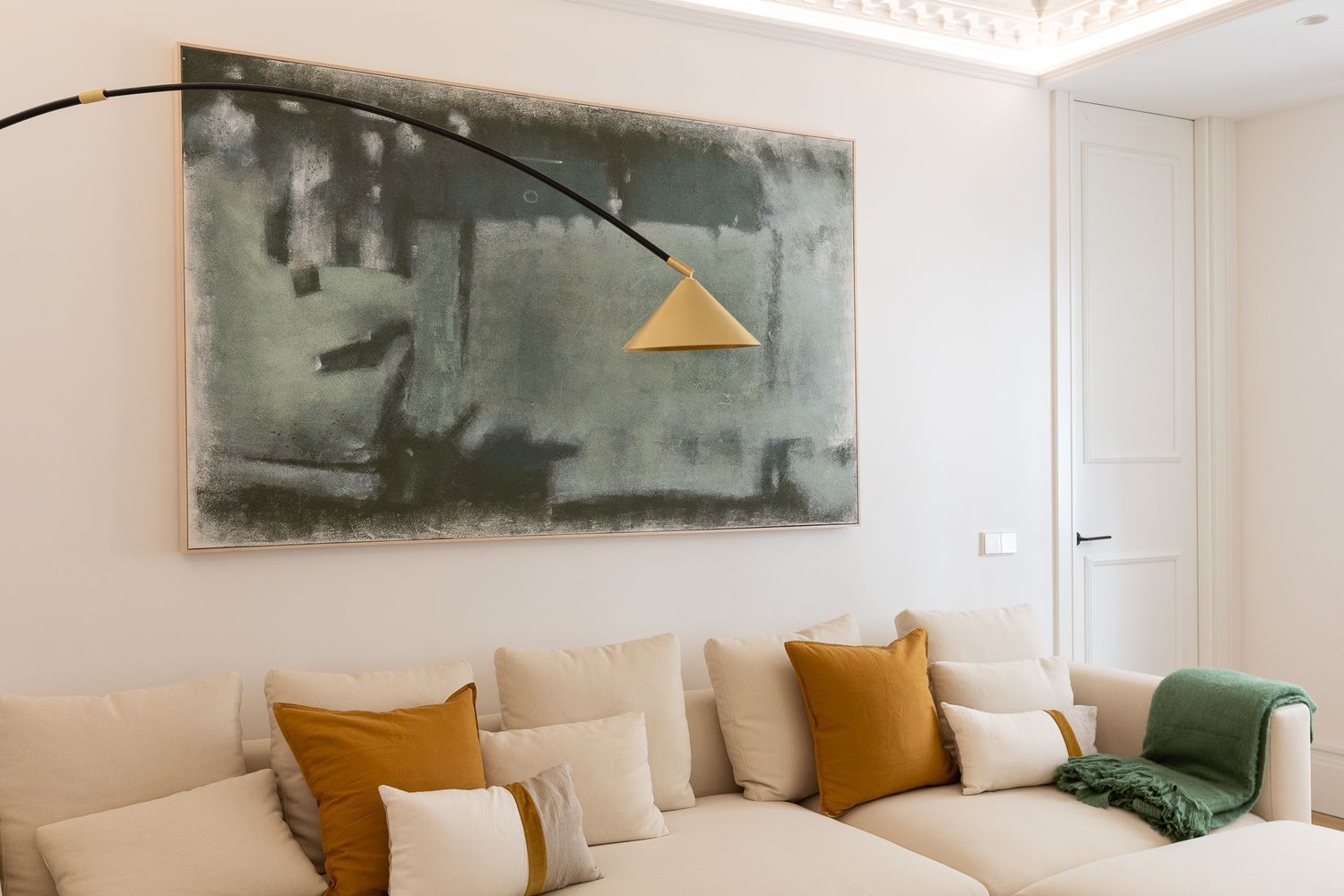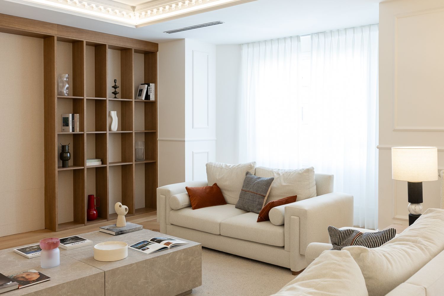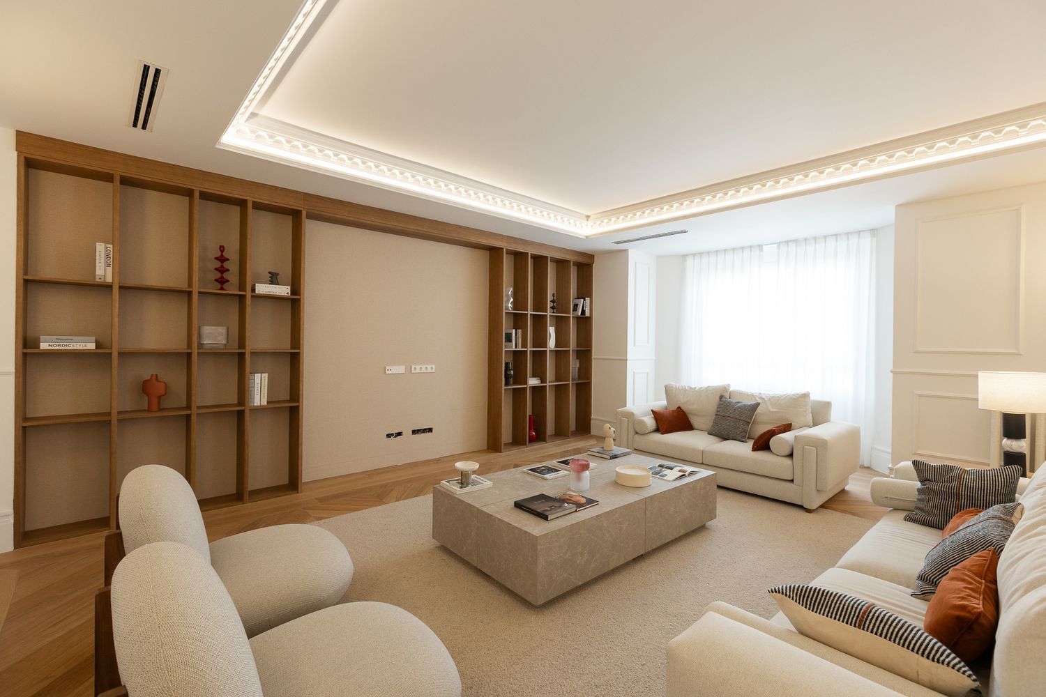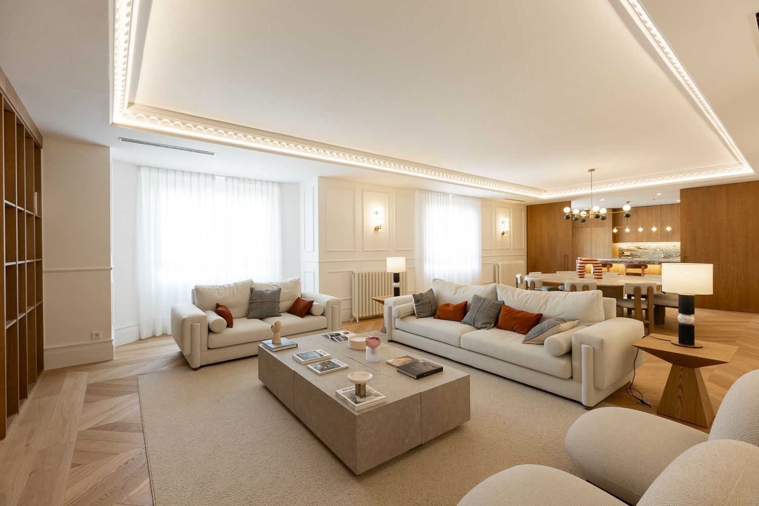 Con una superficie de 368 m² construidos, la propiedad ofrece una impresionante zona de recibo, donde destacan los suelos de mosaico de roble natural y un sofisticado sofá curvo que invita al descanso. Tres amplios ventanales inundan el espacio de luz natural, creando un ambiente cálido, luminoso y acogedor.