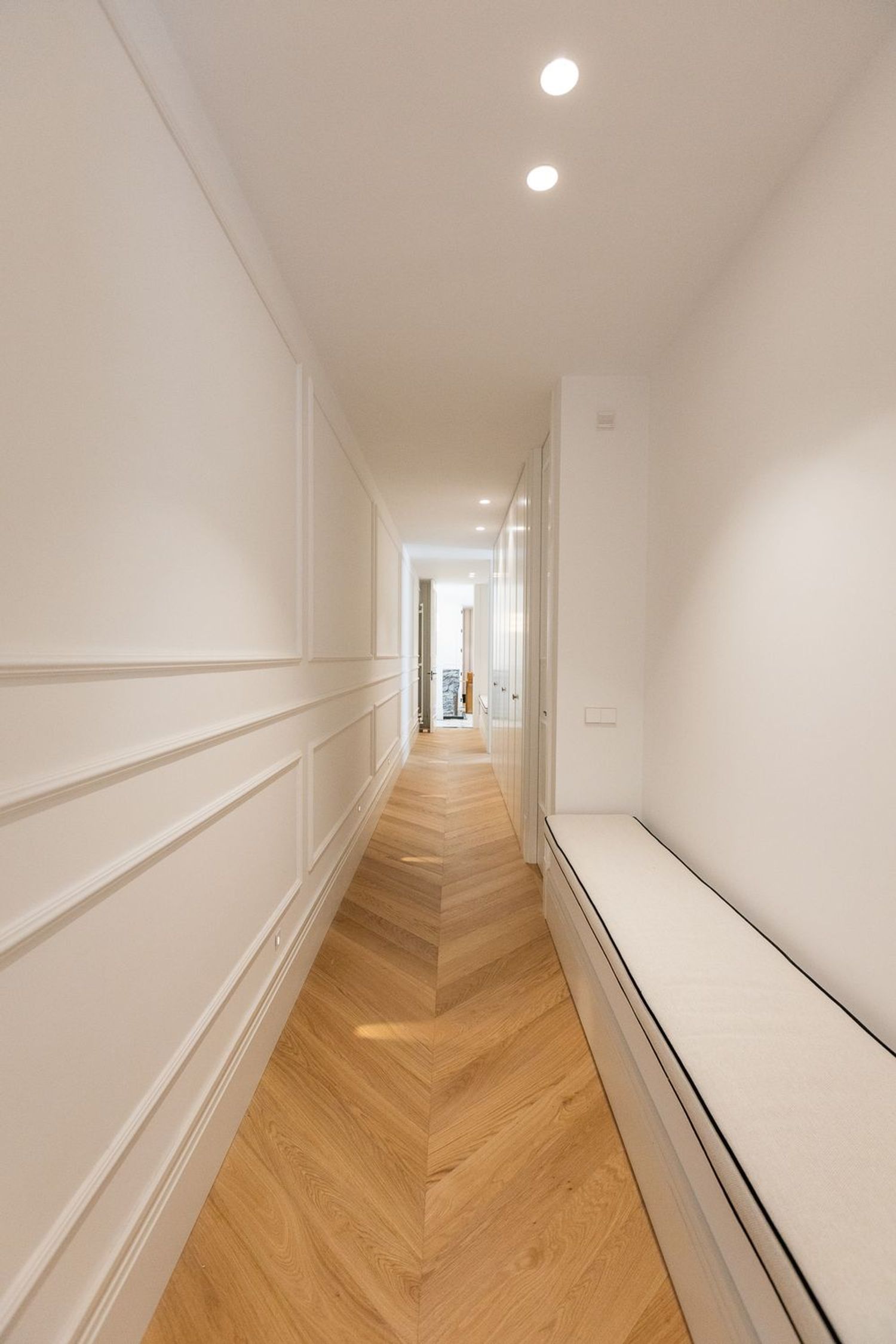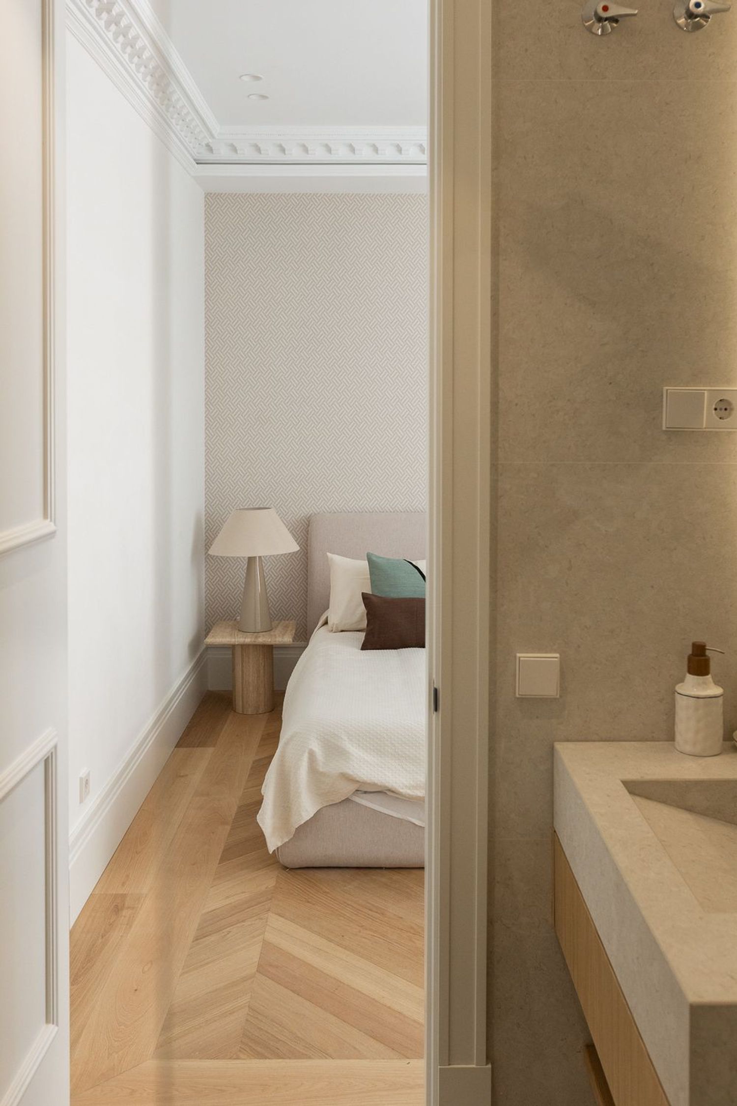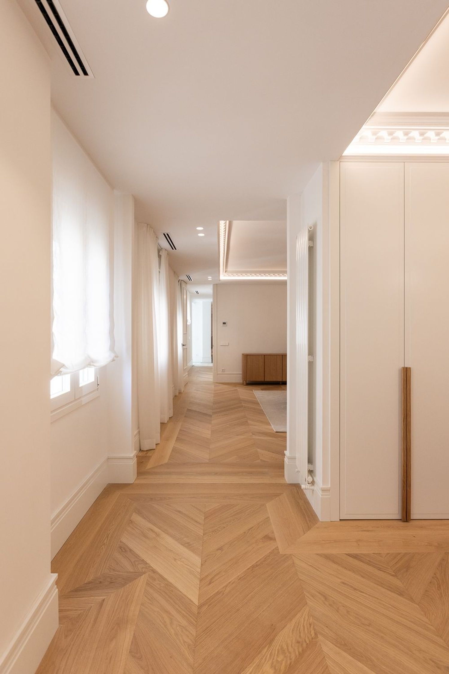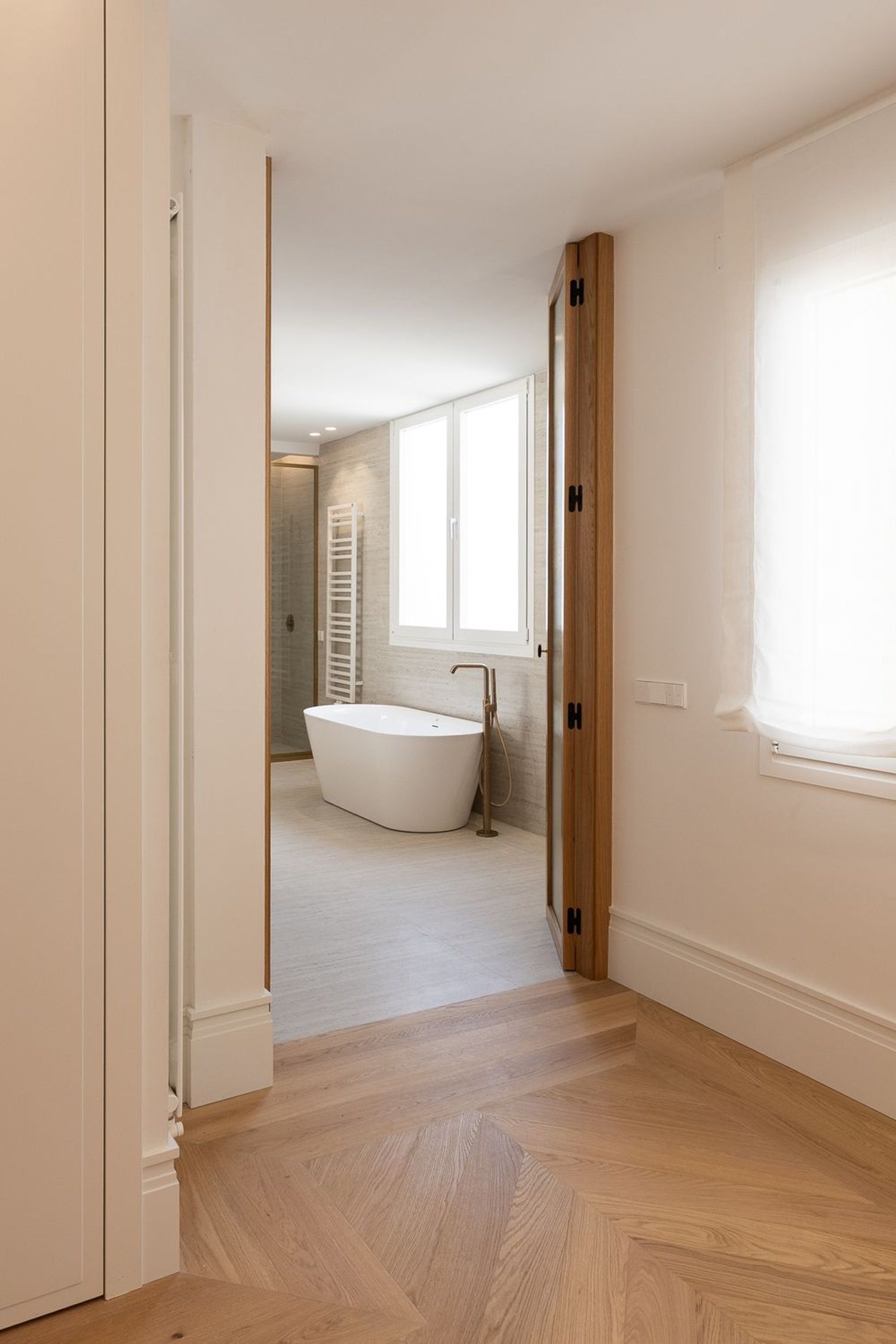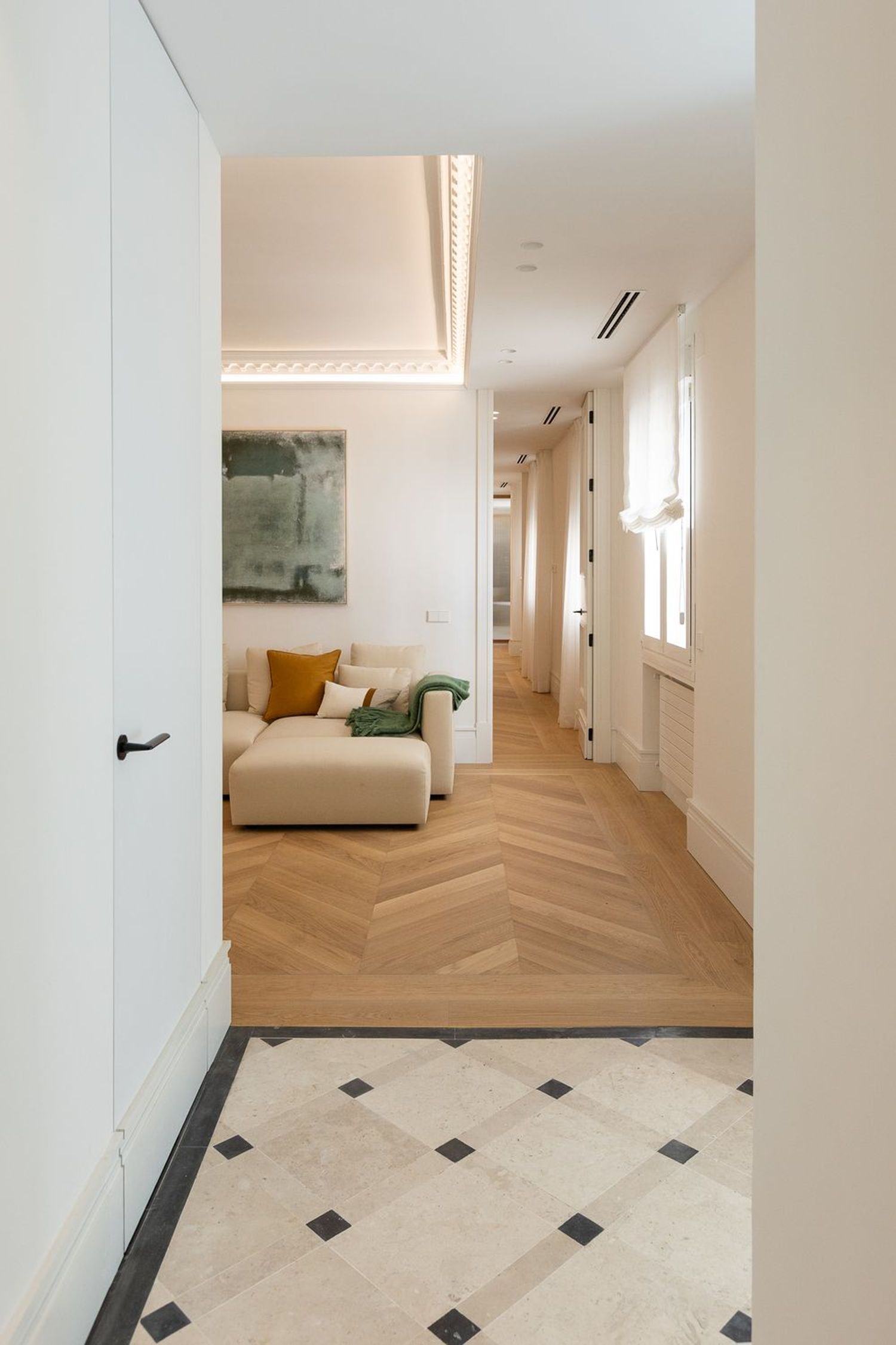 Suelo de roble natural en espiga, un guiño al clasicismo reinterpretado con sofisticación.