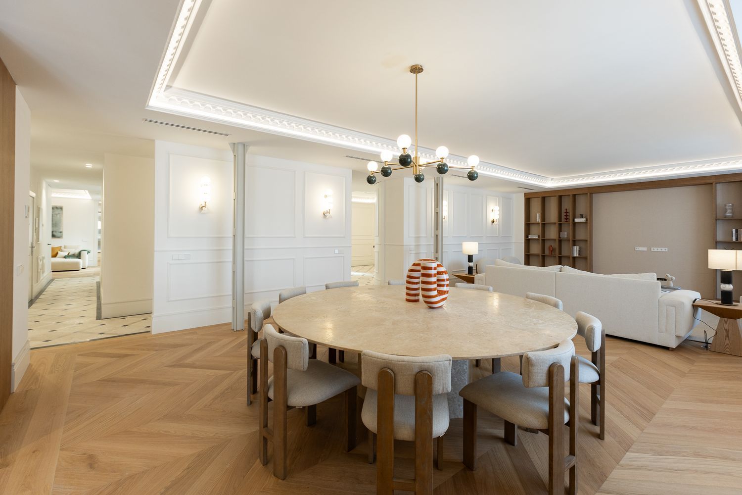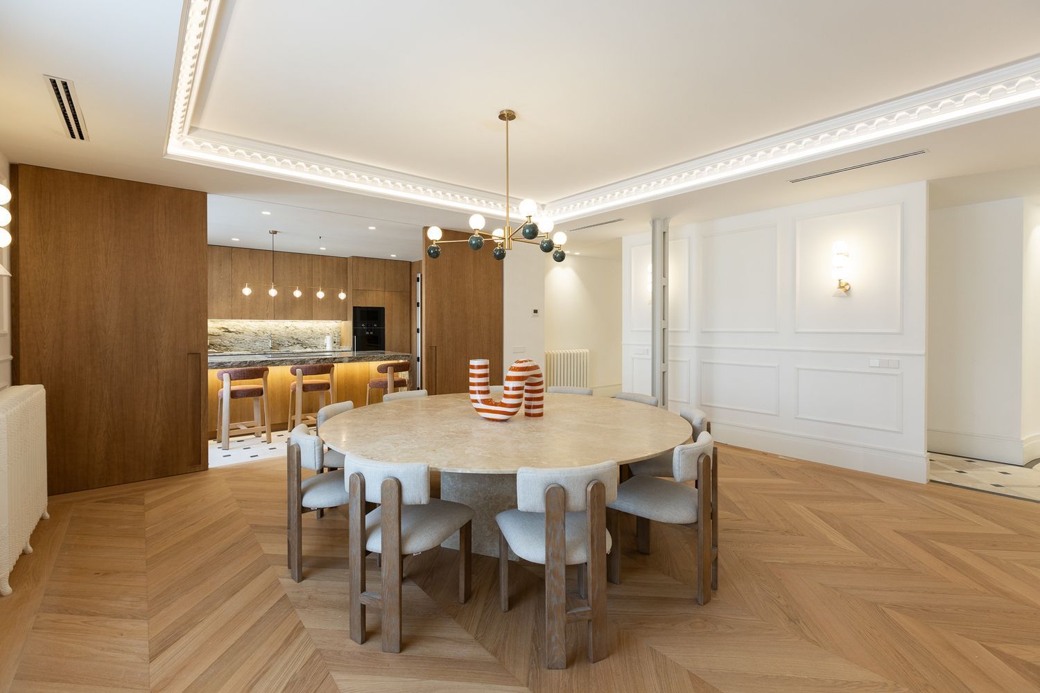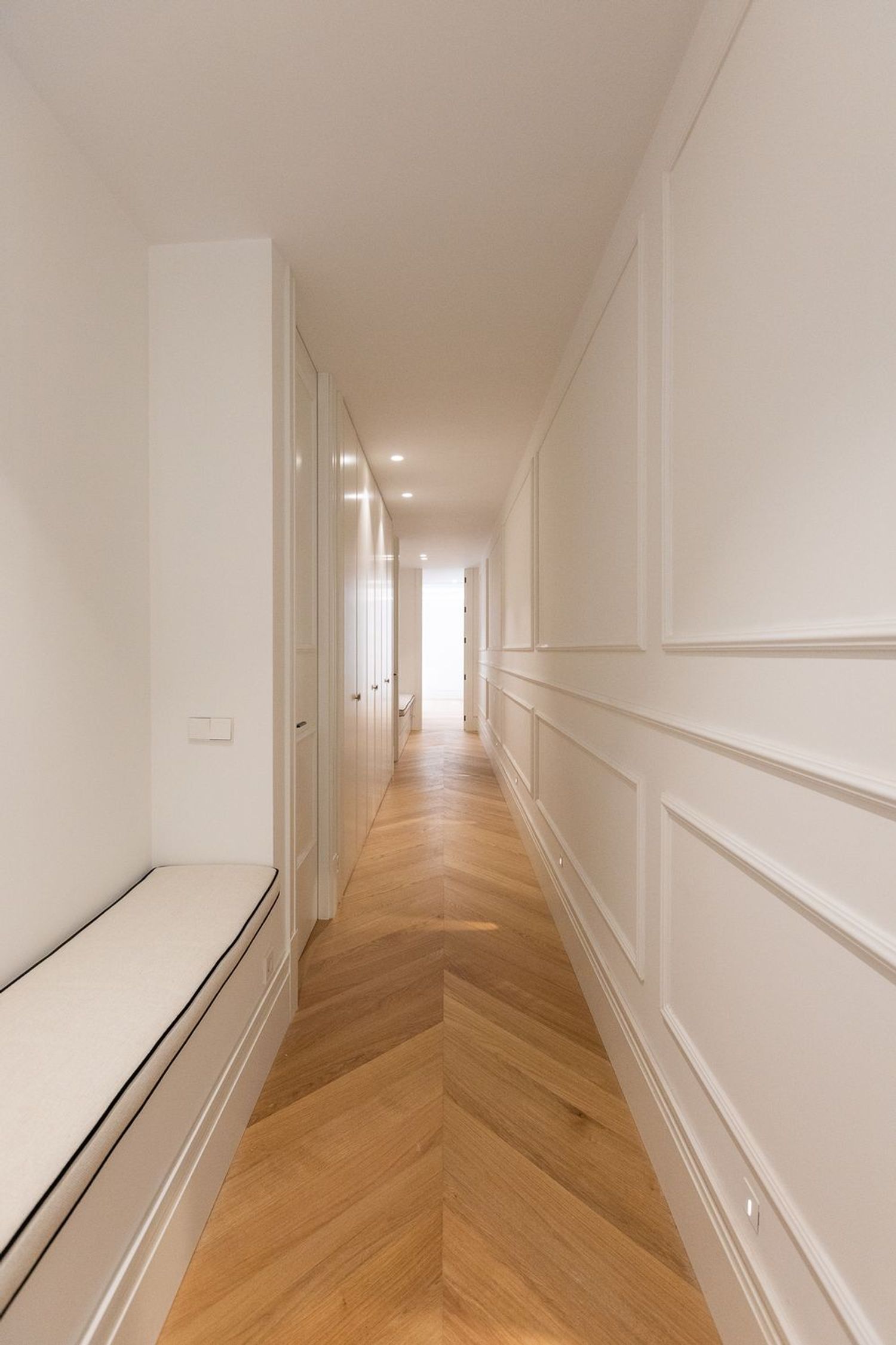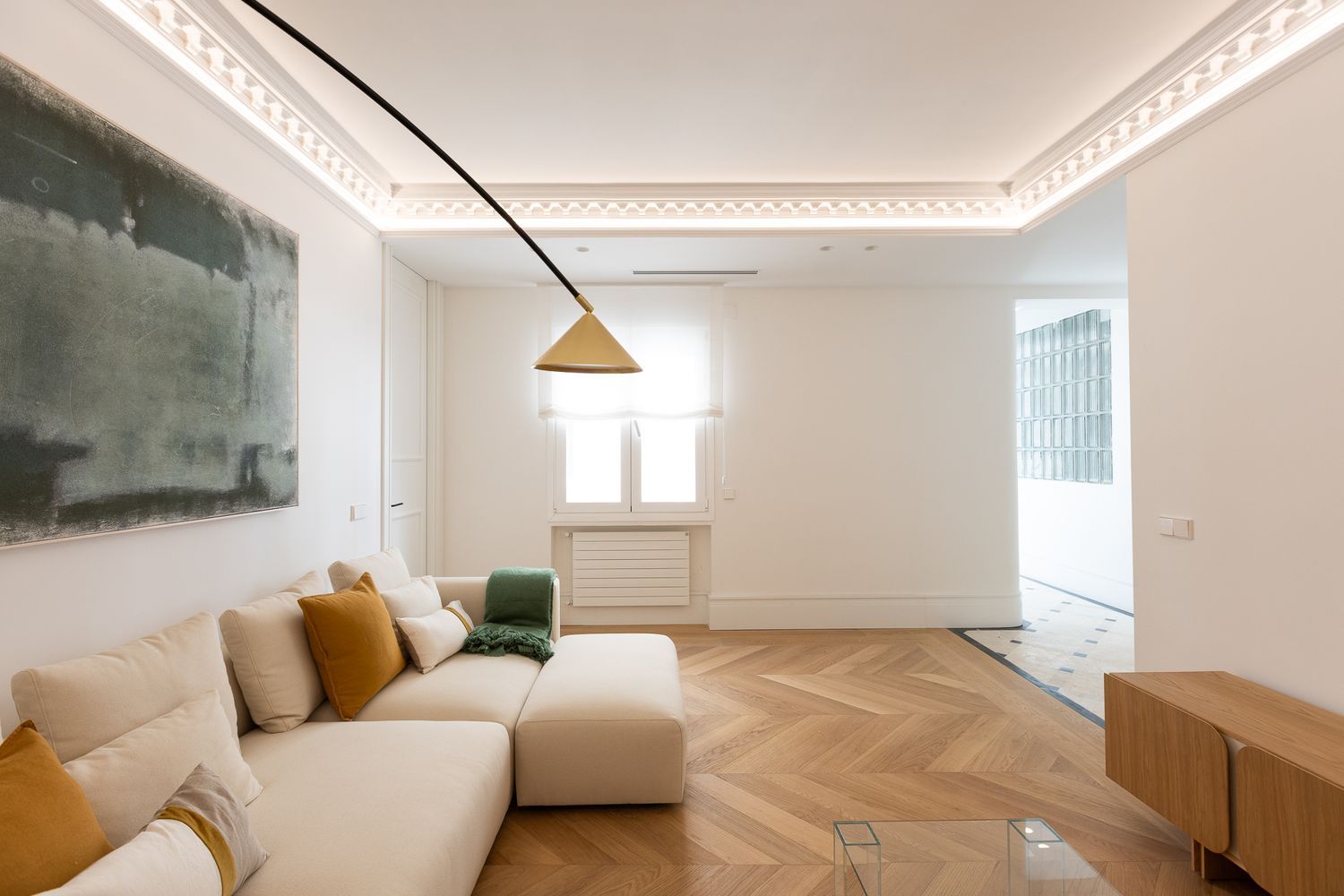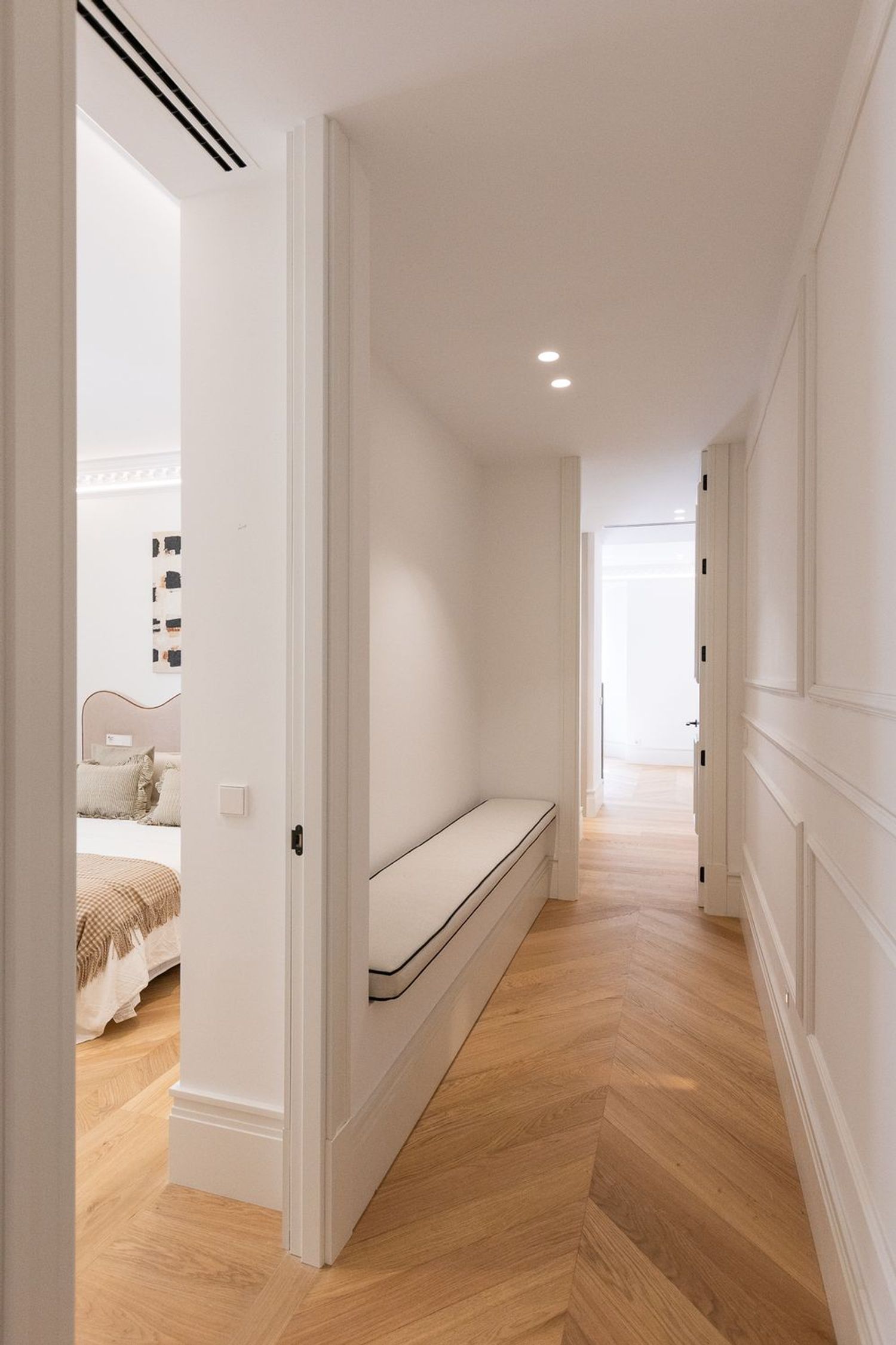 Suelo de roble natural en espiga, un guiño al clasicismo reinterpretado con sofisticación.