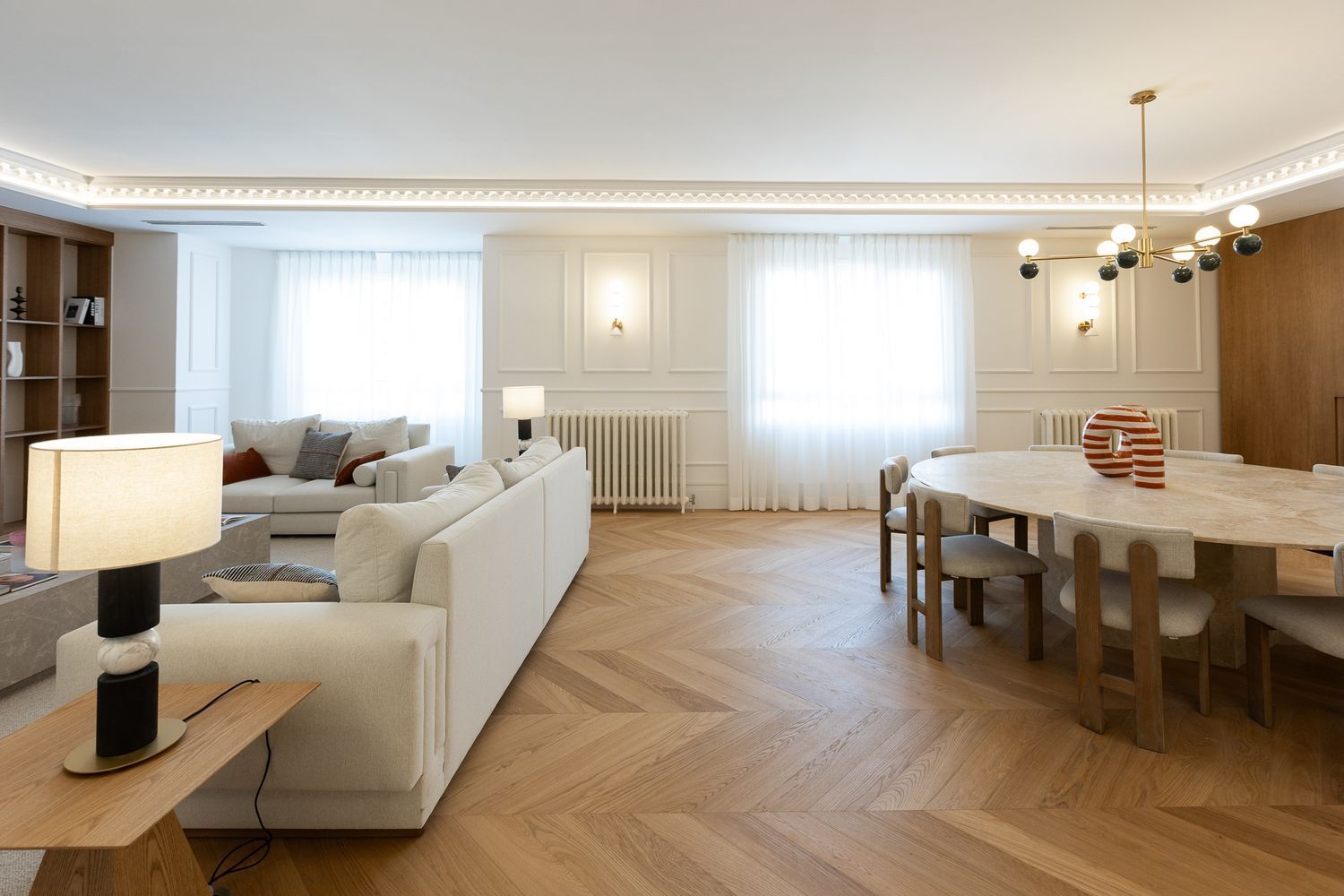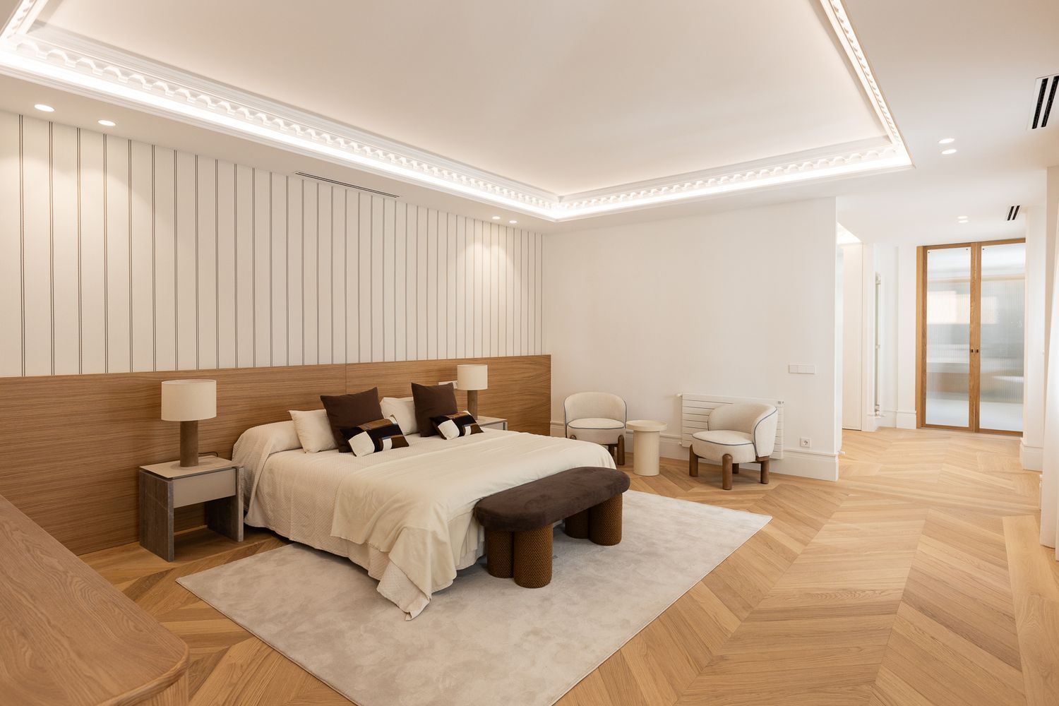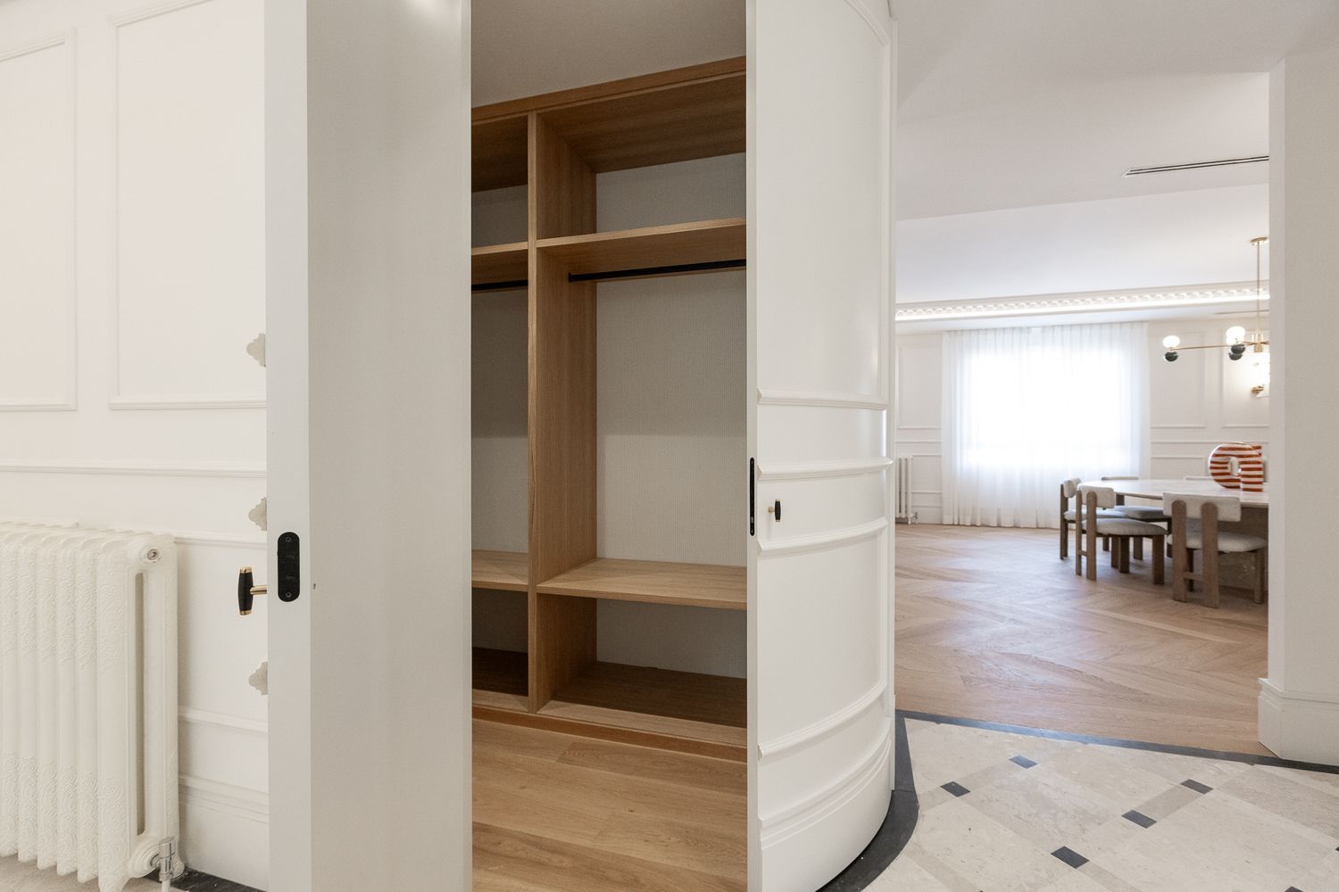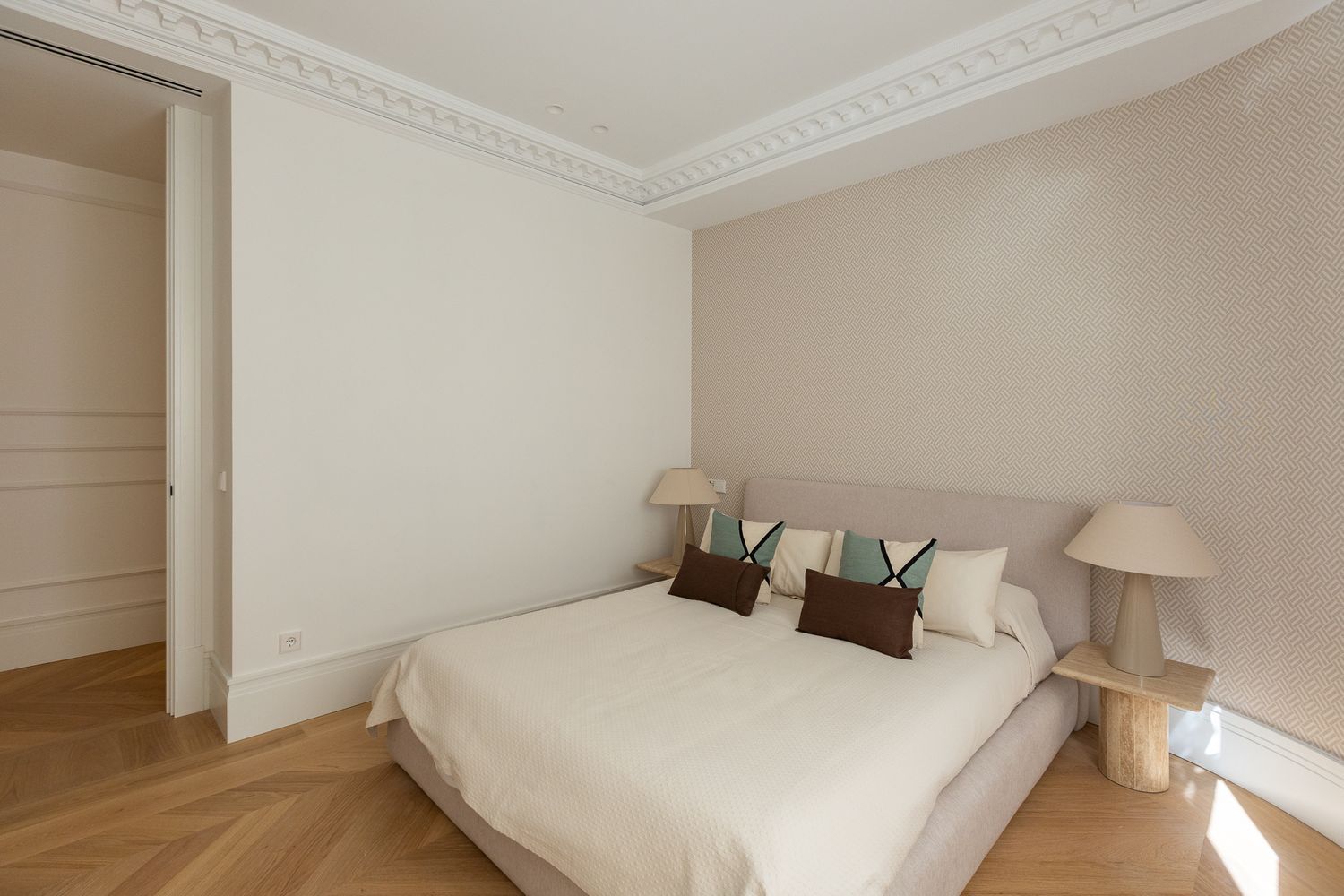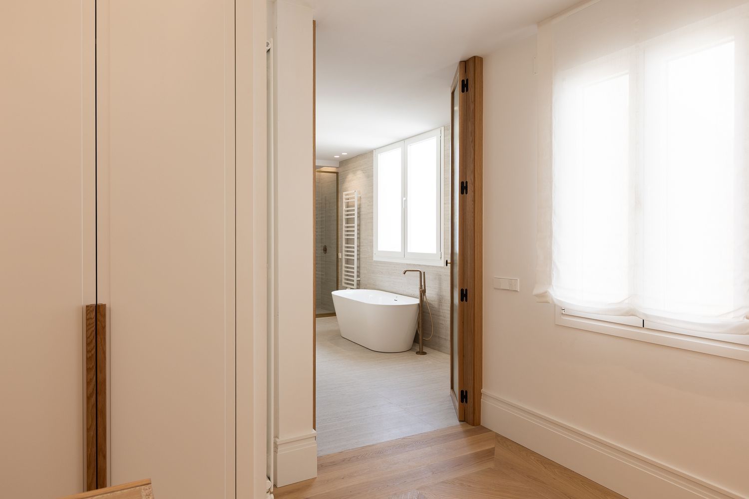 Suelo de roble natural en espiga, un guiño al clasicismo reinterpretado con sofisticación.