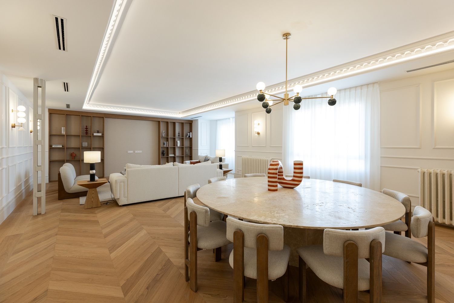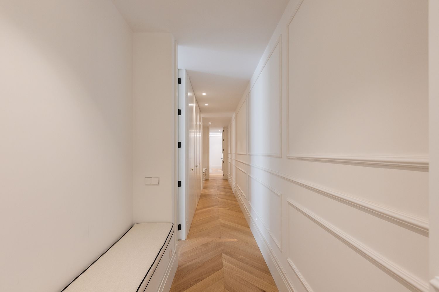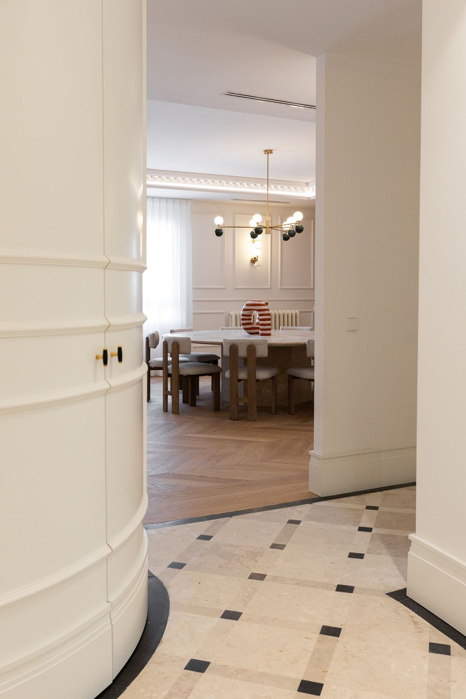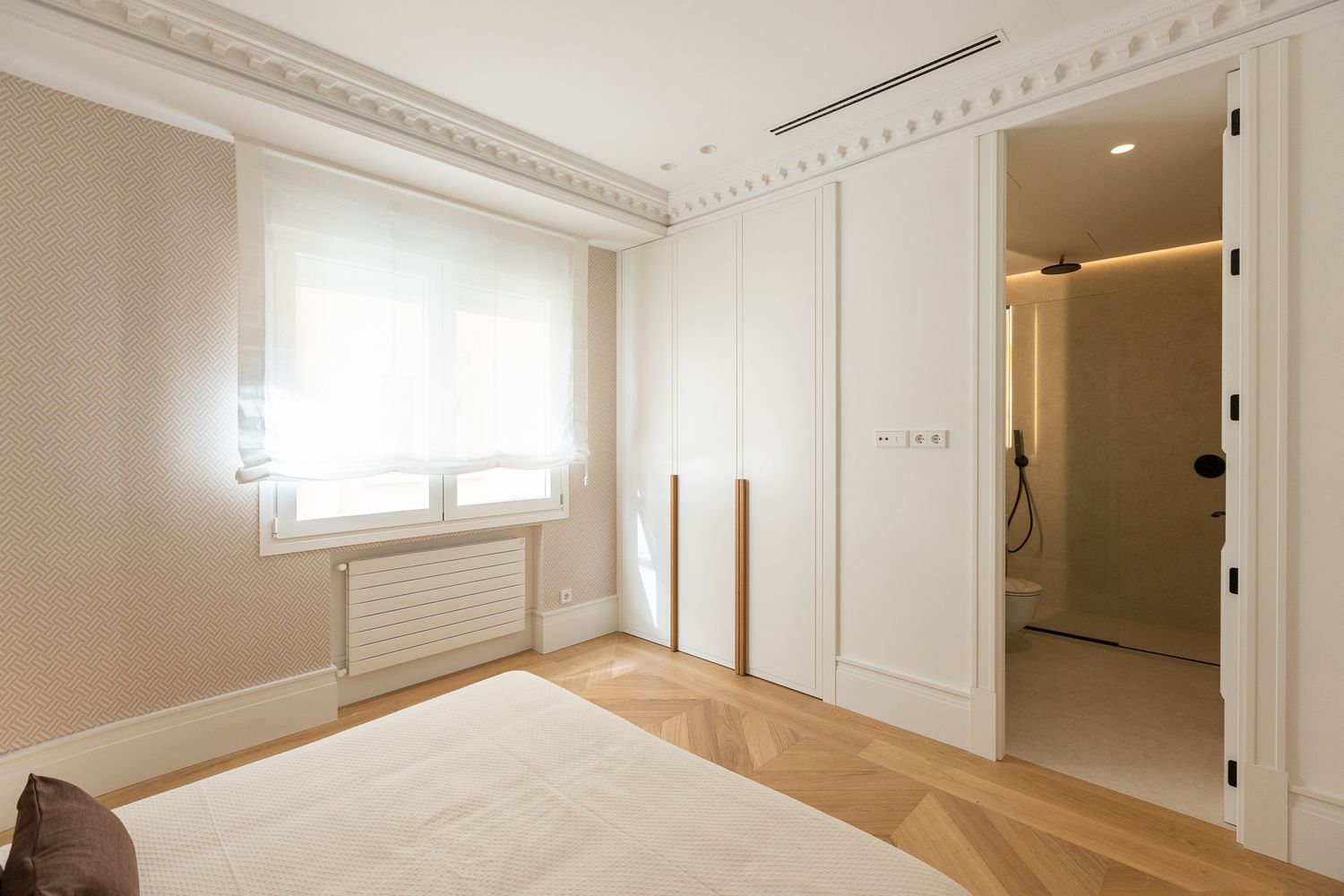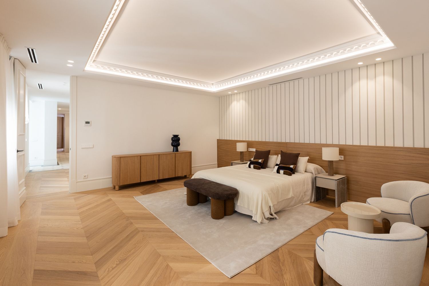 Suelo de roble natural en espiga, un guiño al clasicismo reinterpretado con sofisticación.