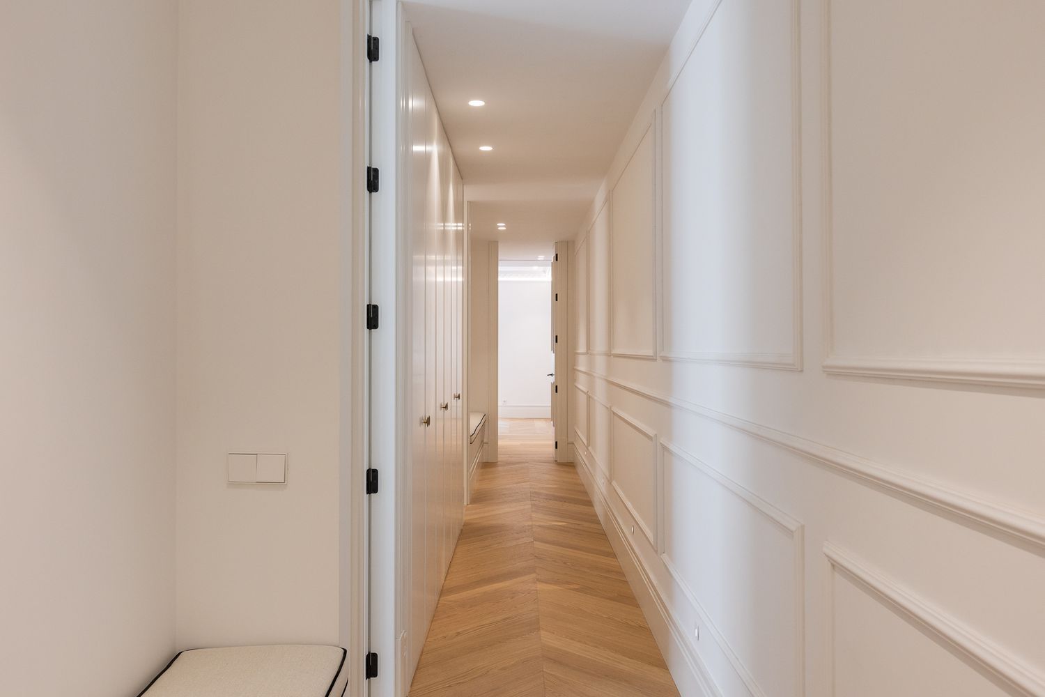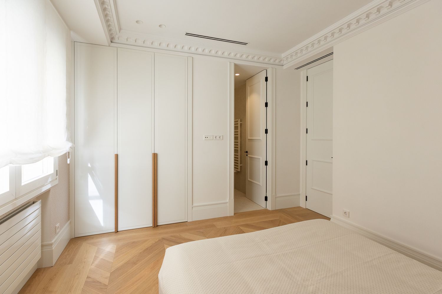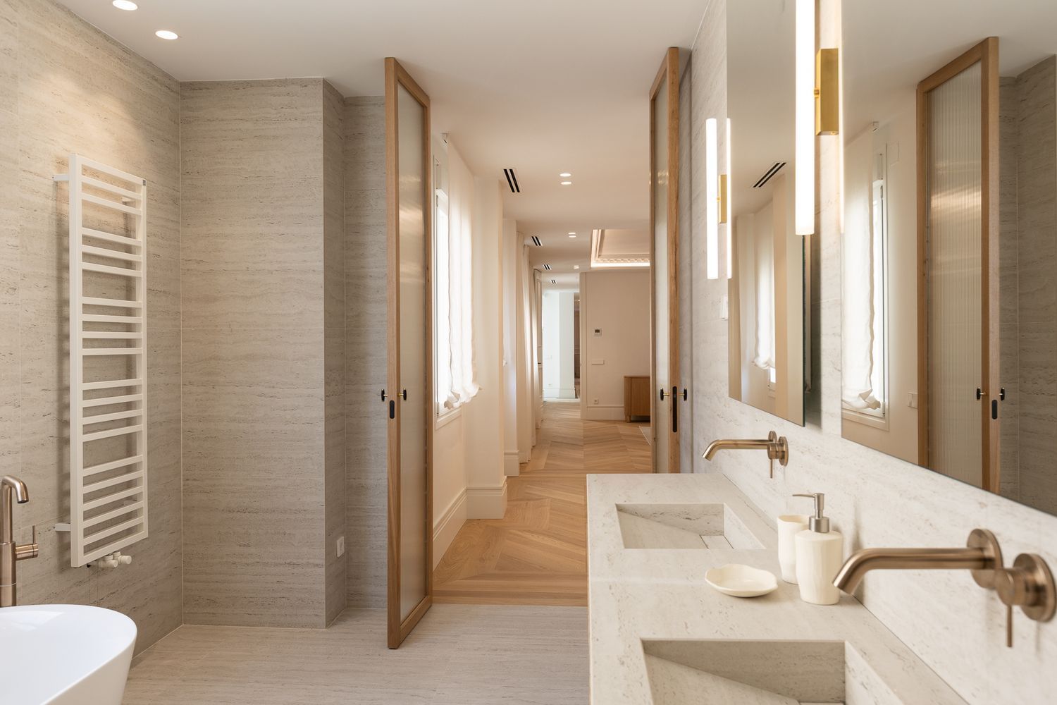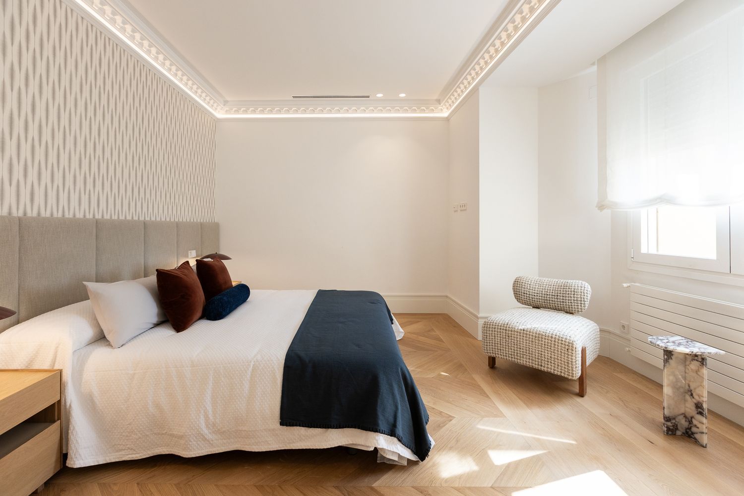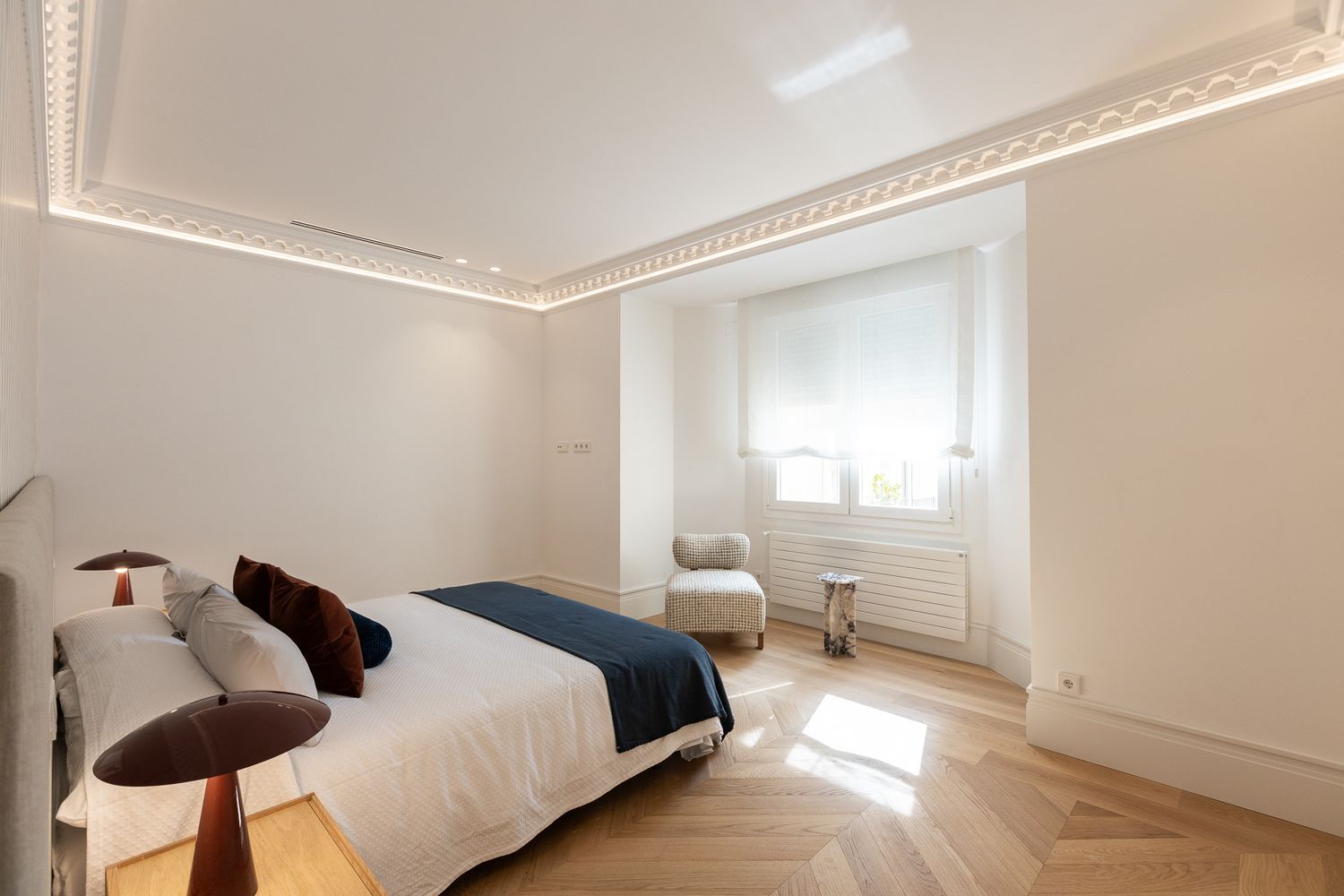 Suelo de roble natural en espiga, un guiño al clasicismo reinterpretado con sofisticación.