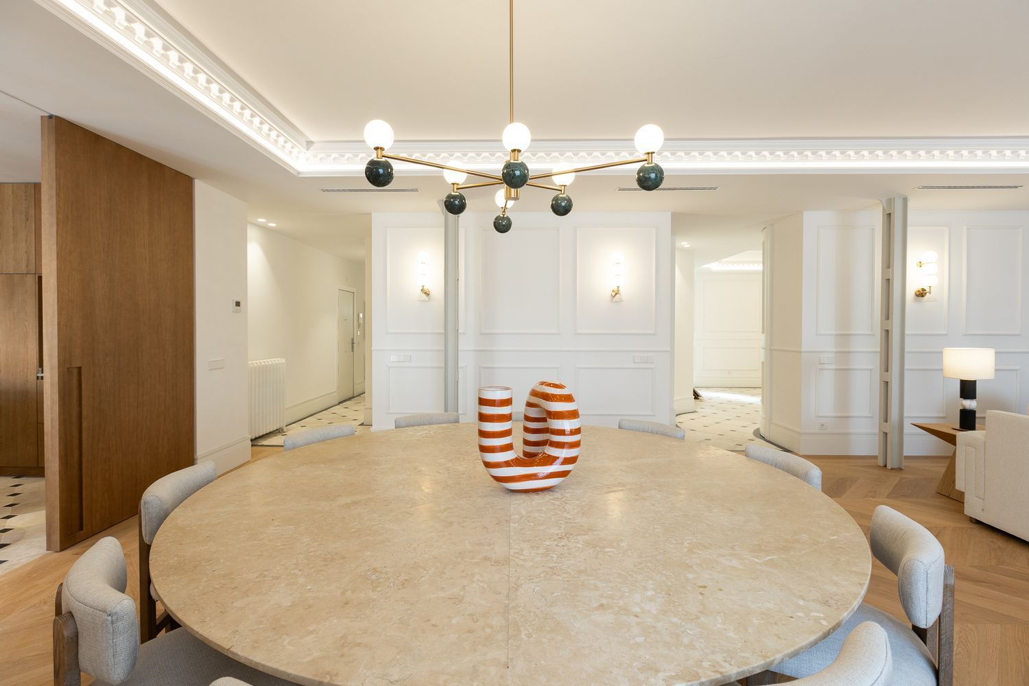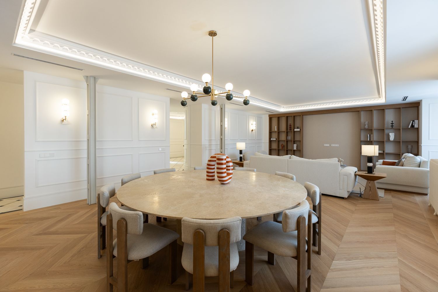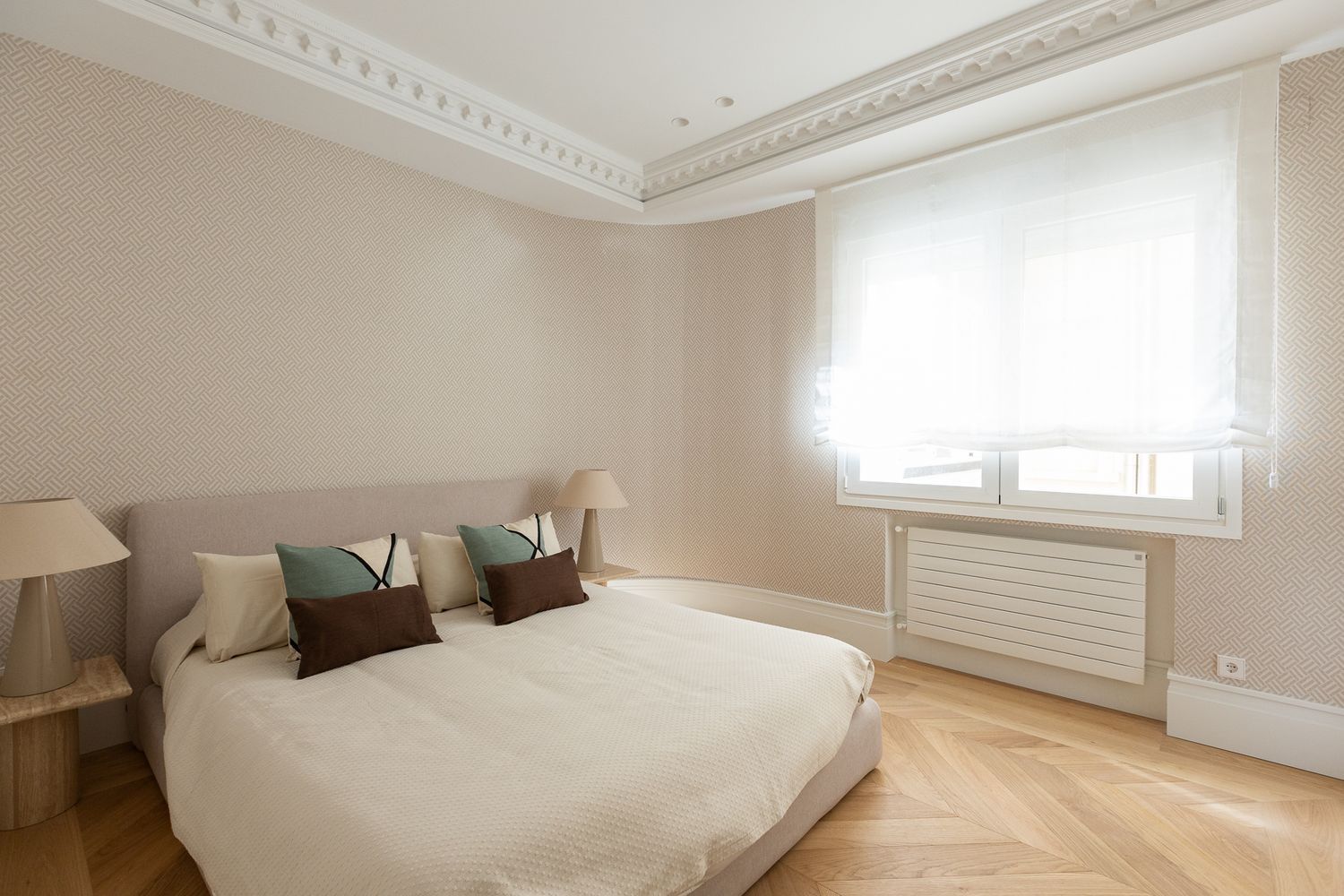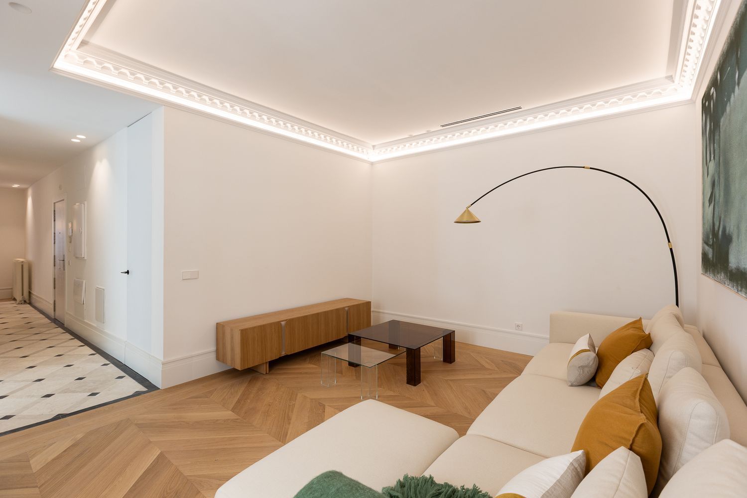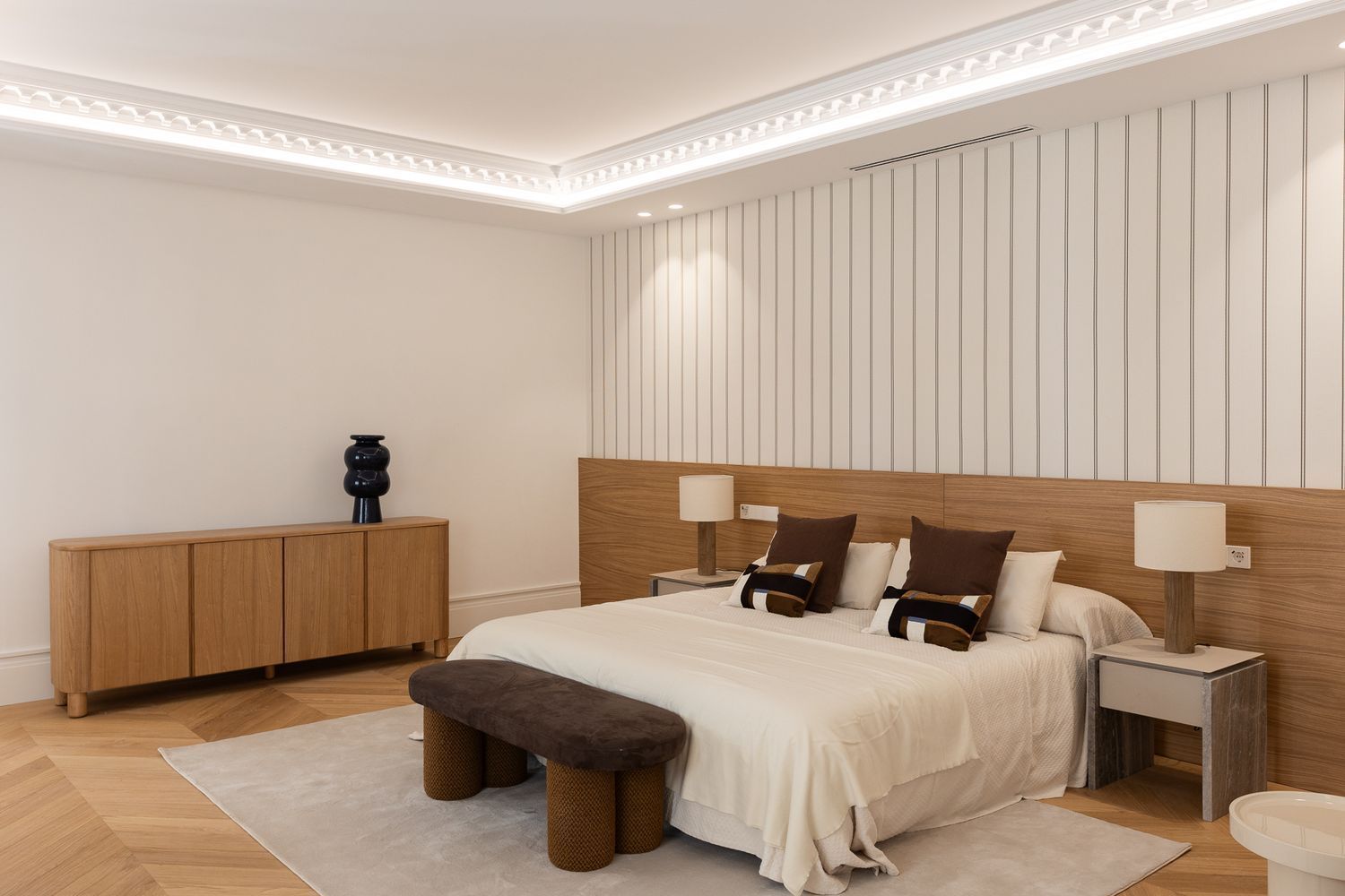 Suelo de roble natural en espiga, un guiño al clasicismo reinterpretado con sofisticación.