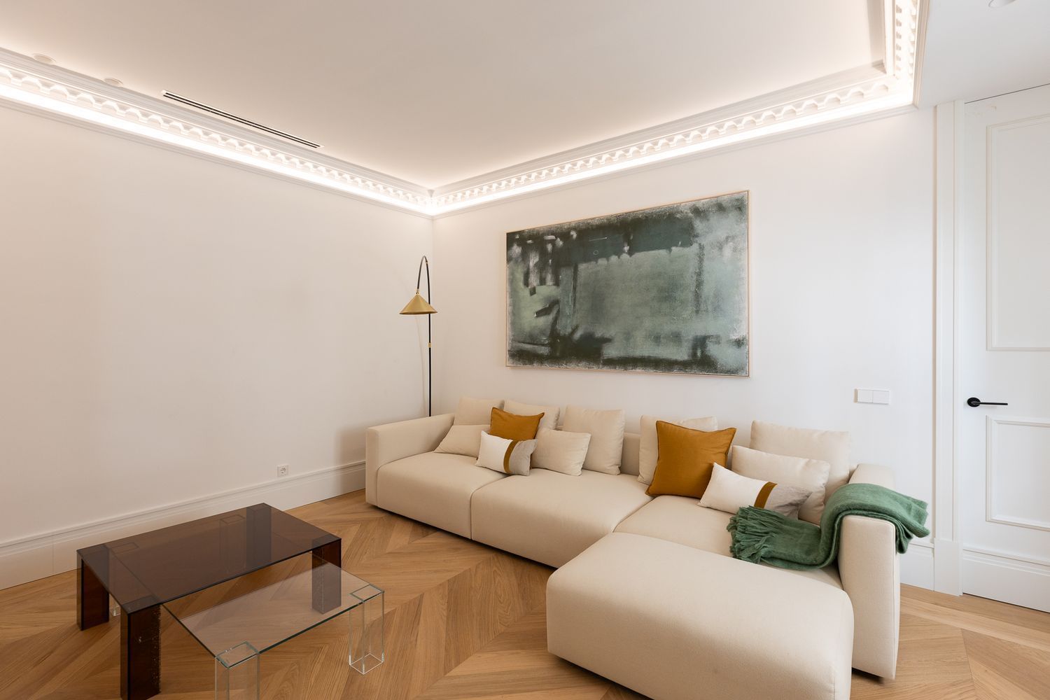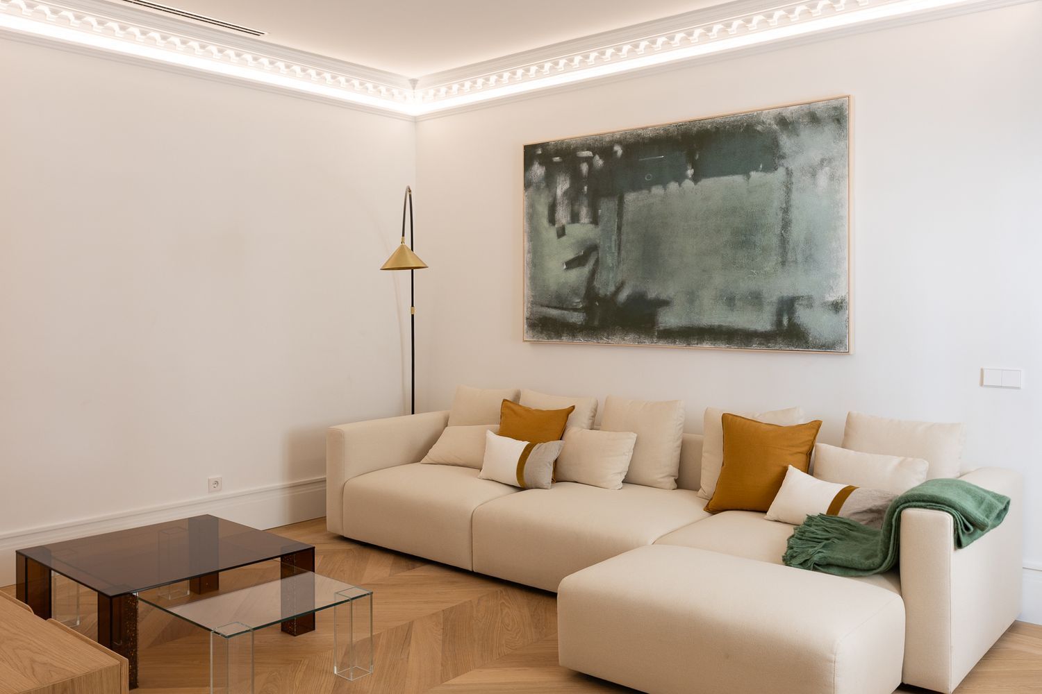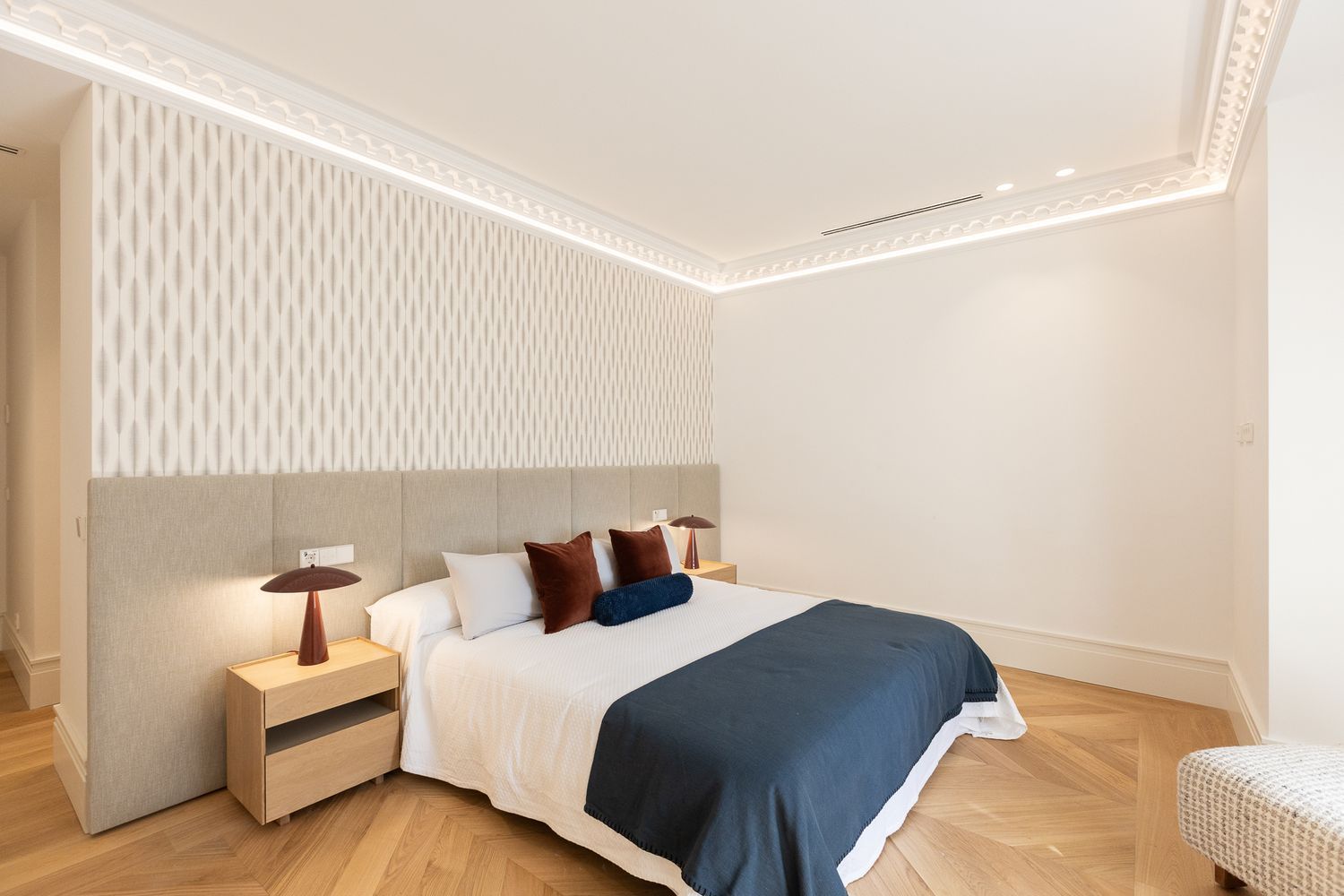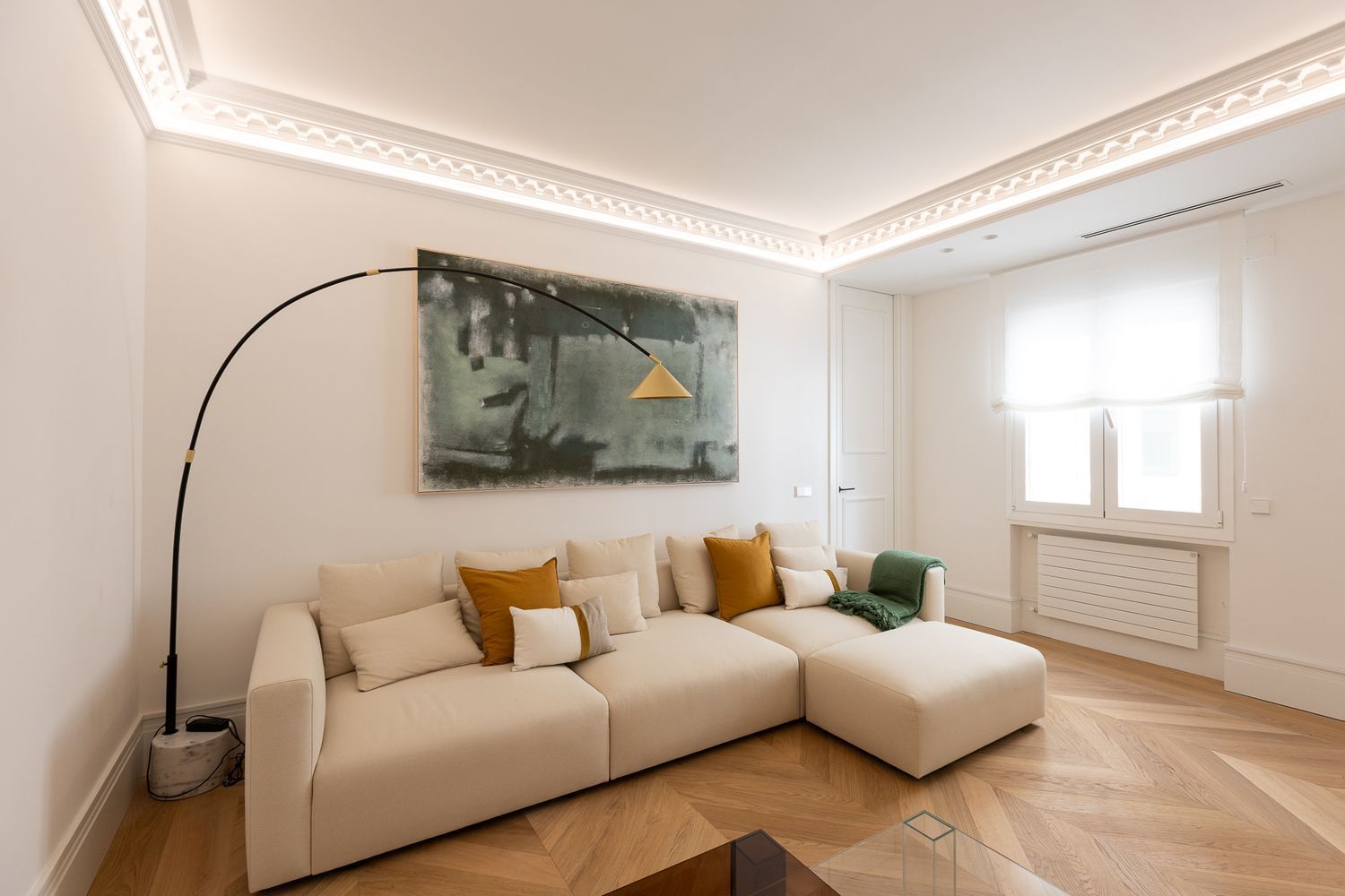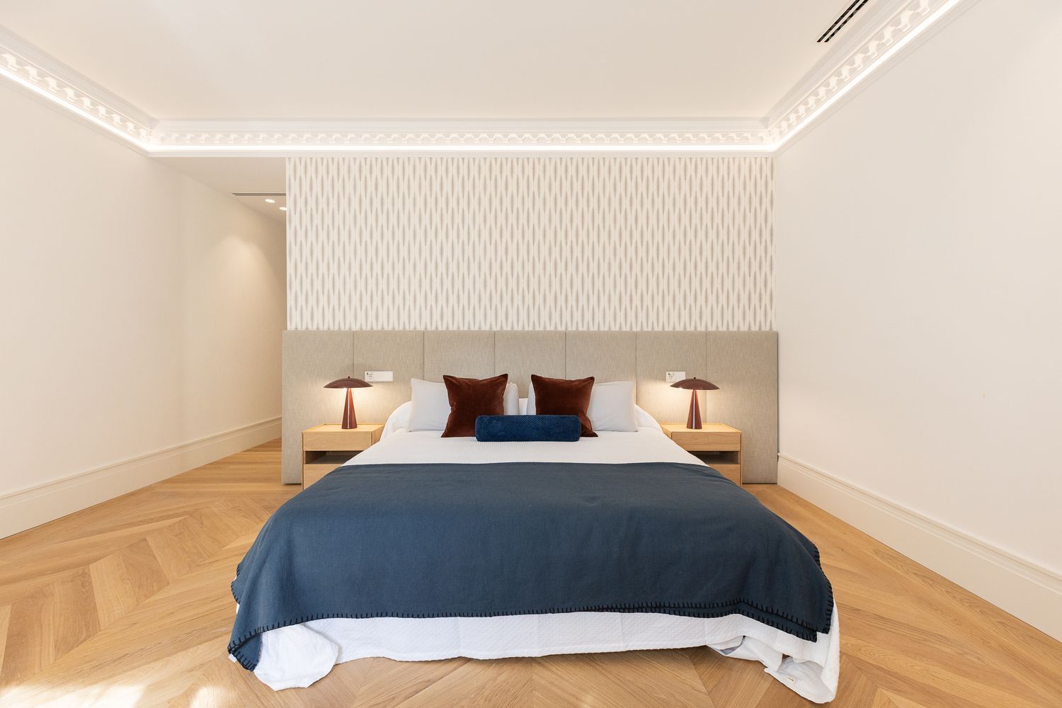 Suelo de roble natural en espiga, un guiño al clasicismo reinterpretado con sofisticación.