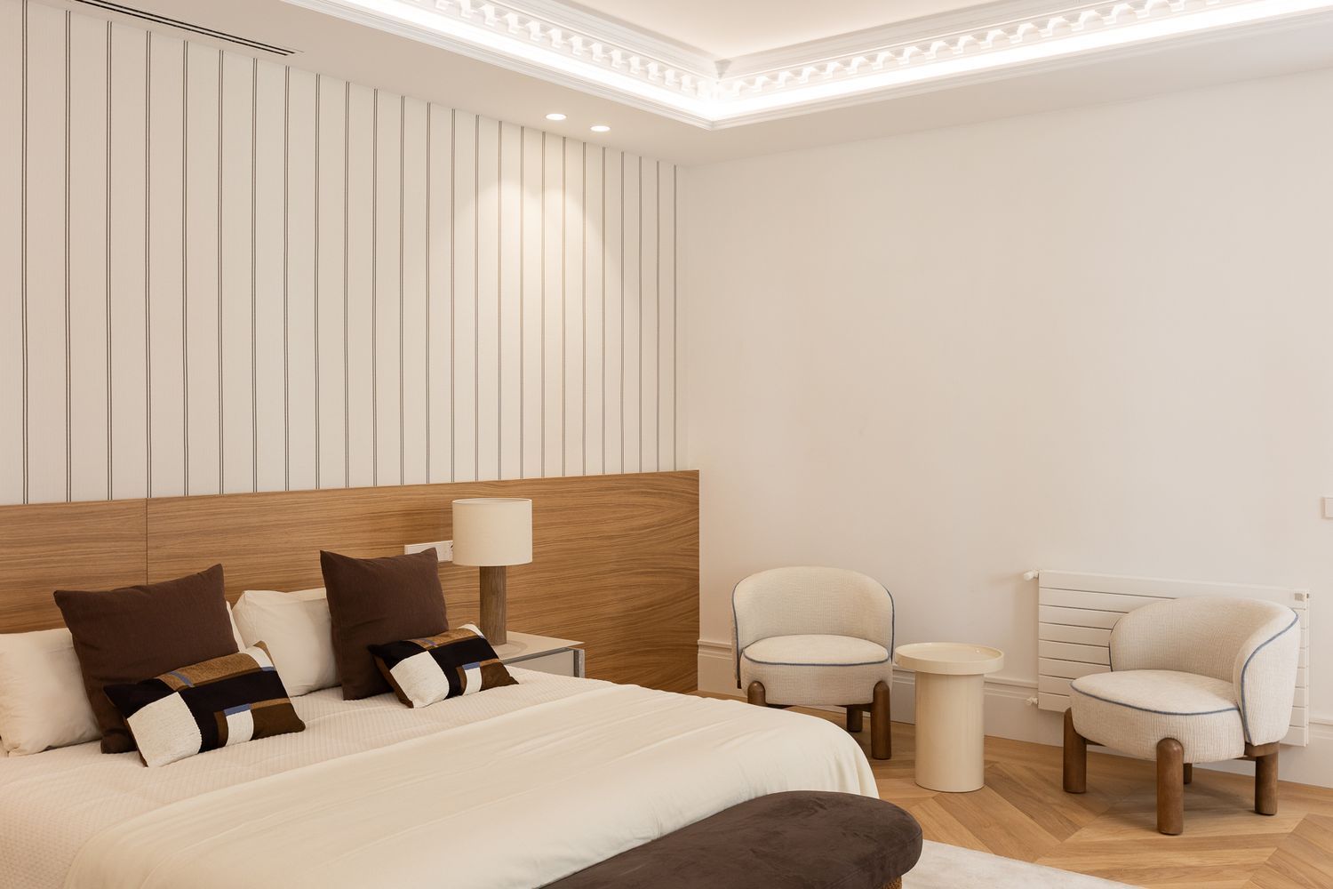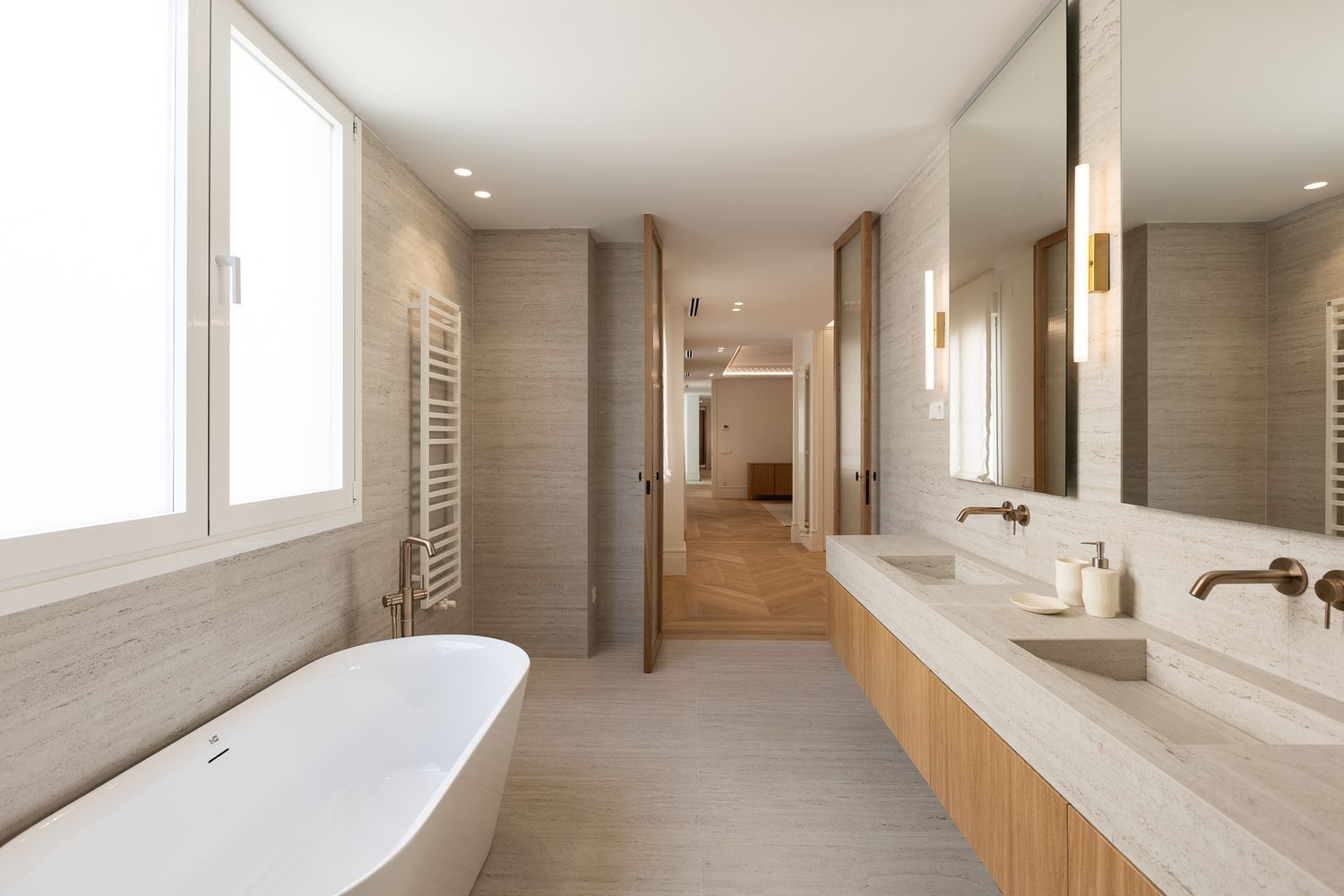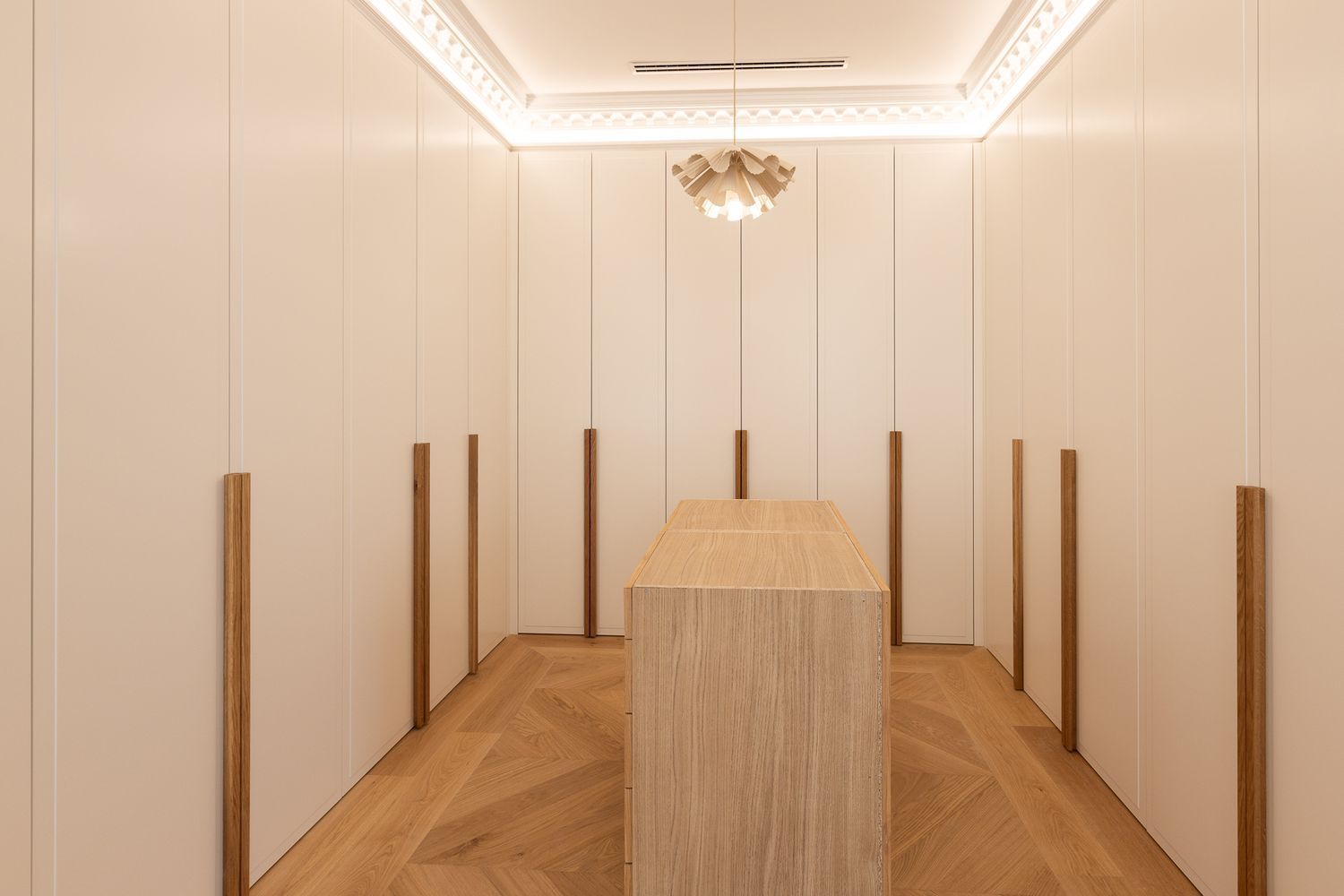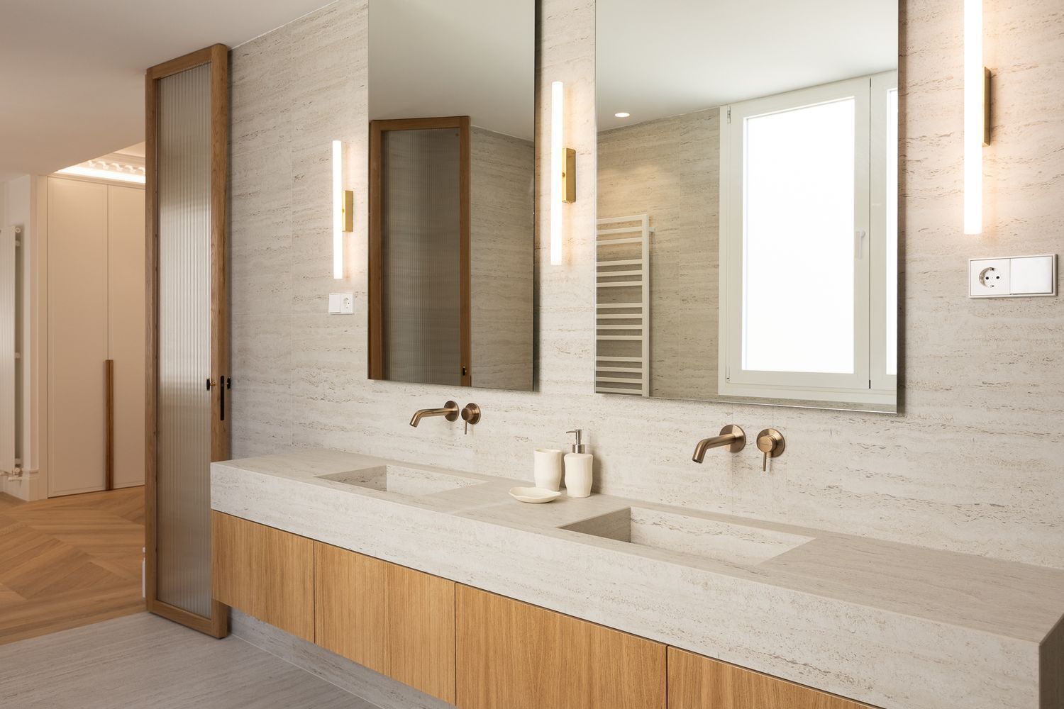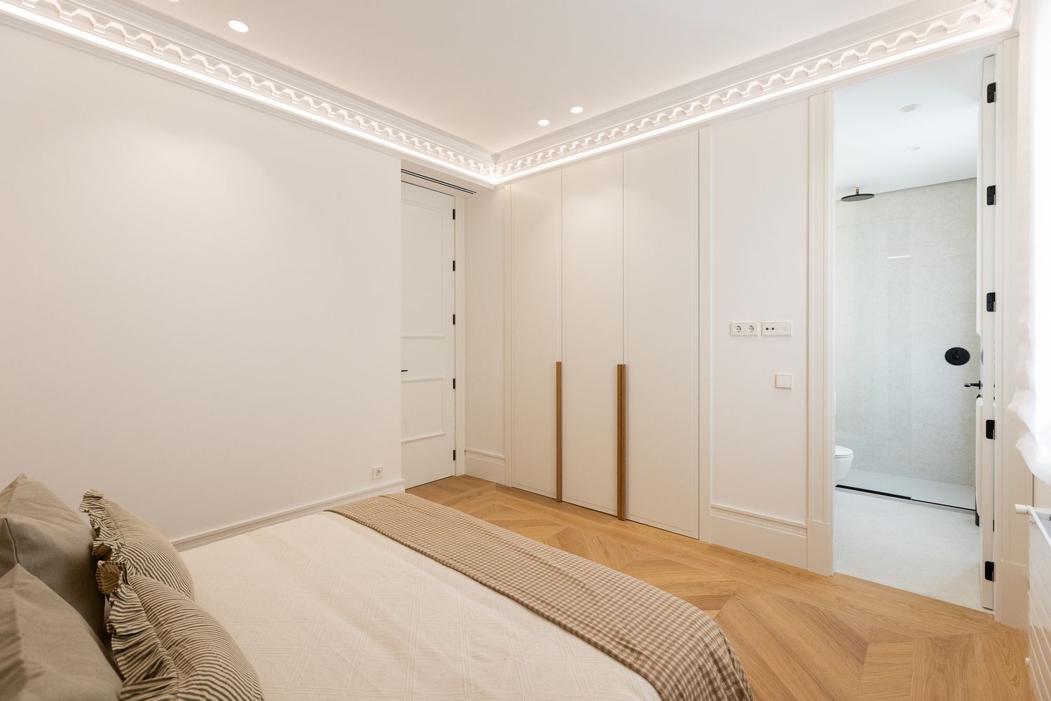 Suelo de roble natural en espiga, un guiño al clasicismo reinterpretado con sofisticación.