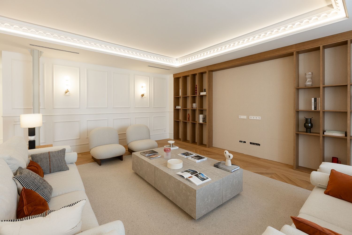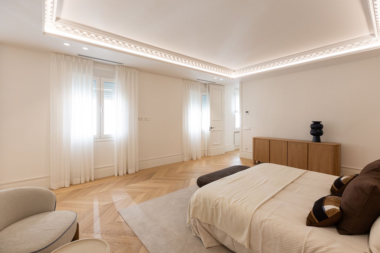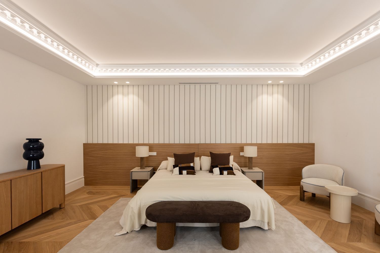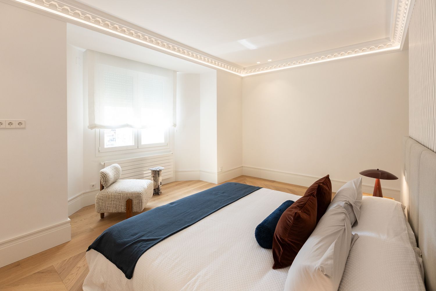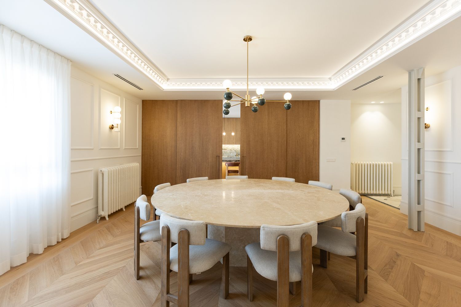 Suelo de roble natural en espiga, un guiño al clasicismo reinterpretado con sofisticación.
