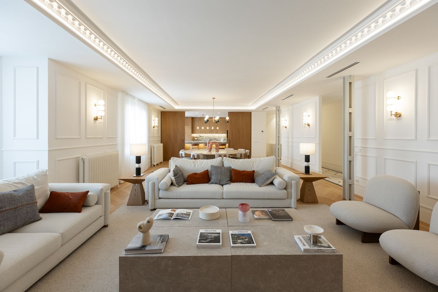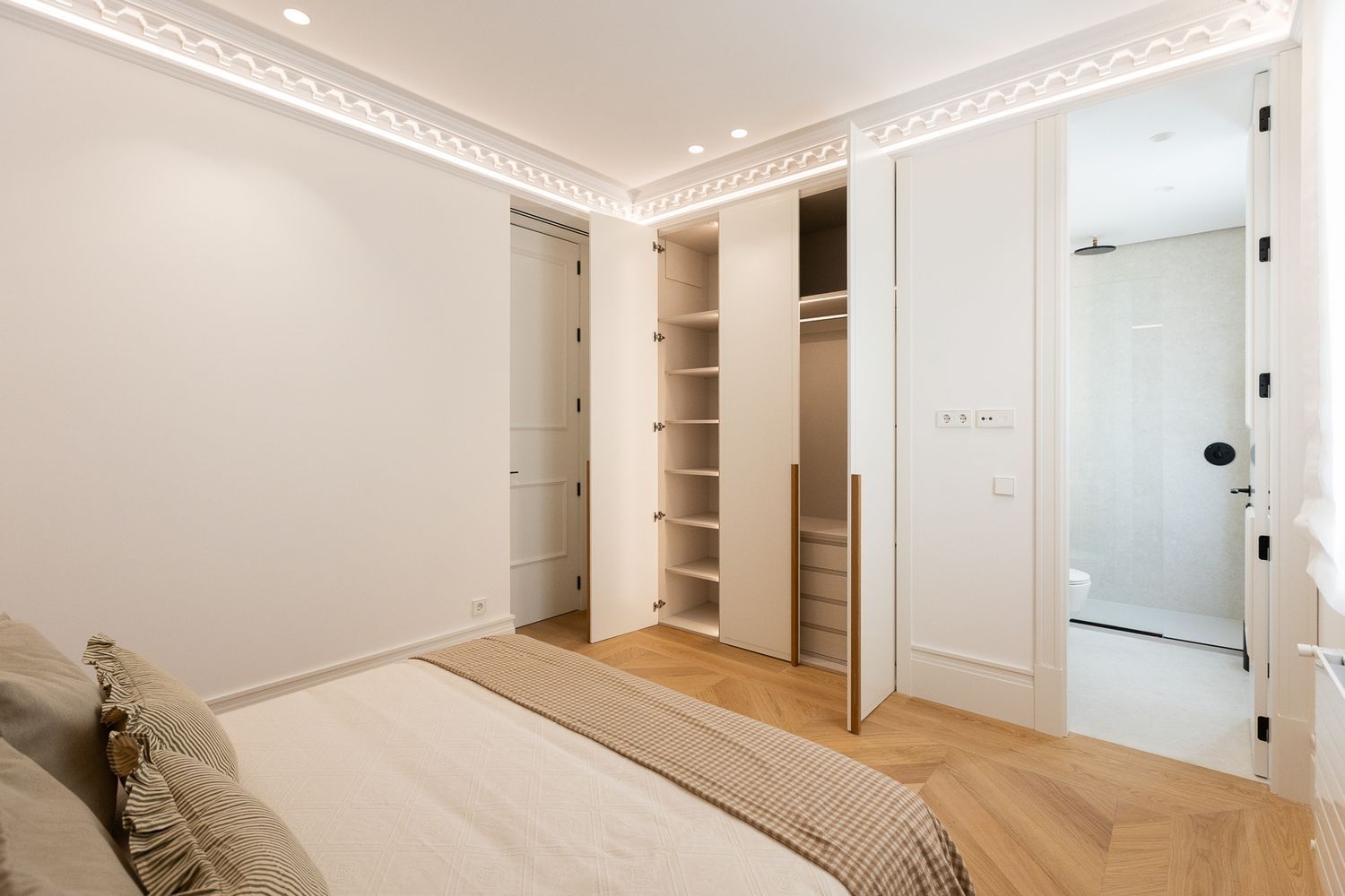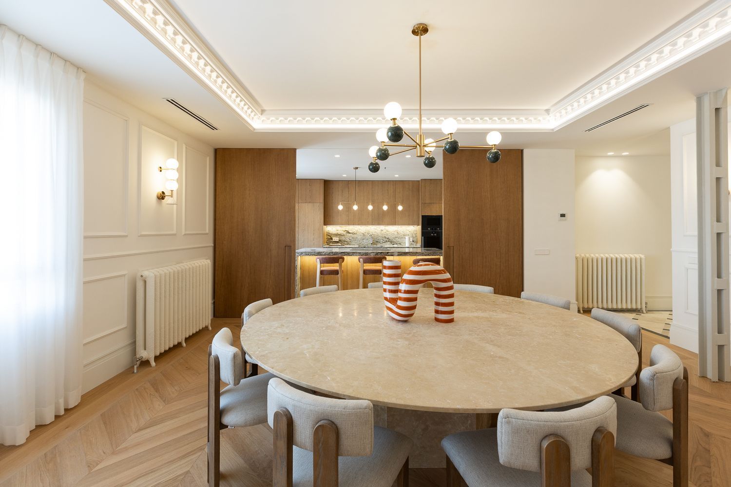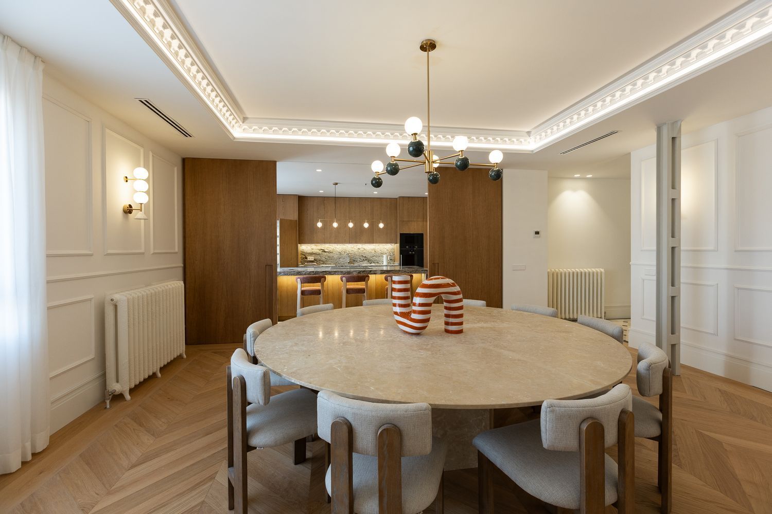 Suelo de roble natural en espiga, un guiño al clasicismo reinterpretado con sofisticación.