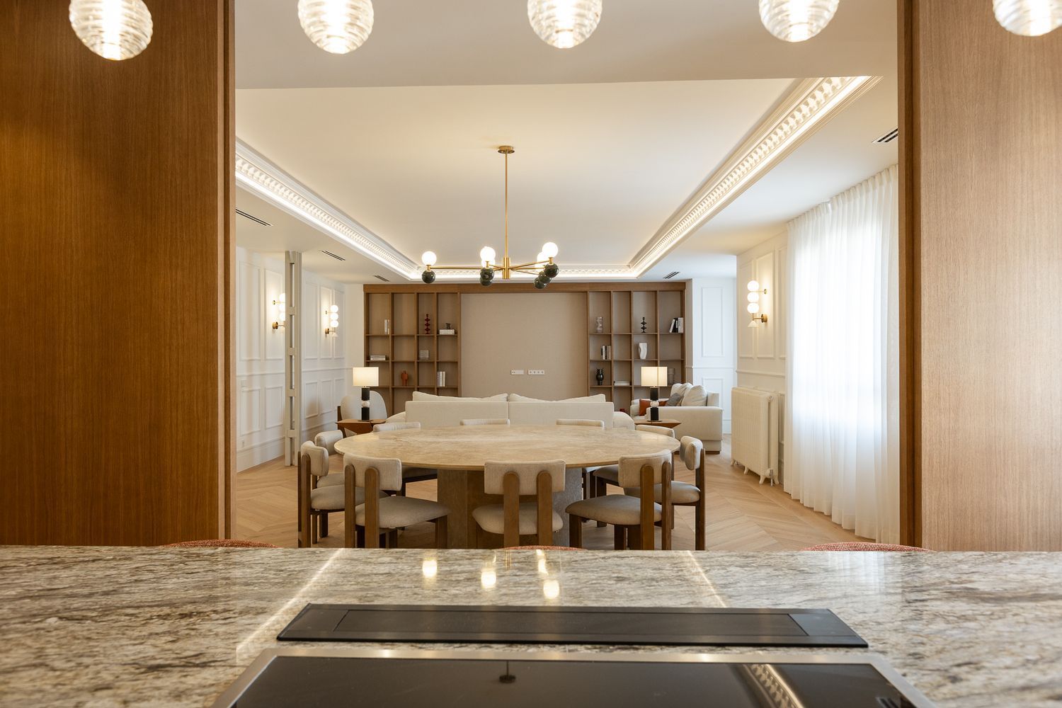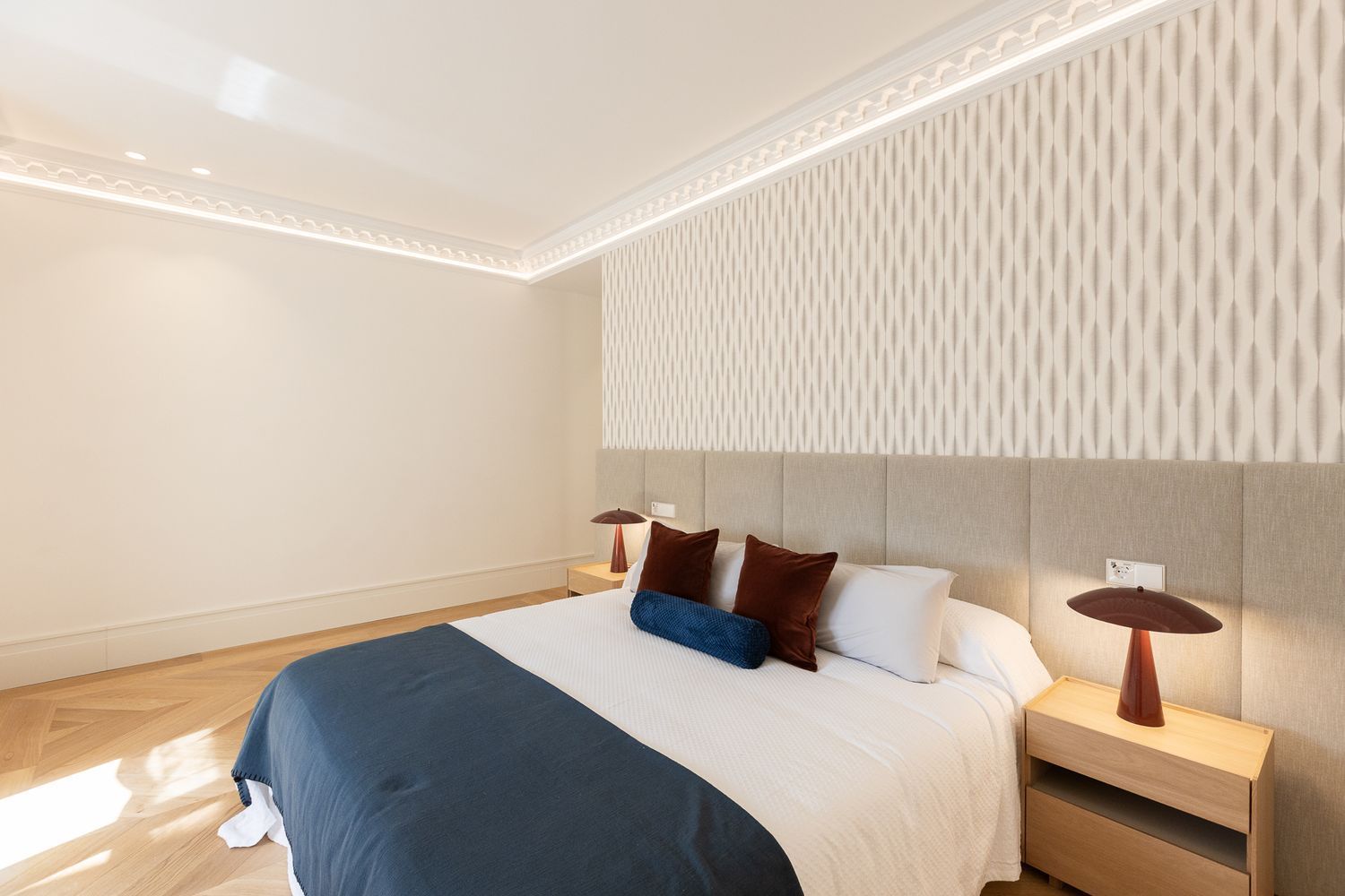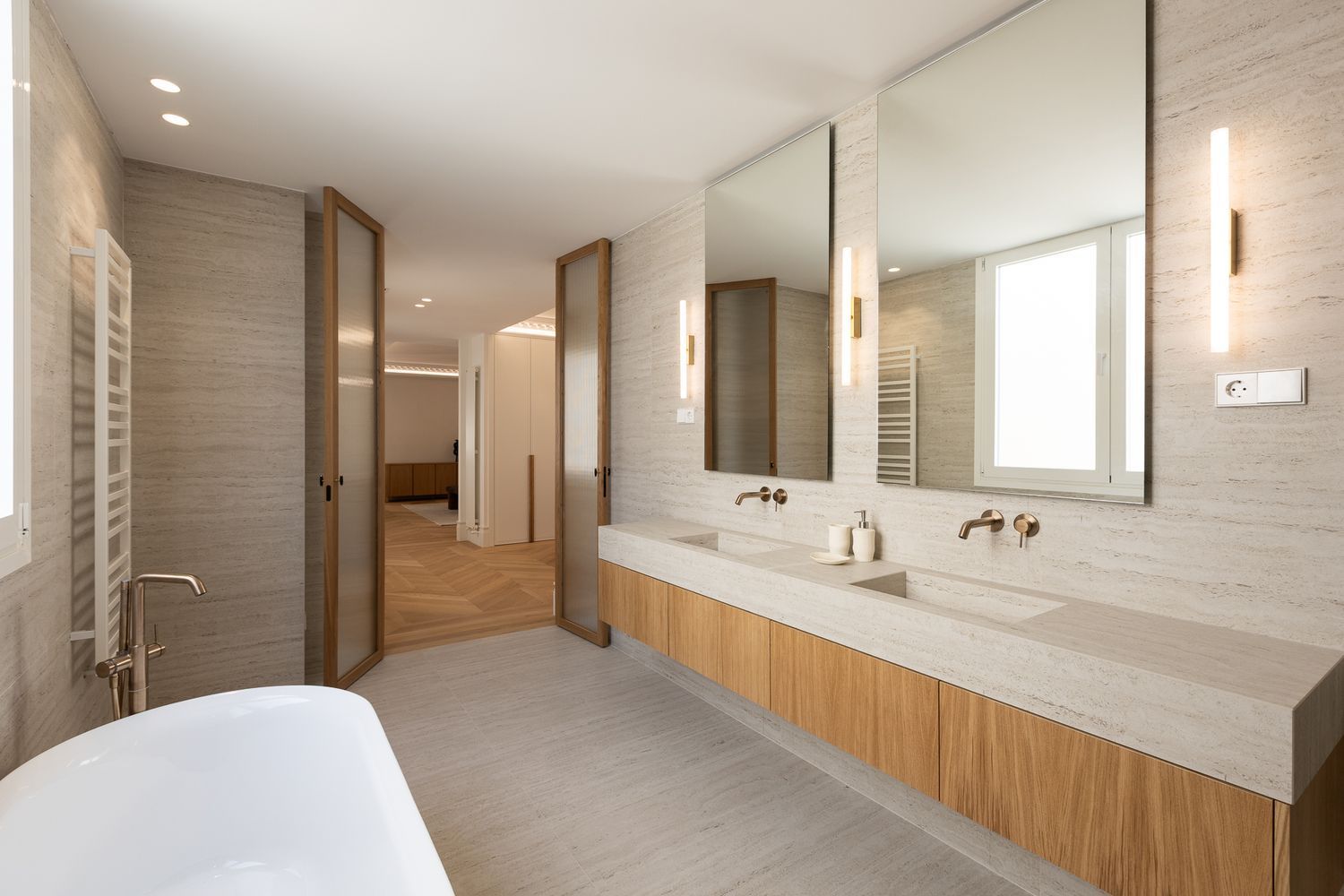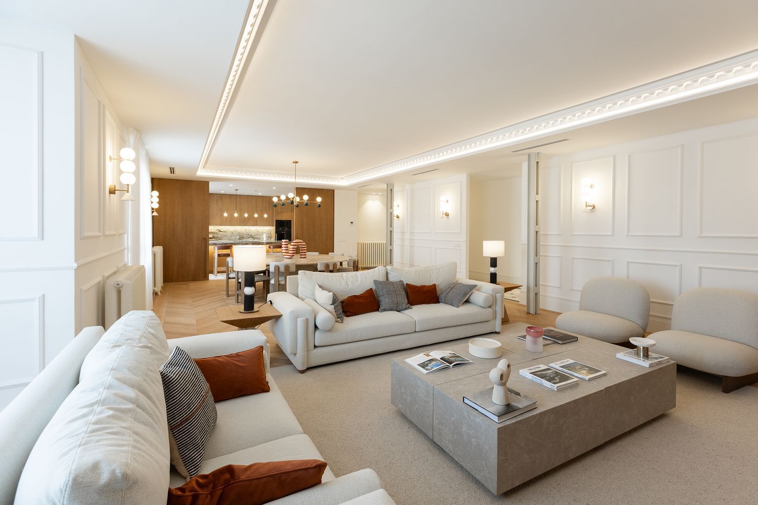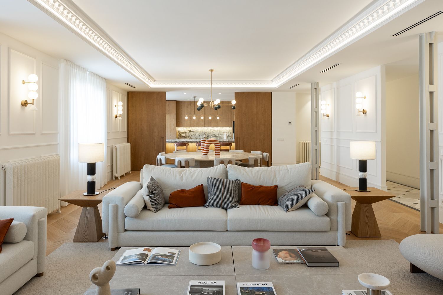 Suelo de roble natural en espiga, un guiño al clasicismo reinterpretado con sofisticación.