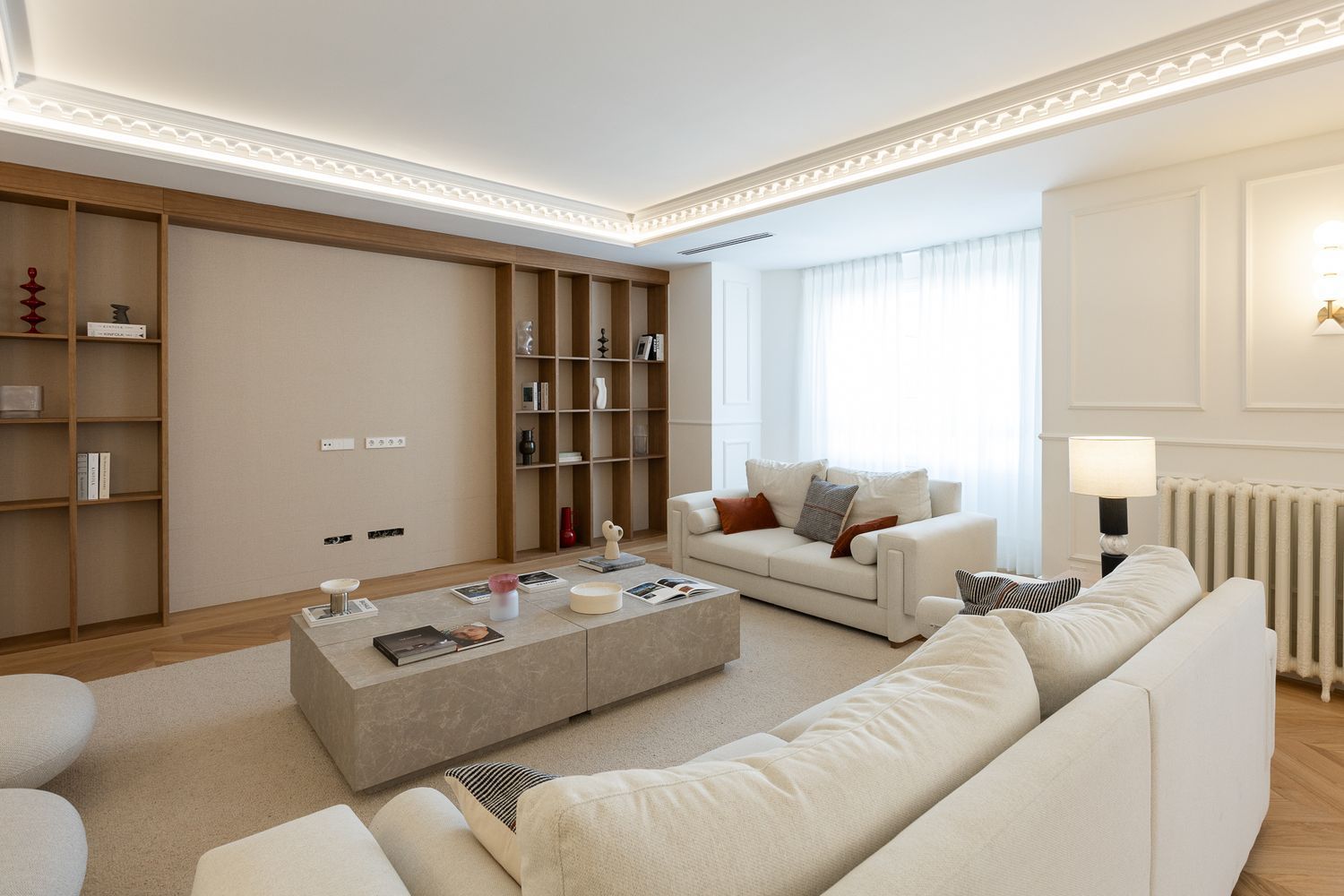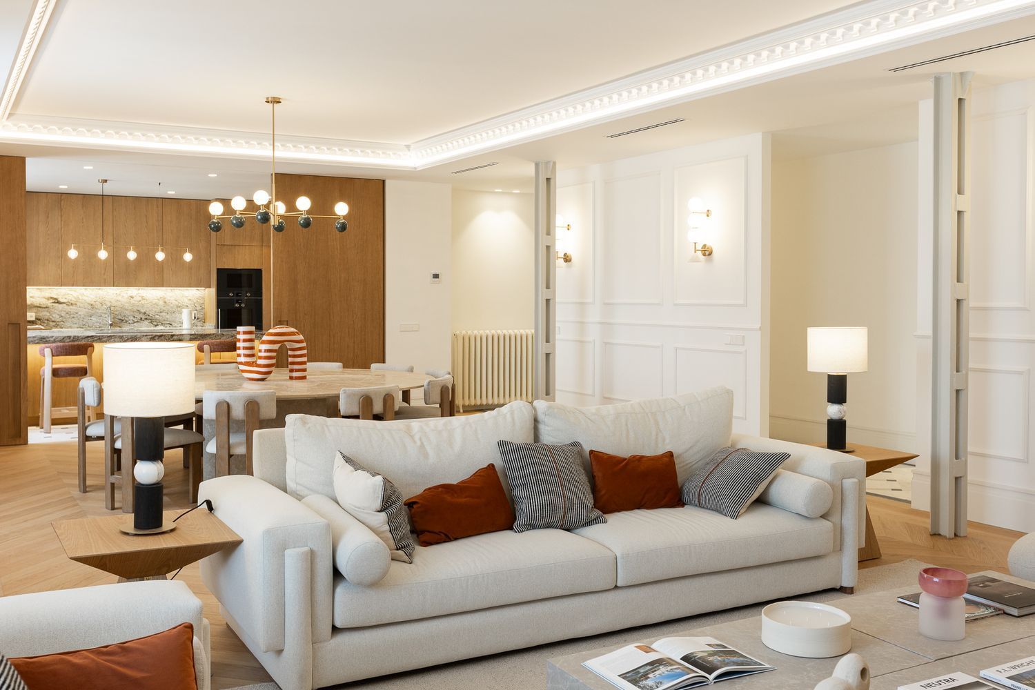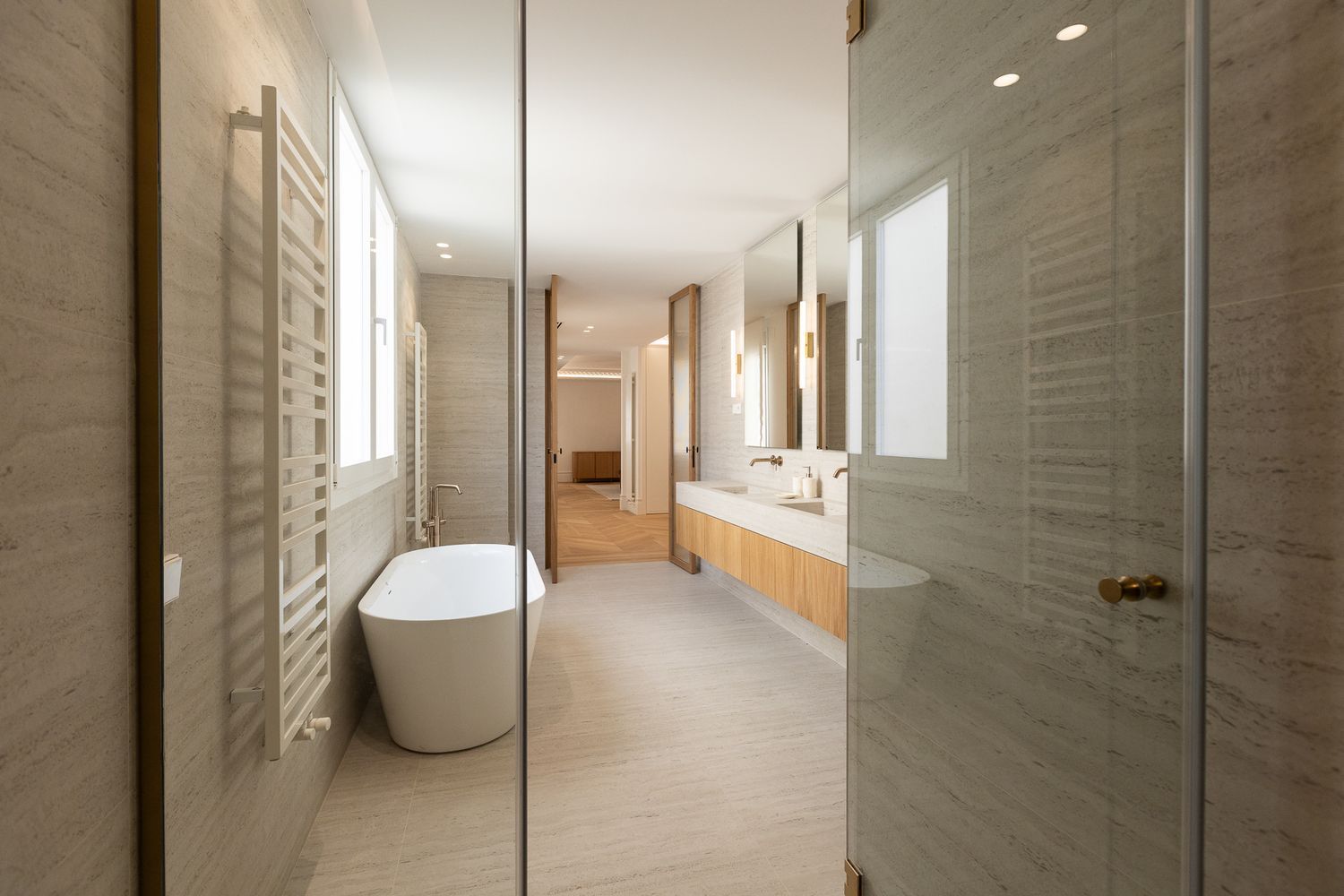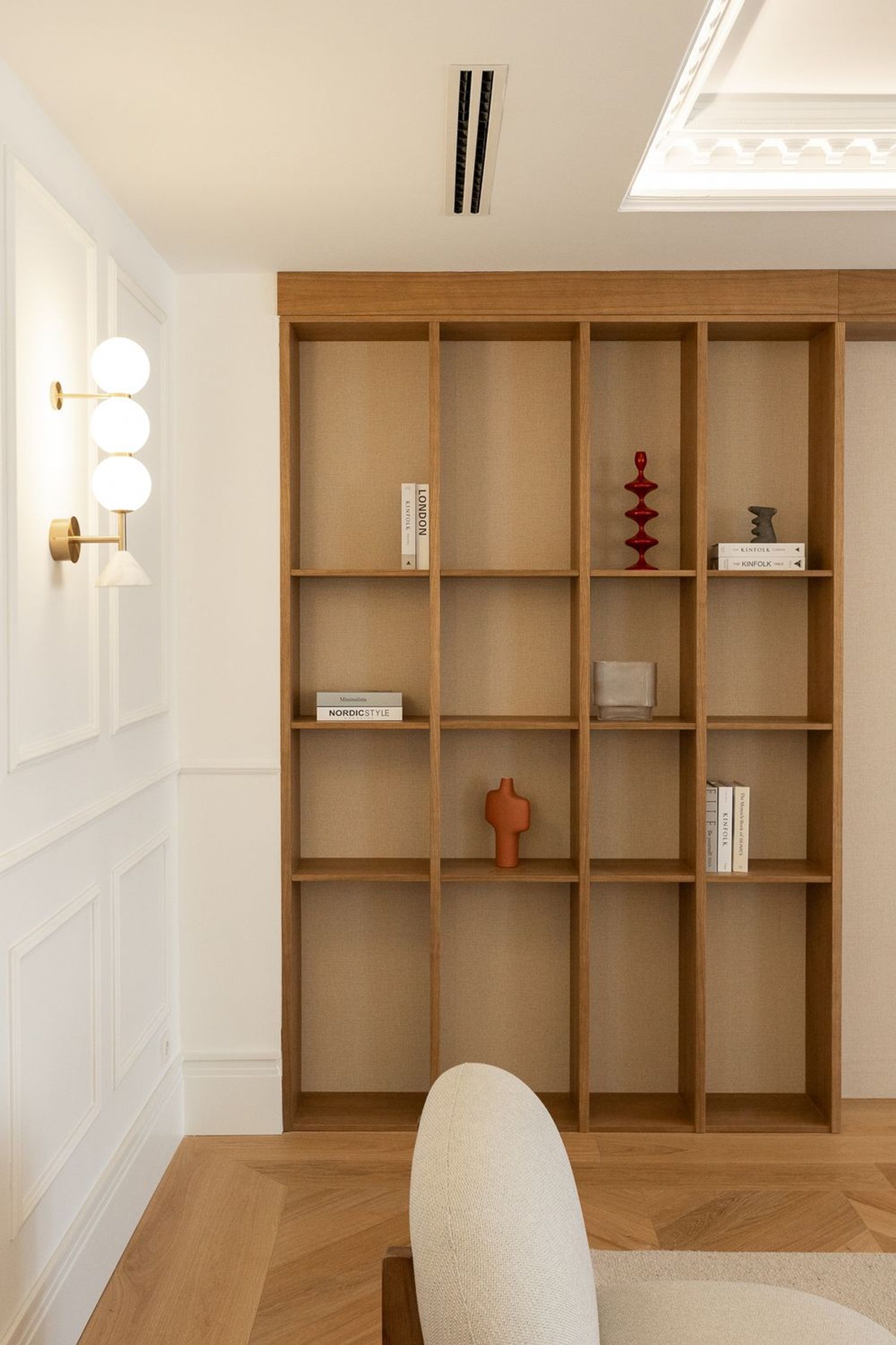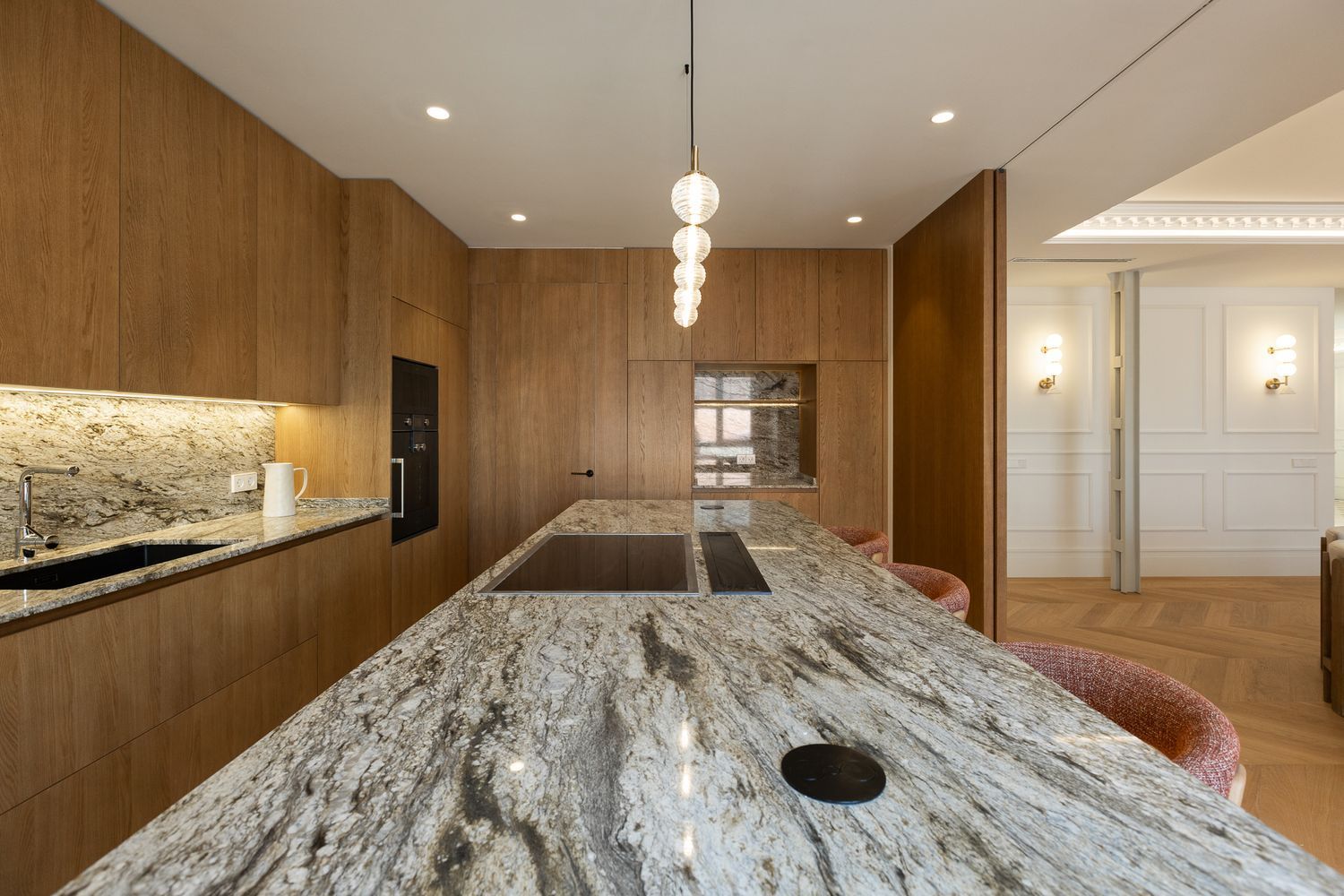 Suelo de roble natural en espiga, un guiño al clasicismo reinterpretado con sofisticación.