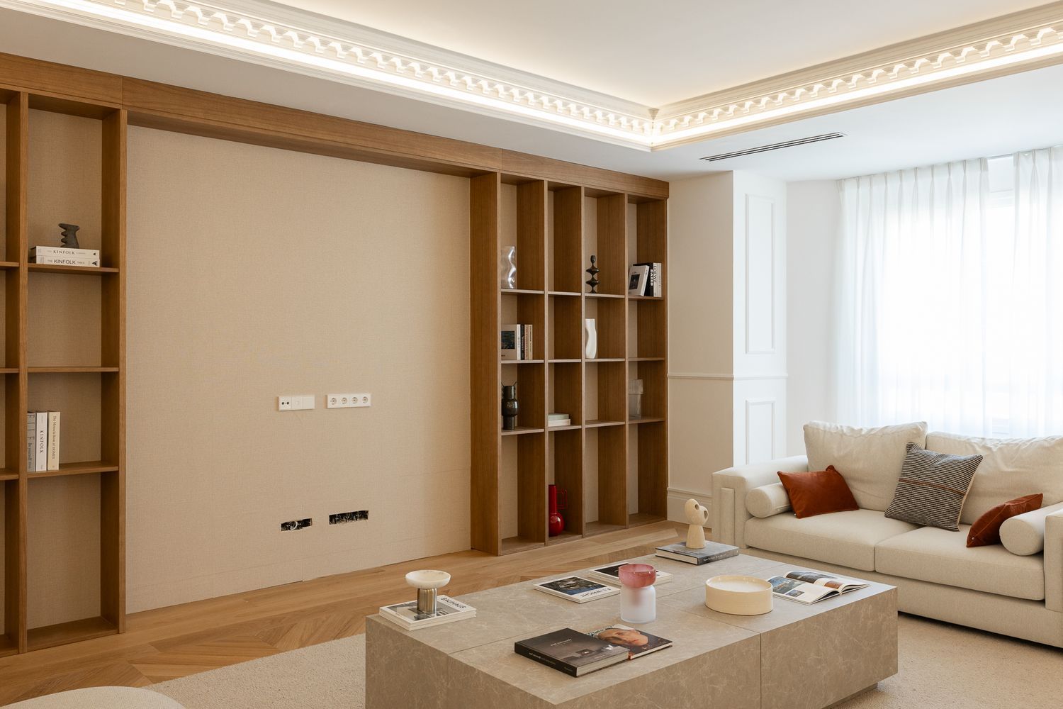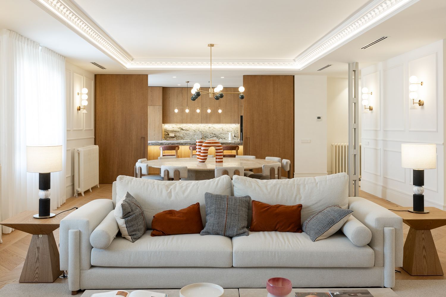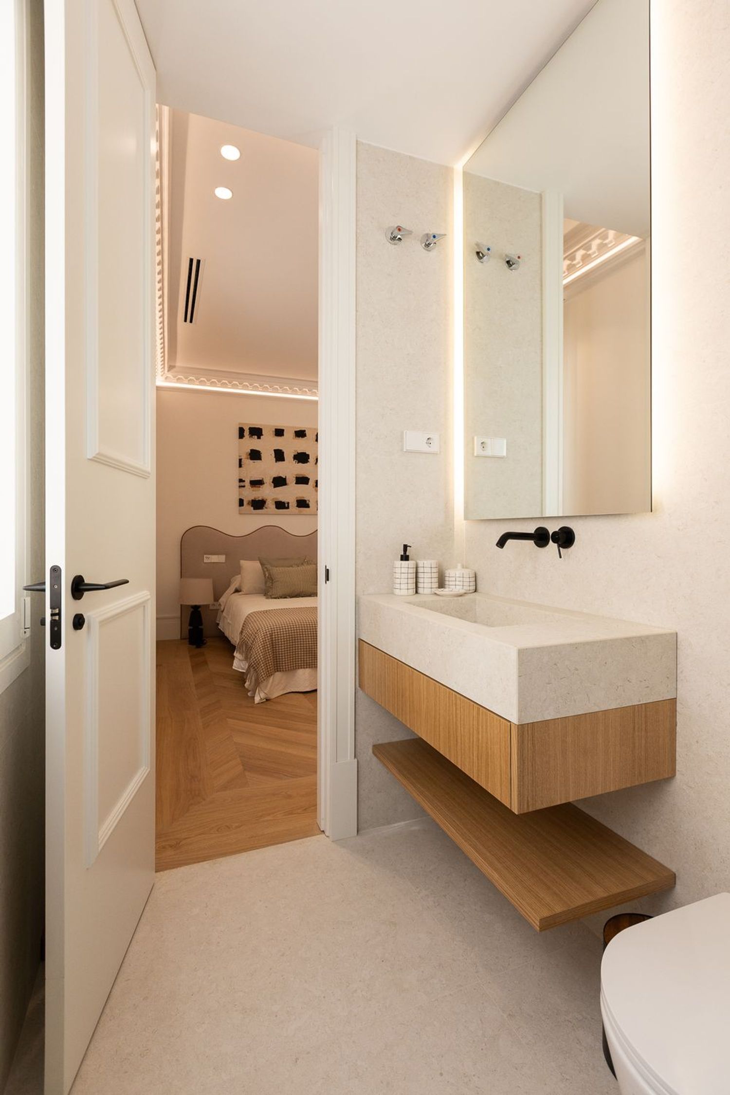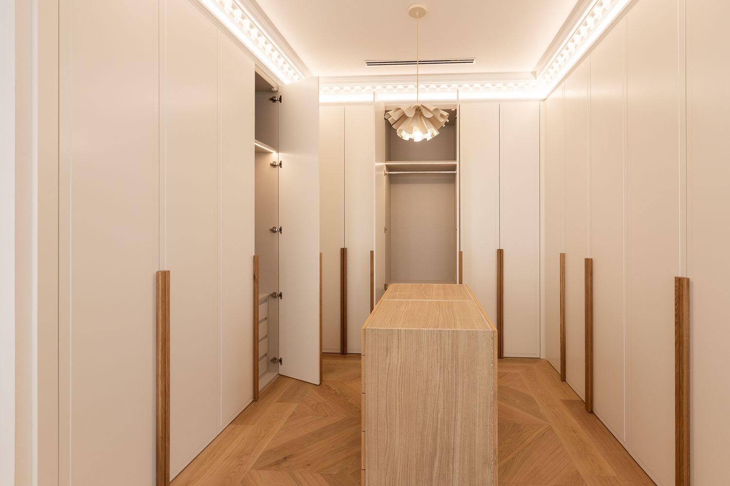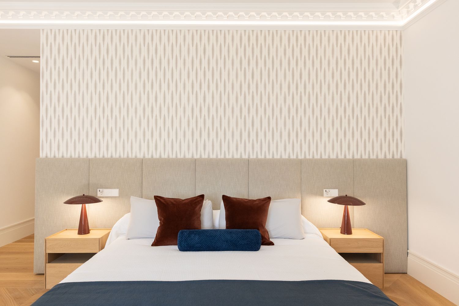 Suelo de roble natural en espiga, un guiño al clasicismo reinterpretado con sofisticación.