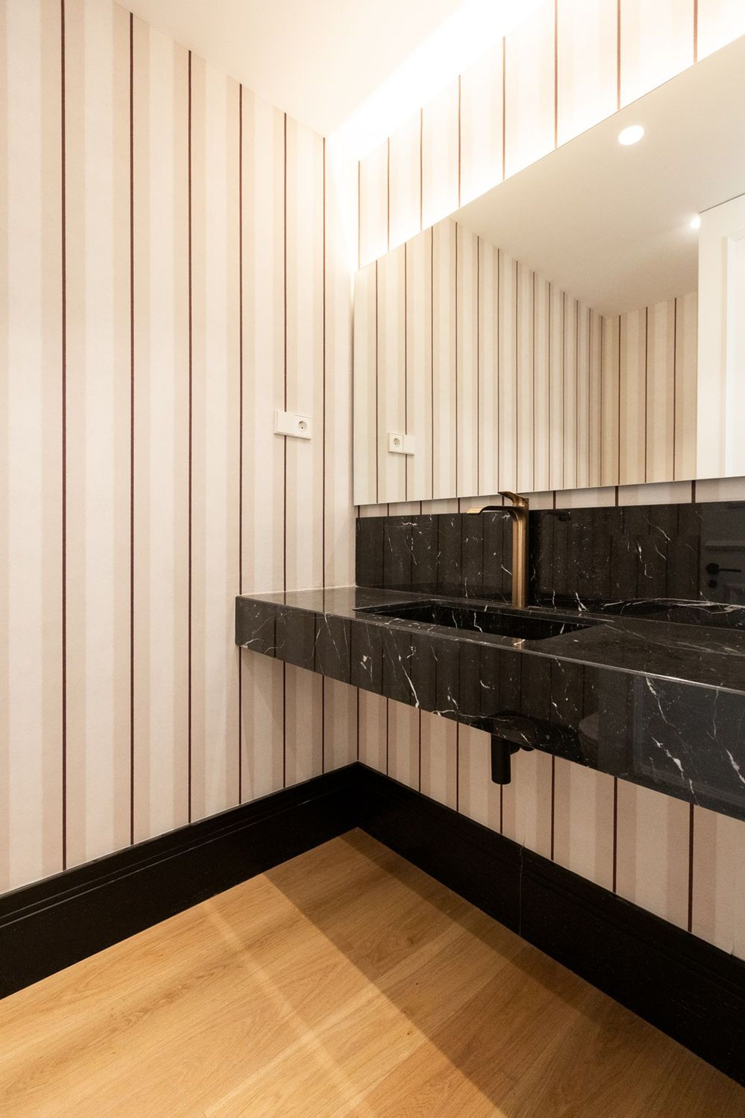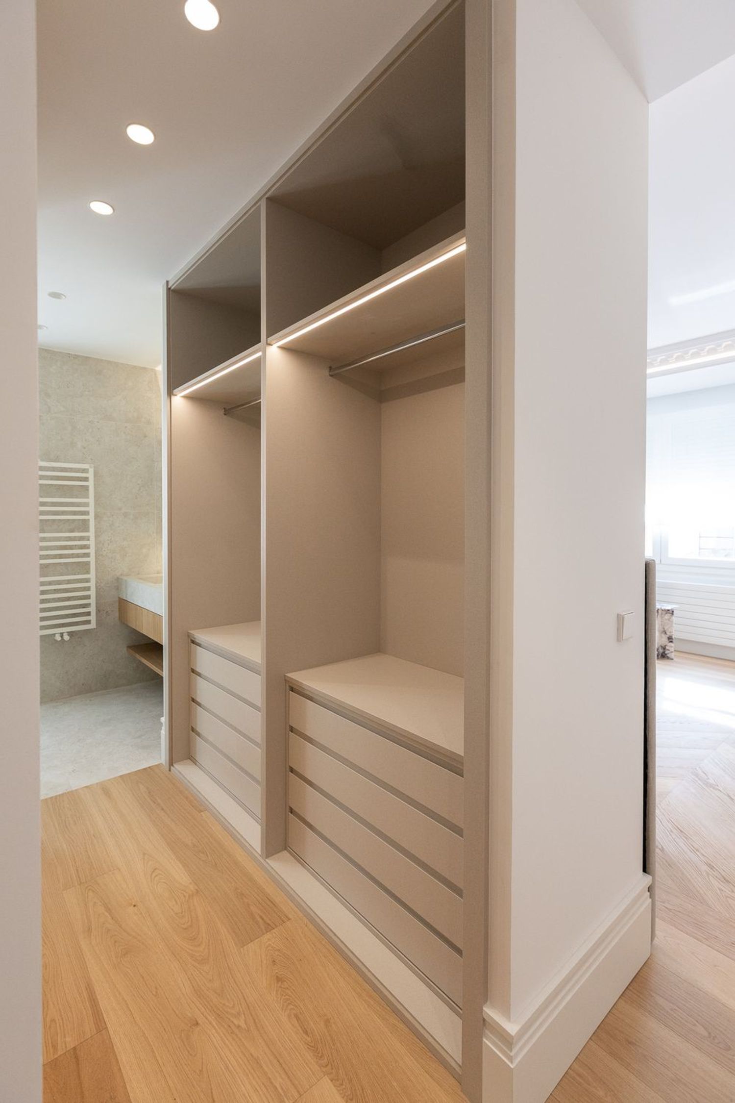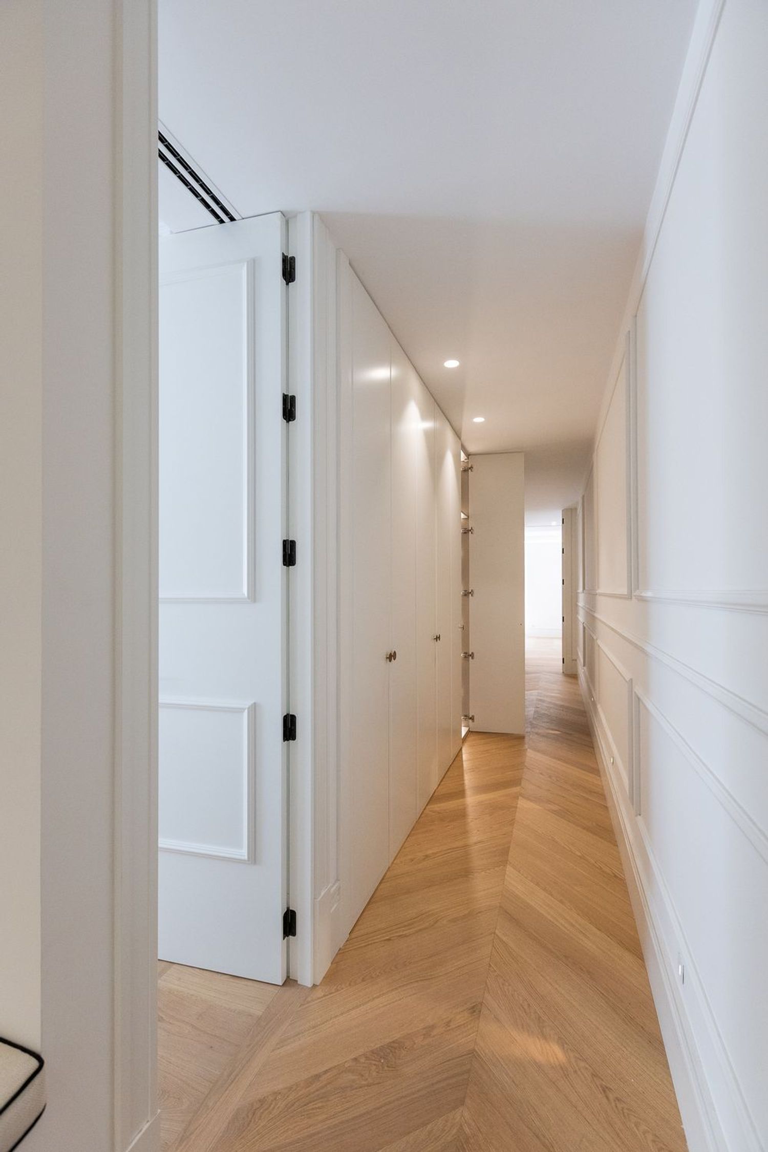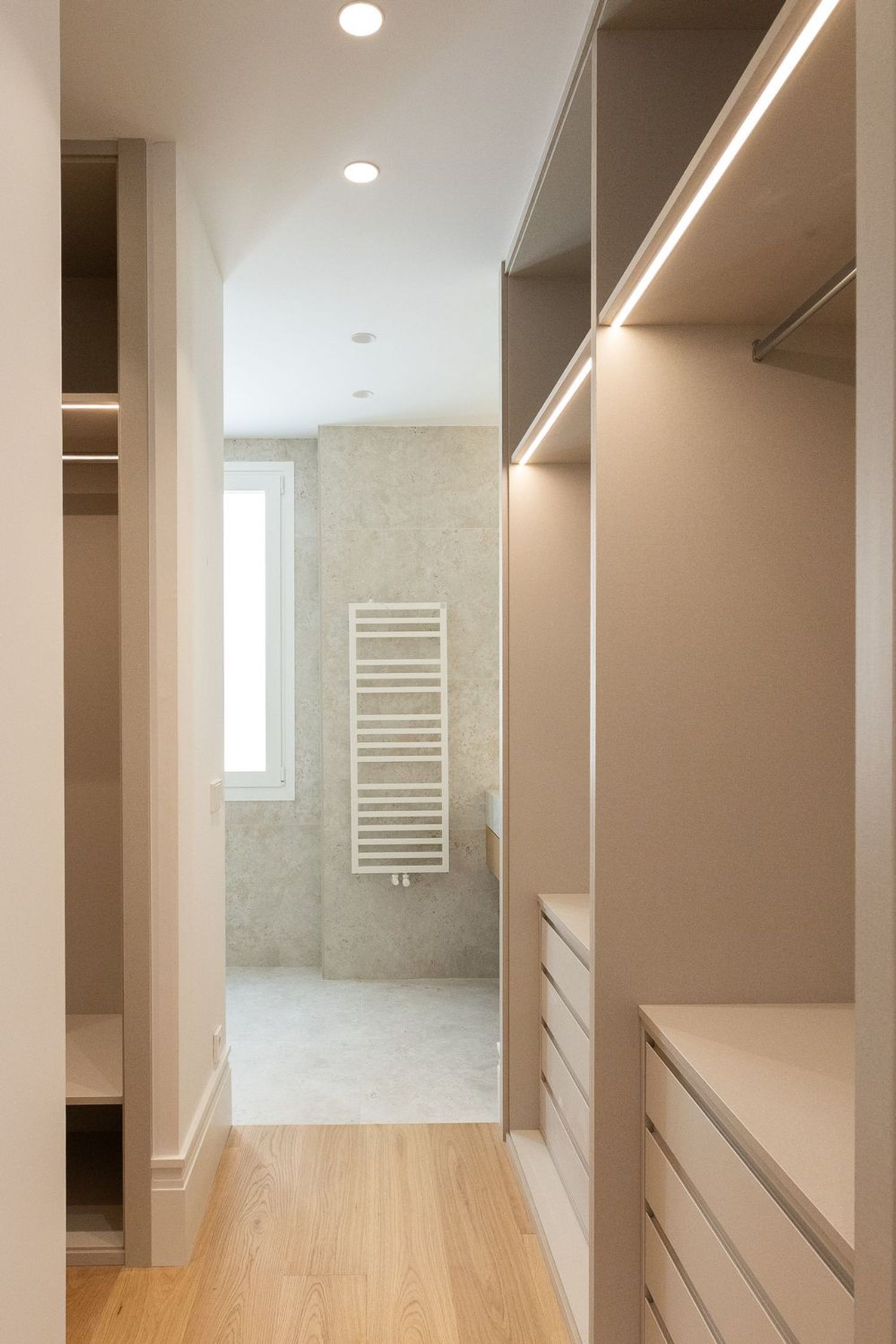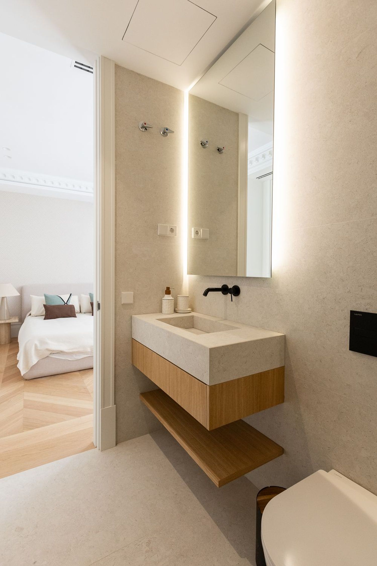 Suelo de roble natural en espiga, un guiño al clasicismo reinterpretado con sofisticación.