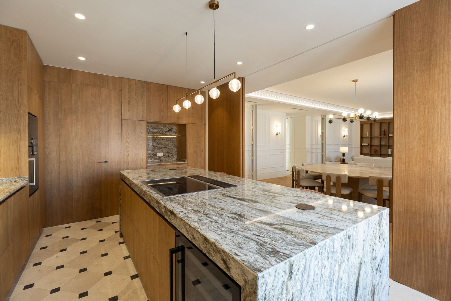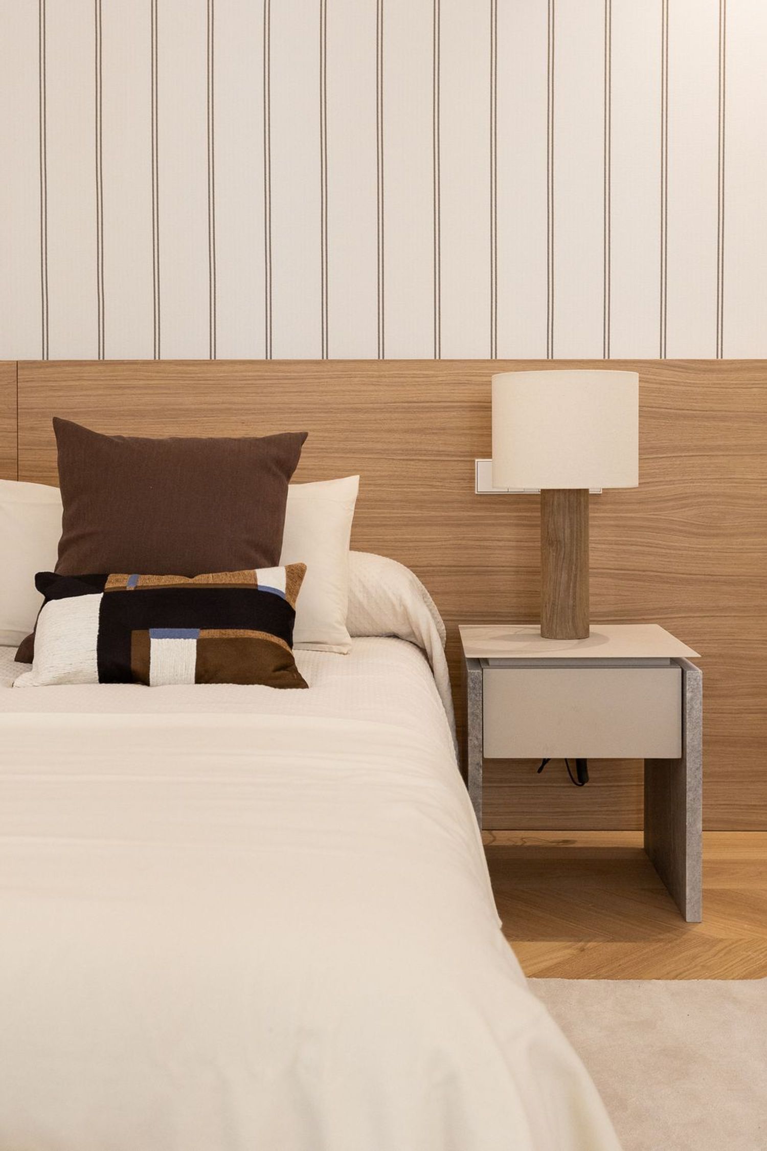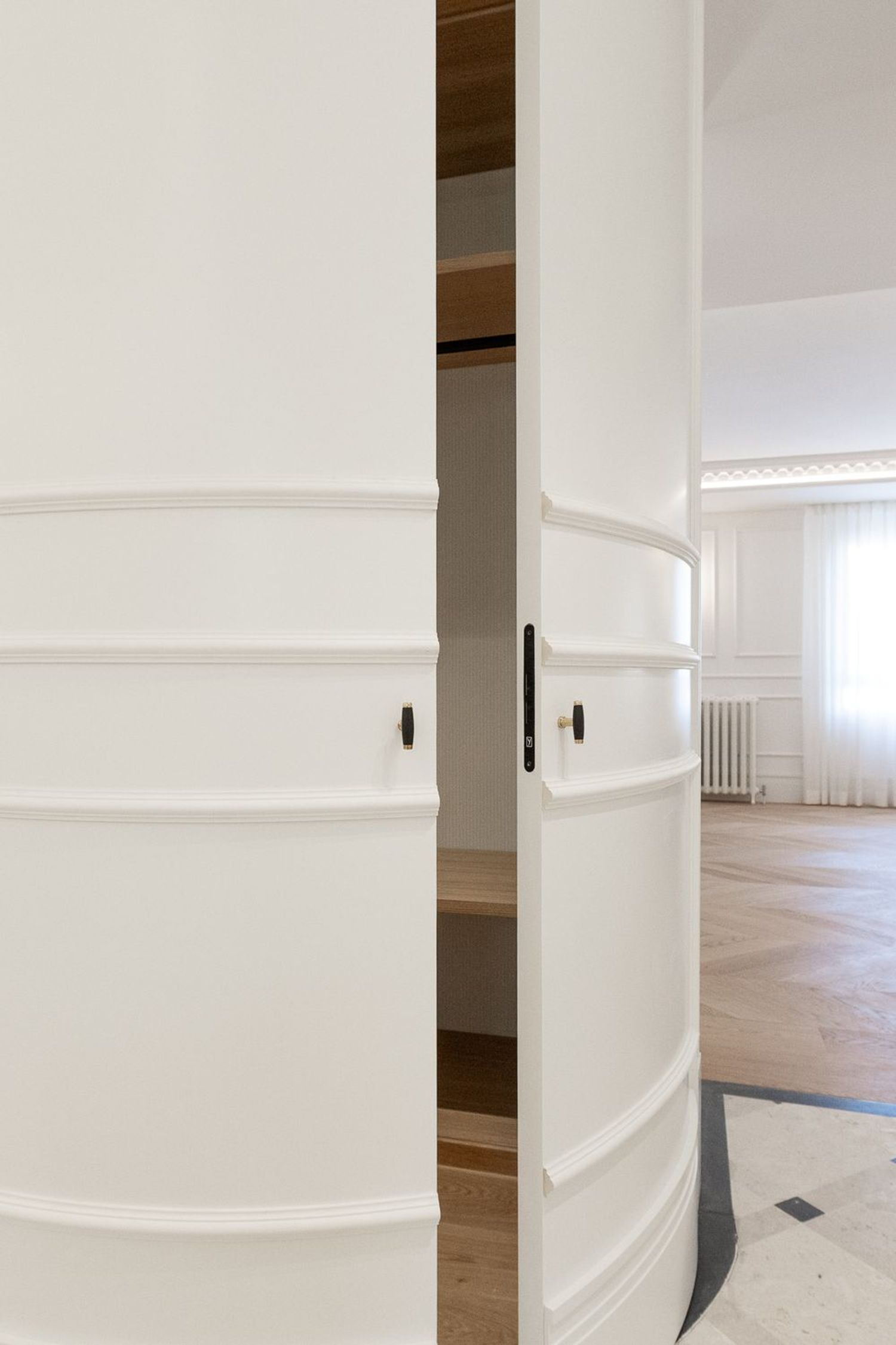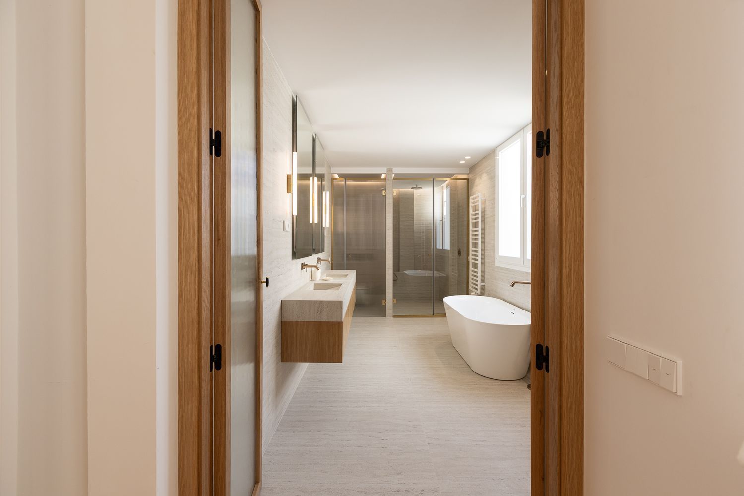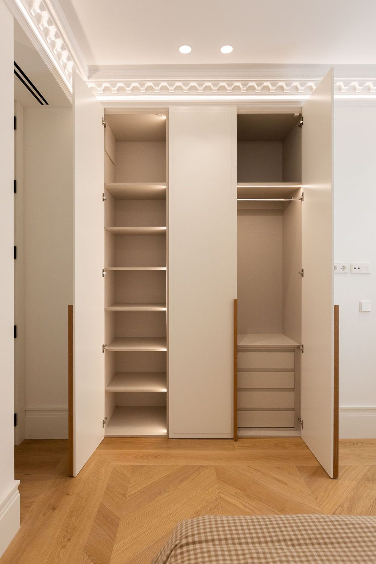 Suelo de roble natural en espiga, un guiño al clasicismo reinterpretado con sofisticación.
