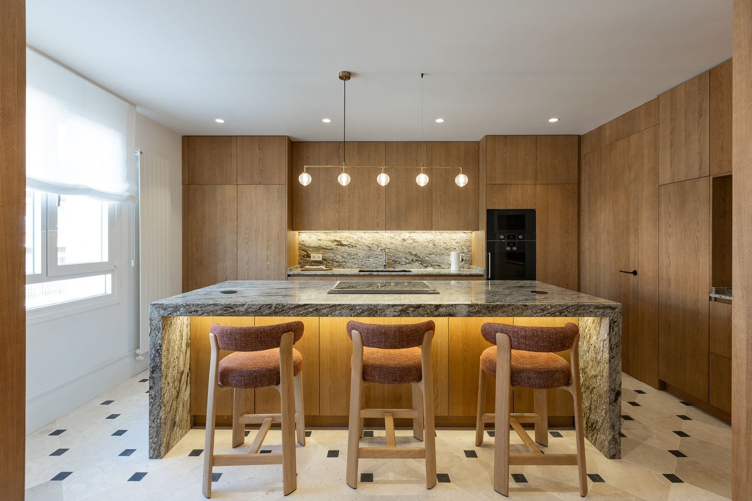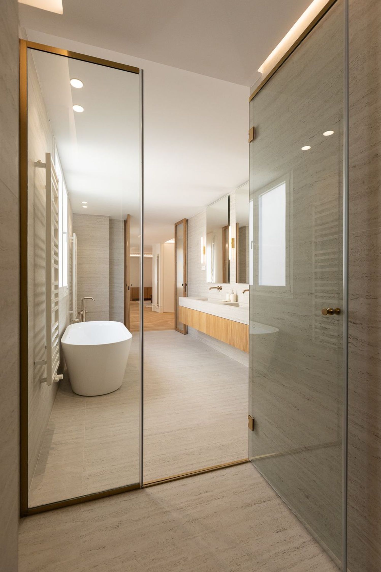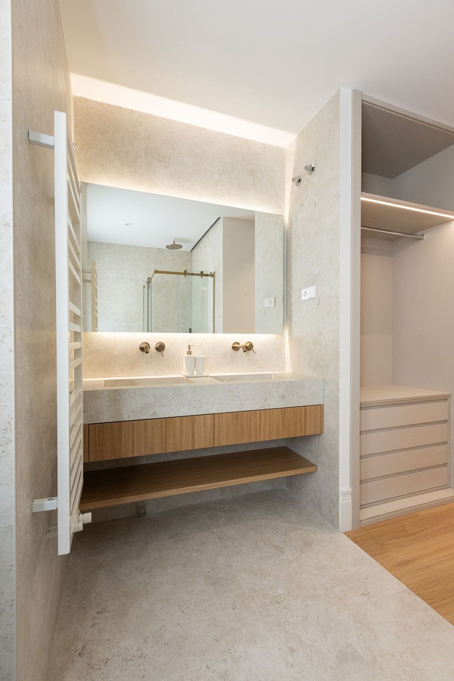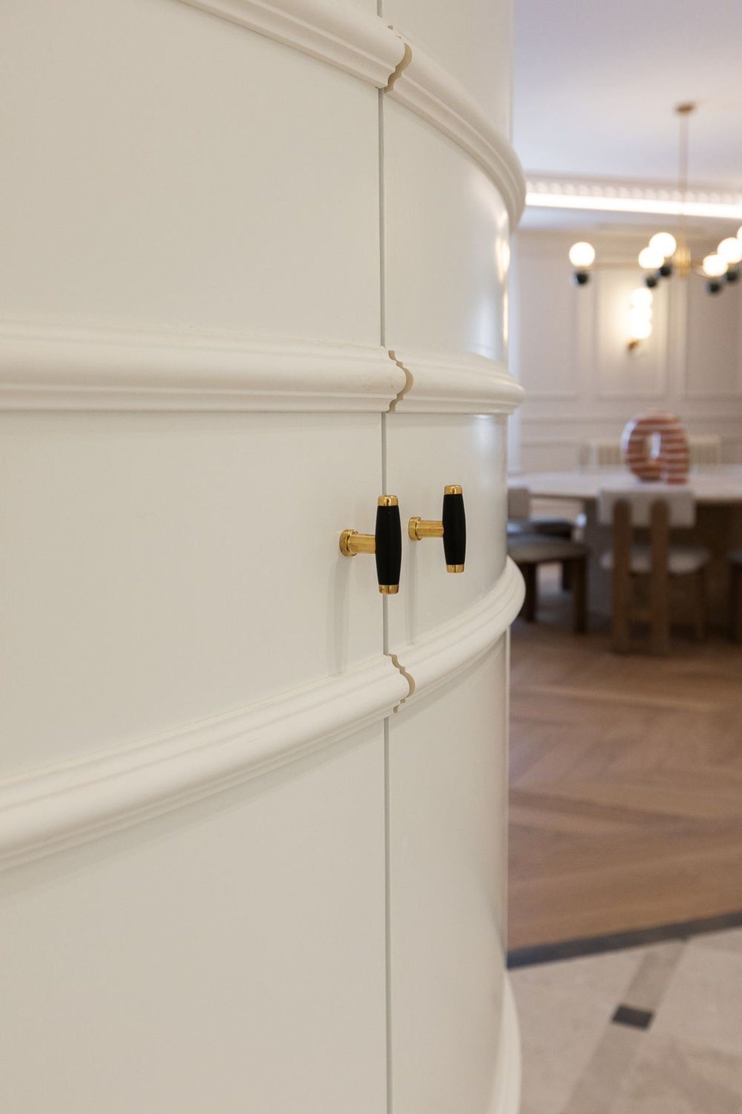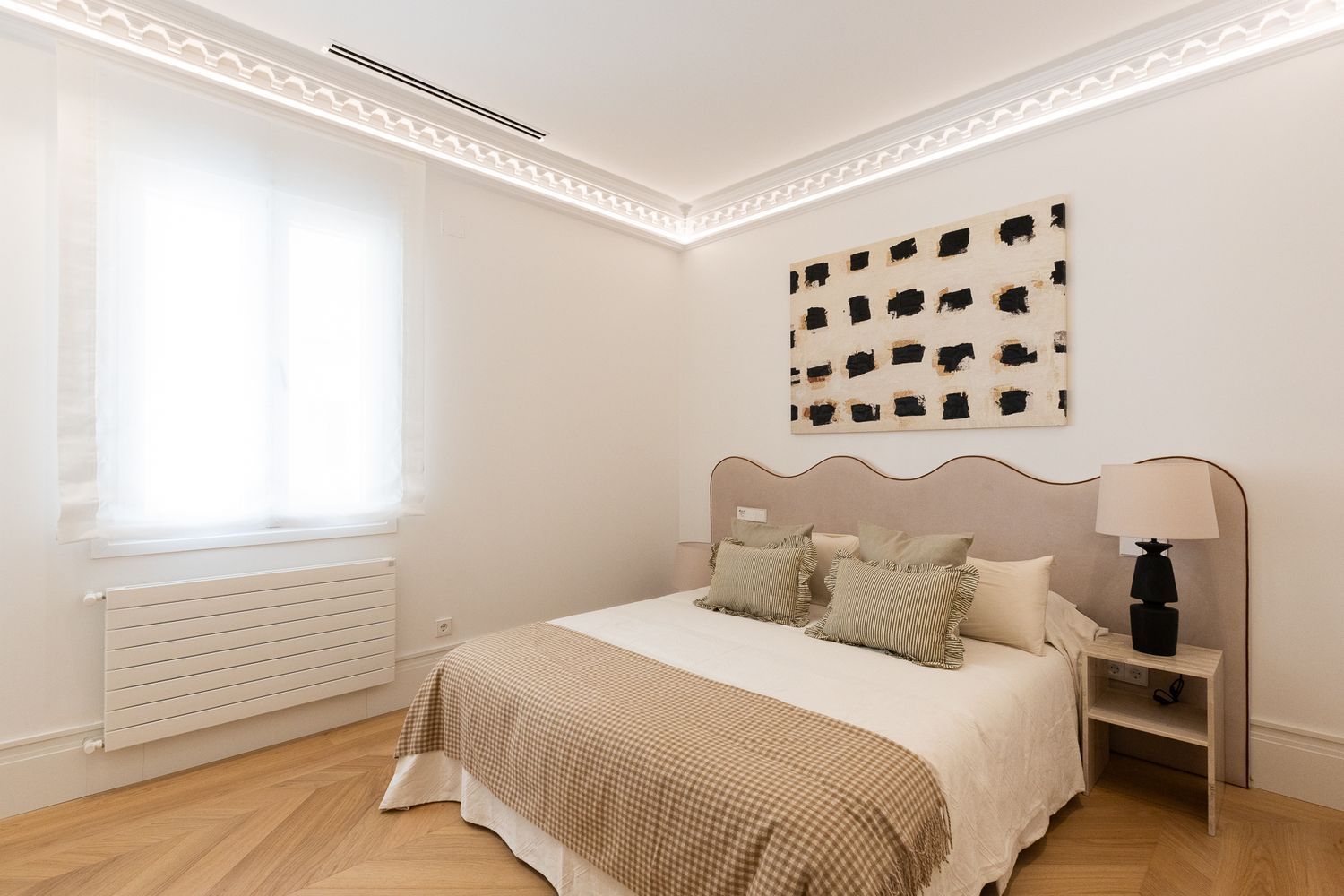 Suelo de roble natural en espiga, un guiño al clasicismo reinterpretado con sofisticación.